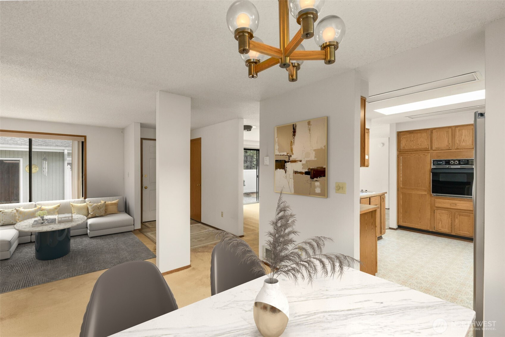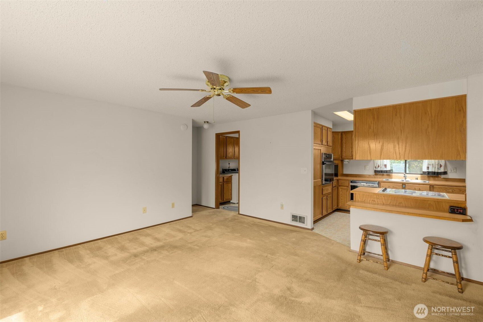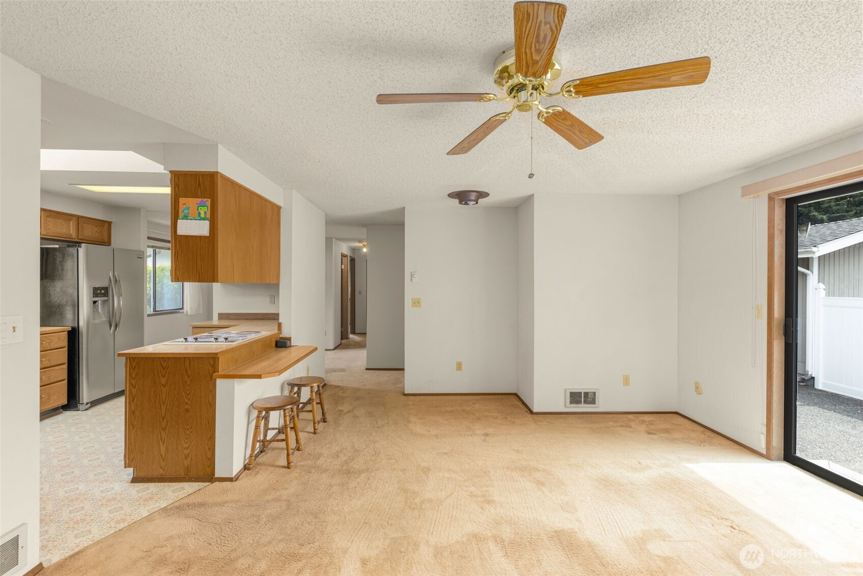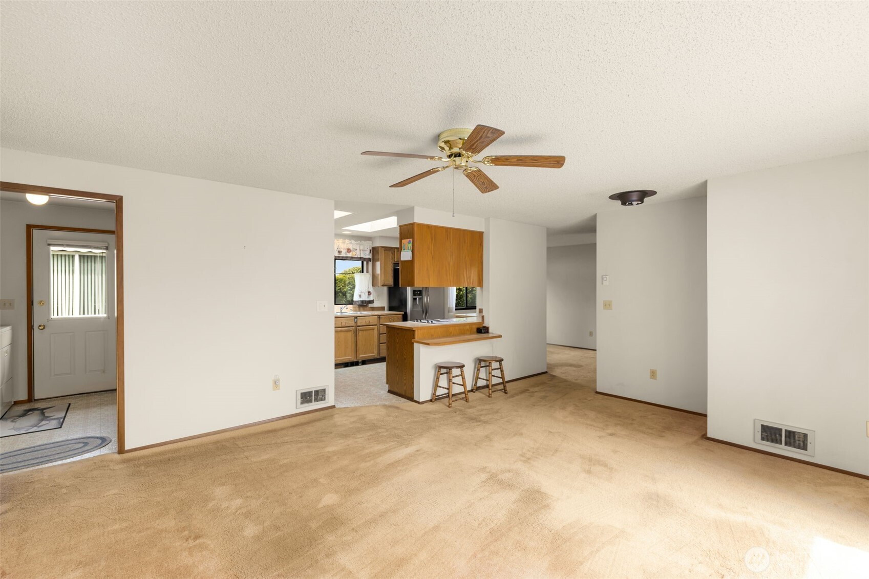 Welcome to Wandering Creek. A desirable gated 55+ community in Bothell. This well-cared-for 3-bedroom, 2-bath modular home offers 1,440 square feet of comfortable, one-level living with both a living room and family room. The kitchen features an eating bar, and the primary suite includes an ensuite bath. Outside, enjoy a spacious patio with new fencing, easy-maintenance landscaping, and views overlooking HOA green space. A tiered retaining wall offers gardening potential, while a fenced area discreetly stores grills and bins. A side ramp provides easy access now and flexibility for the future. The oversized garage accommodates two cars in tandem, a dedicated RV space with Sewer/water available in corner by window, workshop space, plus an attached carport. Community amenities include a clubhouse, lake, and walking trails — ideal for an active, low-maintenance lifestyle.