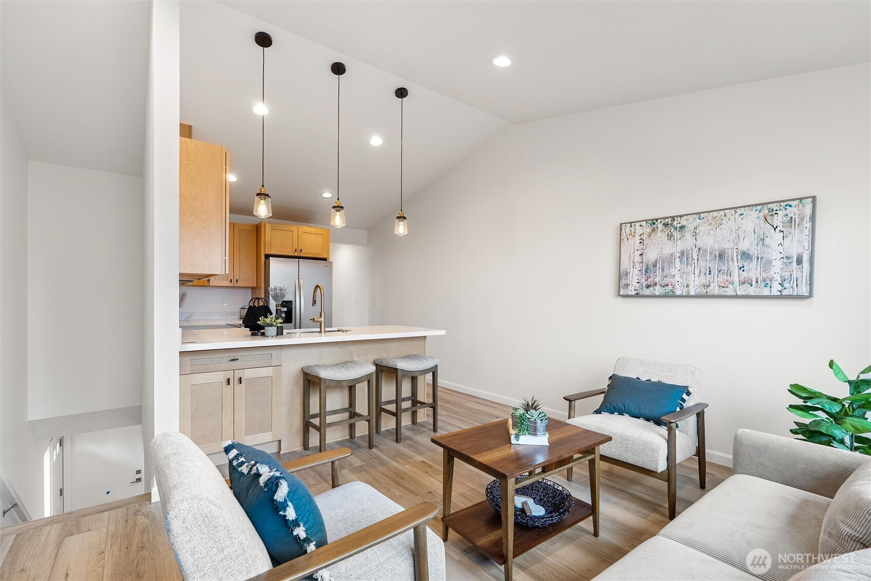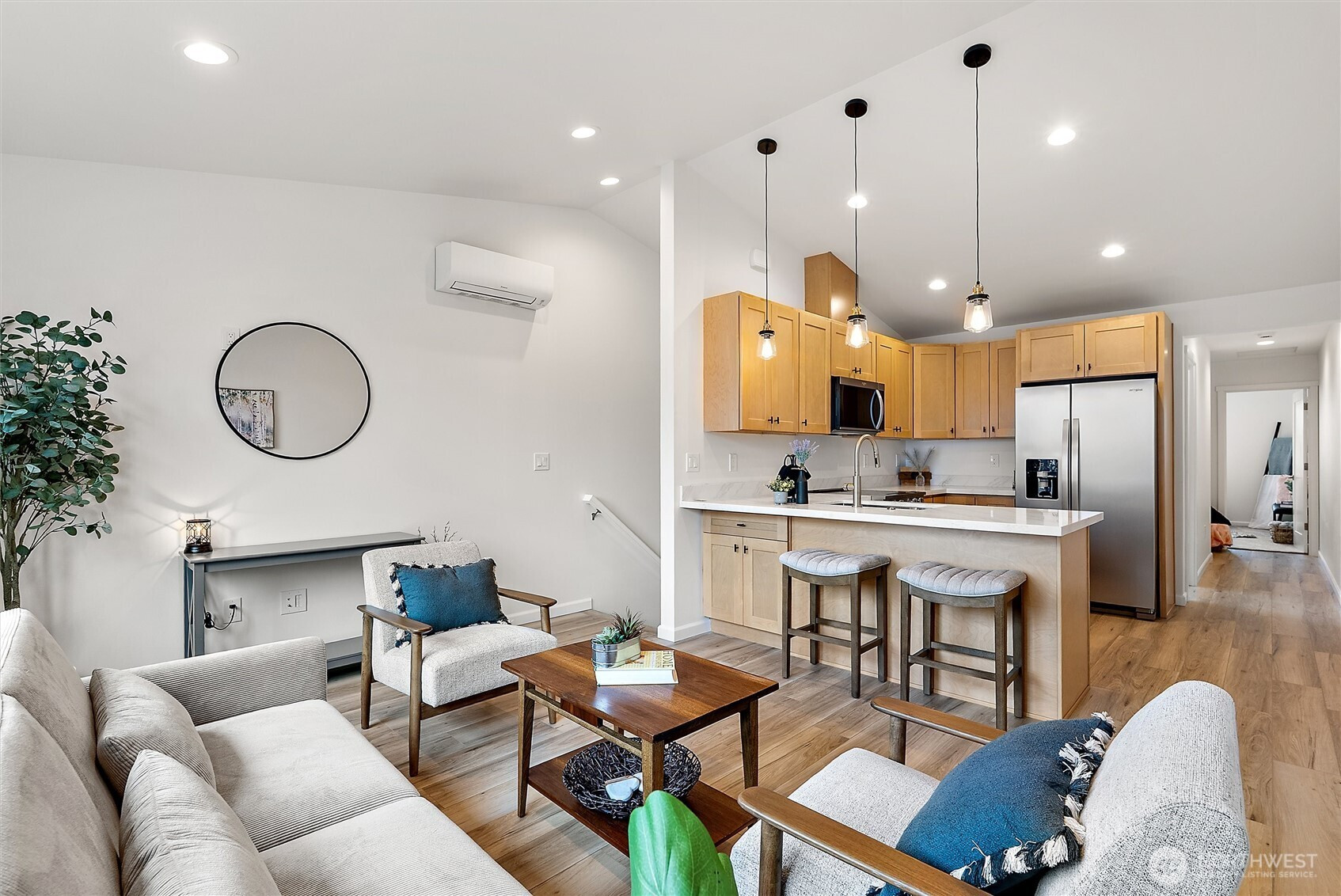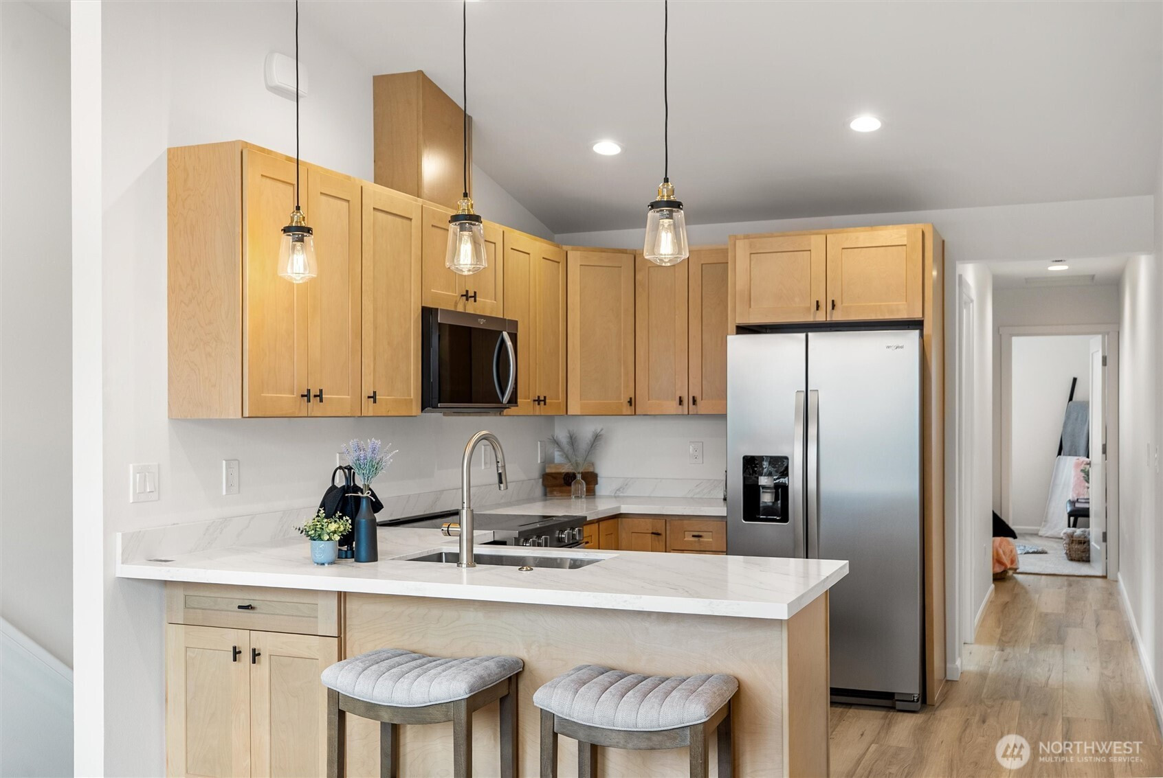 Brand-new construction condo loaded with thoughtful upgrades! This just under 1,000 sq ft home offers 3 bedrooms and 2 full baths, plus a rare oversized single-car garage (over 20’ deep and 15’ wide) so you can comfortably park and still open your doors. Includes a 220 EV outlet and direct access into the home—something most condos don’t offer. Enjoy added privacy with your own patio, screened by a new 8-ft fence, and enhanced soundproofing with upgraded double-wall construction. Interior features include quartz counters in kitchen and baths, upgraded lighting and extra storage including under-stair space. All kitchen cabinets are solid wood and soft close. All appliances are included, washer, dryer, refrigerator, range, microwave, dishwasher, disposal, and garage door opener. Nestled in a peaceful neighborhood and with incredibly low HOA dues under $10/month.