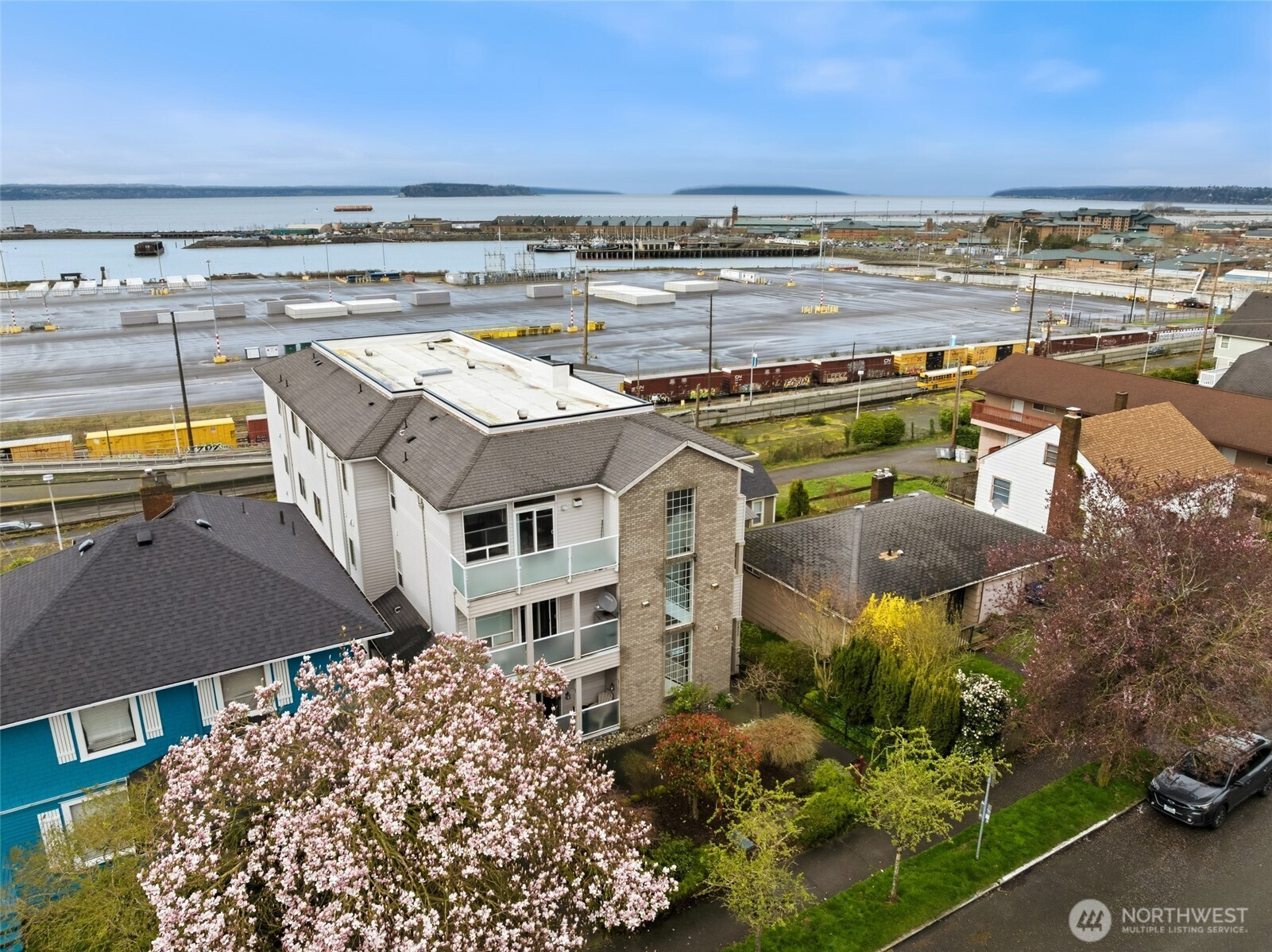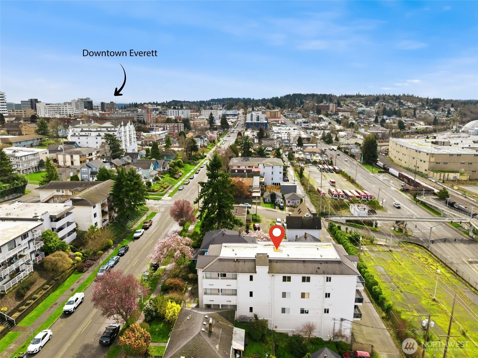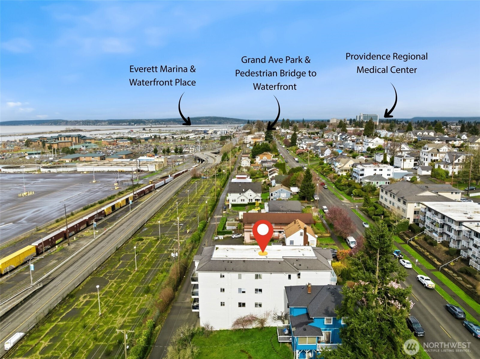 Perched on the top floor, this northwest corner 2-bedroom, 2-bath condo holds one of the most coveted positions in the building, providing added privacy, abundant natural light, and views from every room. The bright, open-concept layout flows effortlessly, with expansive west-facing windows showcasing breathtaking vistas of the Sound, Whidbey Island, Hat Island, and the Olympic Mountains, all set against unforgettable sunsets. Step out onto the private balcony, complete with a convenient storage closet, where morning coffee and evening unwinding come with beautiful views. The spacious primary suite offers a true sense of retreat, featuring a walk-in closet and a generously sized bath. Additional highlights include secure building entry, elevator access with zero stairs to the unit, and secure garage parking. Ideally located just minutes from the Everett Marina, Waterfront Place, downtown, and Angel of the Winds Arena. Enjoy close proximity to scenic parks, golf course, library, and hospital, along with exceptional walkability to restaurants, cafes, pubs, wine bars, and shops. Welcome to a lifestyle of scenic surroundings and everyday ease! Photos are virtually staged.
