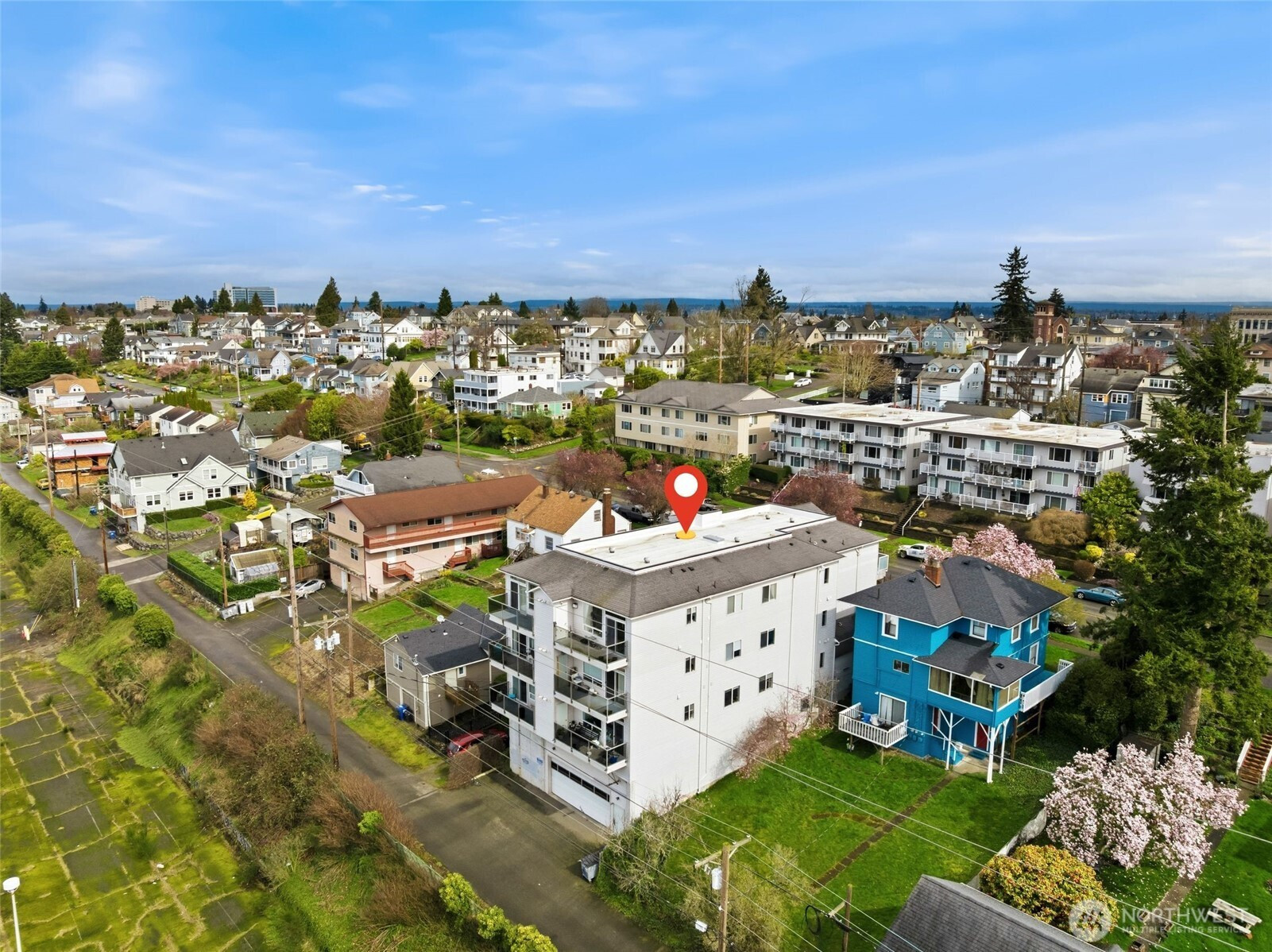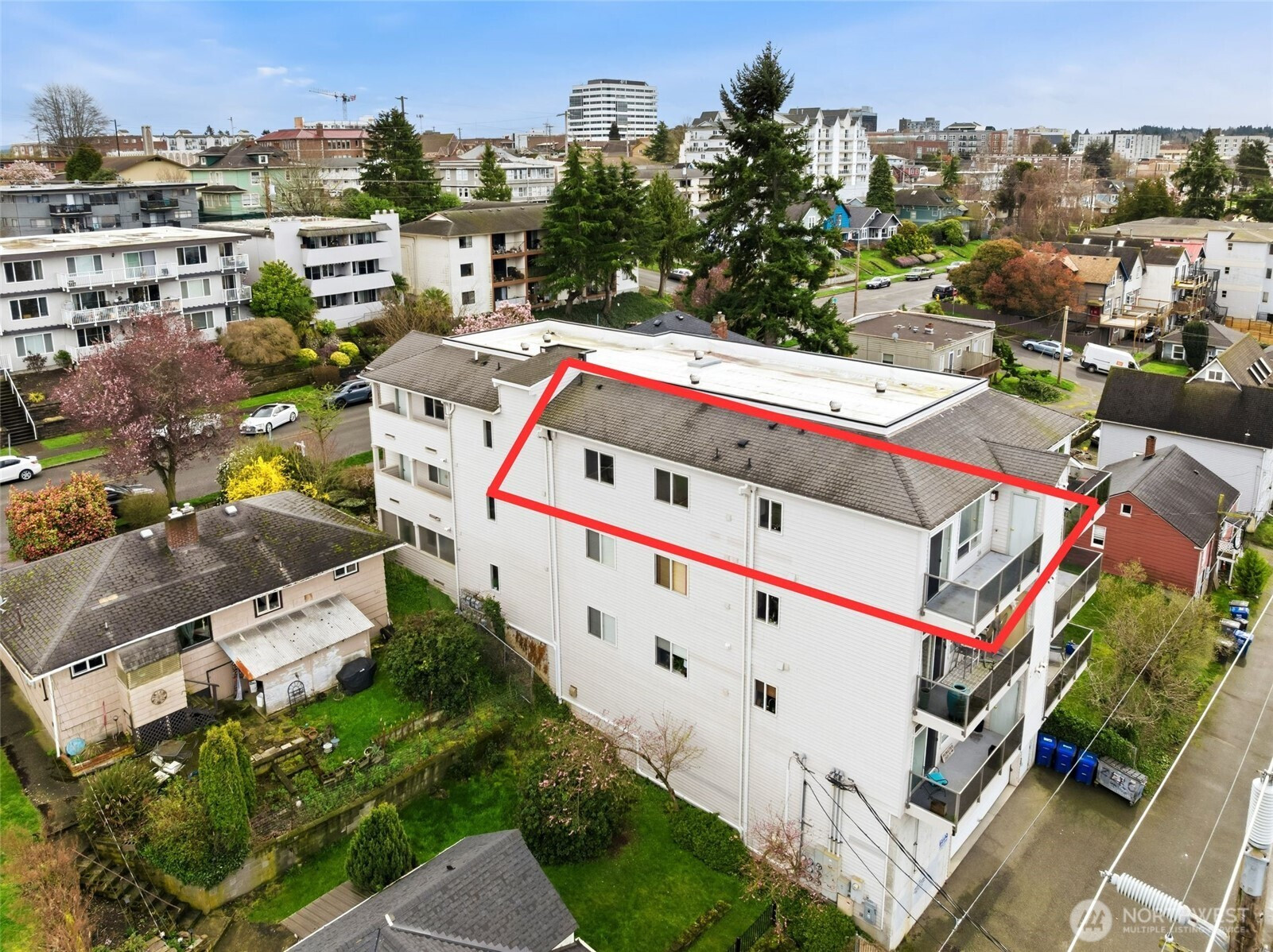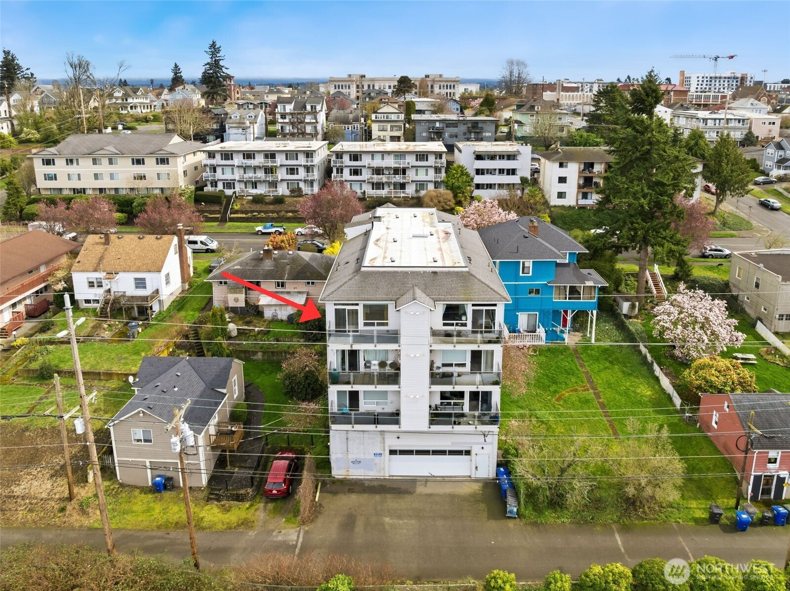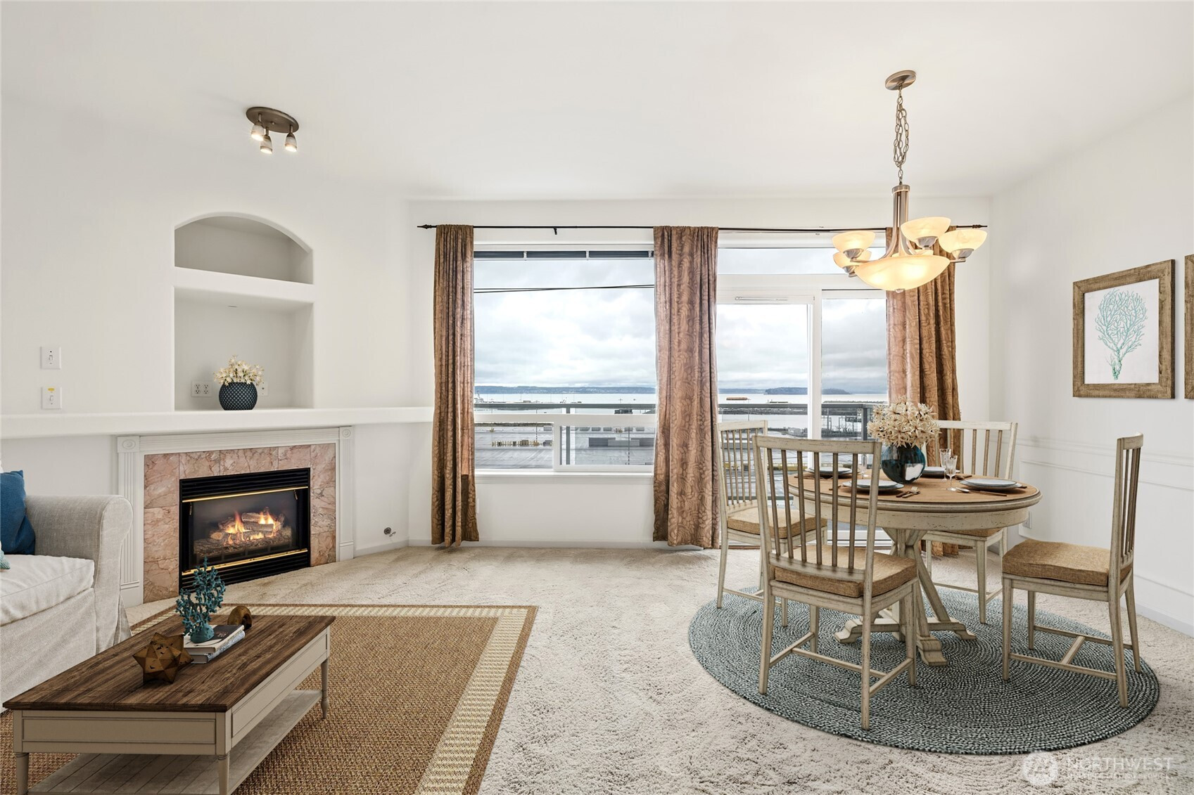 Perched on the top floor, this northwest corner 2-bedroom, 2-bath condo holds one of the most coveted positions in the building, providing added privacy, abundant natural light, and views from every room. The bright, open-concept layout flows effortlessly, with expansive west-facing windows showcasing breathtaking vistas of the Sound, Whidbey Island, Hat Island, and the Olympic Mountains, all set against unforgettable sunsets. Step out onto the private balcony, complete with a convenient storage closet, where morning coffee and evening unwinding come with beautiful views. The spacious primary suite offers a true sense of retreat, featuring a walk-in closet and a generously sized bath. Additional highlights include secure building entry, elevator access with zero stairs to the unit, and secure garage parking. Ideally located just minutes from the Everett Marina, Waterfront Place, downtown, and Angel of the Winds Arena. Enjoy close proximity to scenic parks, golf course, library, and hospital, along with exceptional walkability to restaurants, cafes, pubs, wine bars, and shops. Welcome to a lifestyle of scenic surroundings and everyday ease! Photos are virtually staged.