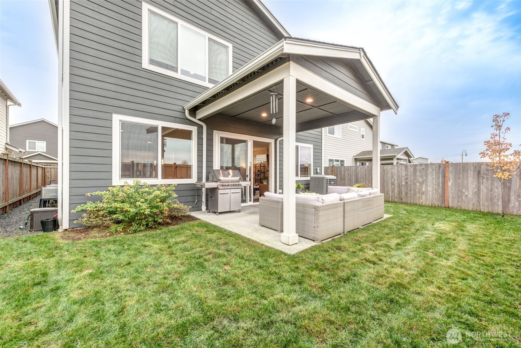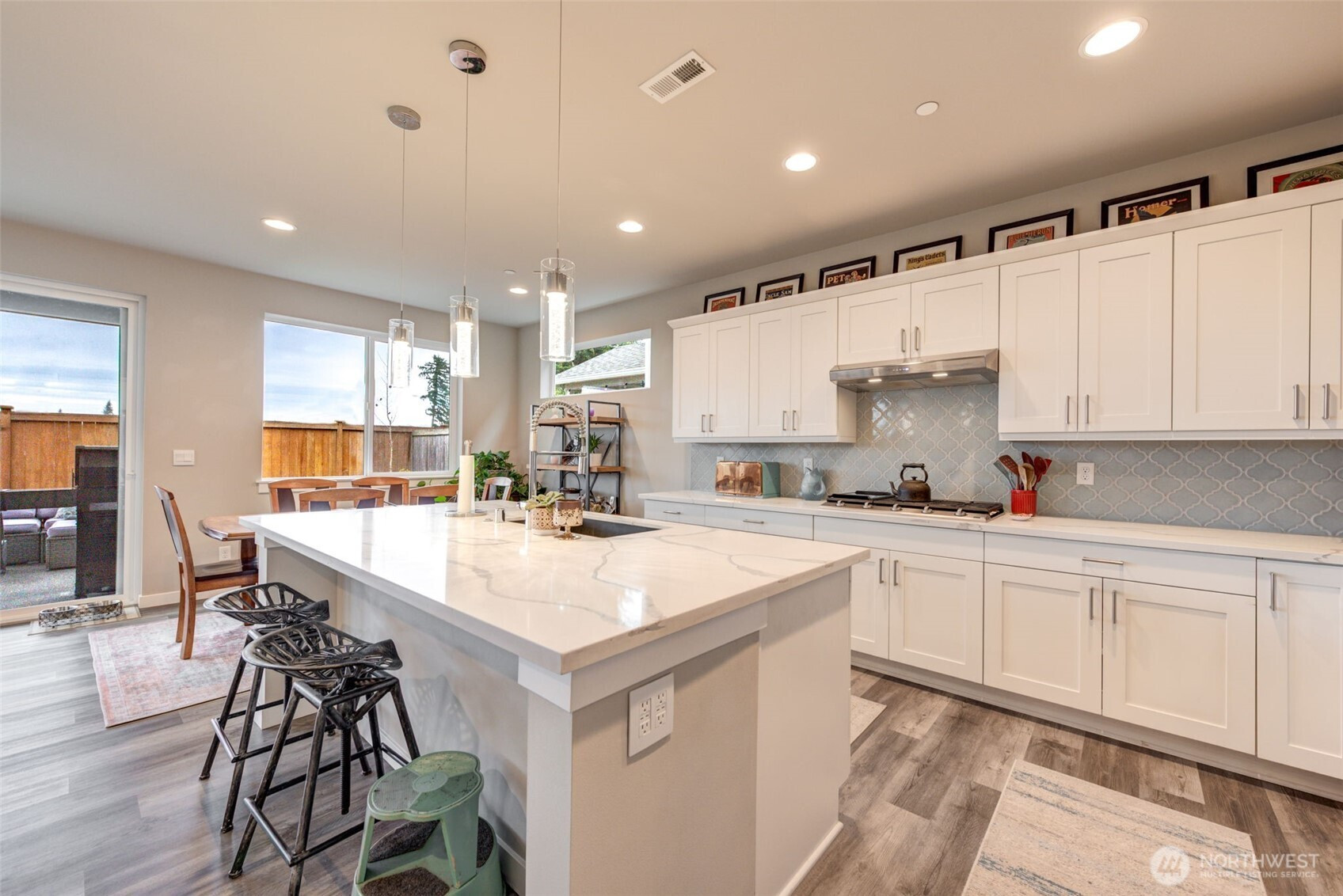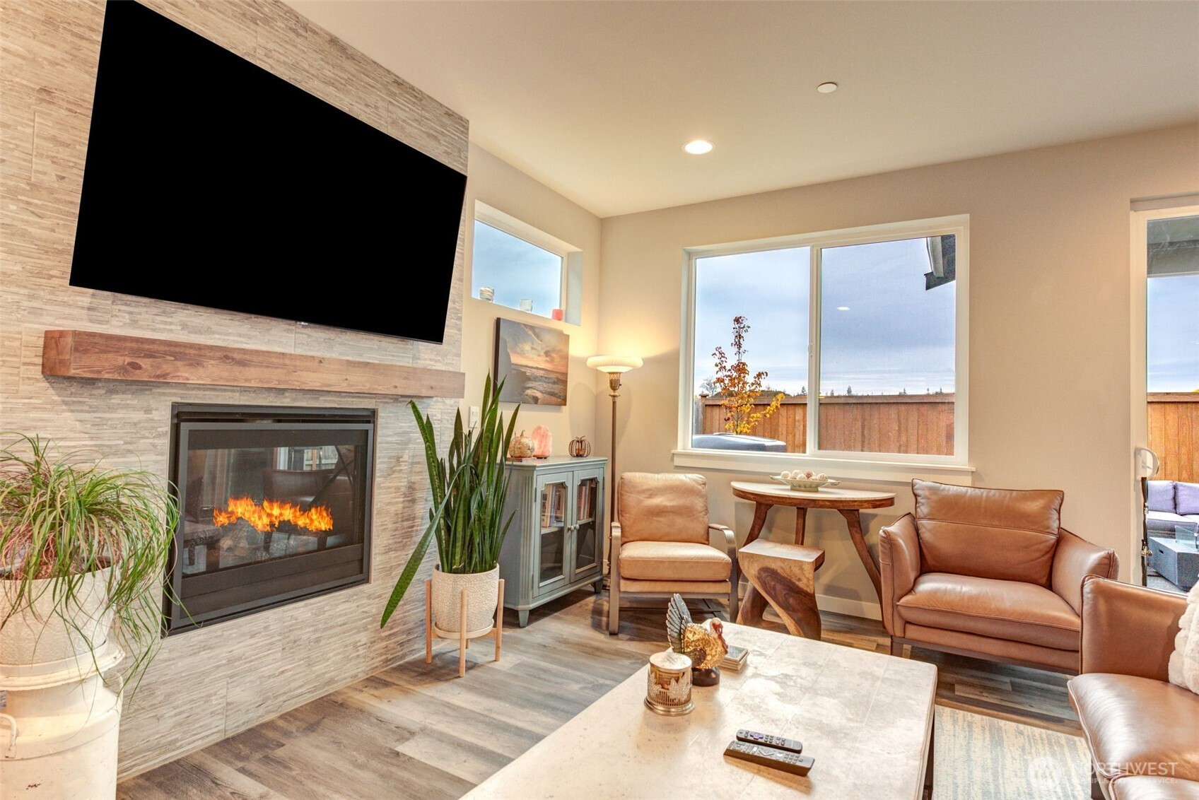 This gorgeous two-story home welcomes you with an inviting entry that flows into a stunning chef’s kitchen and great room—you’ll know you’ve found your home! The kitchen features quartz countertops, subway tile backsplash, farm sink, large island with eating bar, pantry, and stainless steel appliances. Enjoy the open-concept dining, kitchen and living areas with a stone fireplace and custom wood mantle. The sliding doors open to a 12’x12’ covered patio and private fenced yard. The main-floor bedroom and ¾ bath are ideal for guests or multigenerational living. Upstairs offers a family room, utility room luxurious primary suite with 5-piece bath and walk-in closet, plus two additional bedrooms and full bath! Custom blinds.Excellent location!