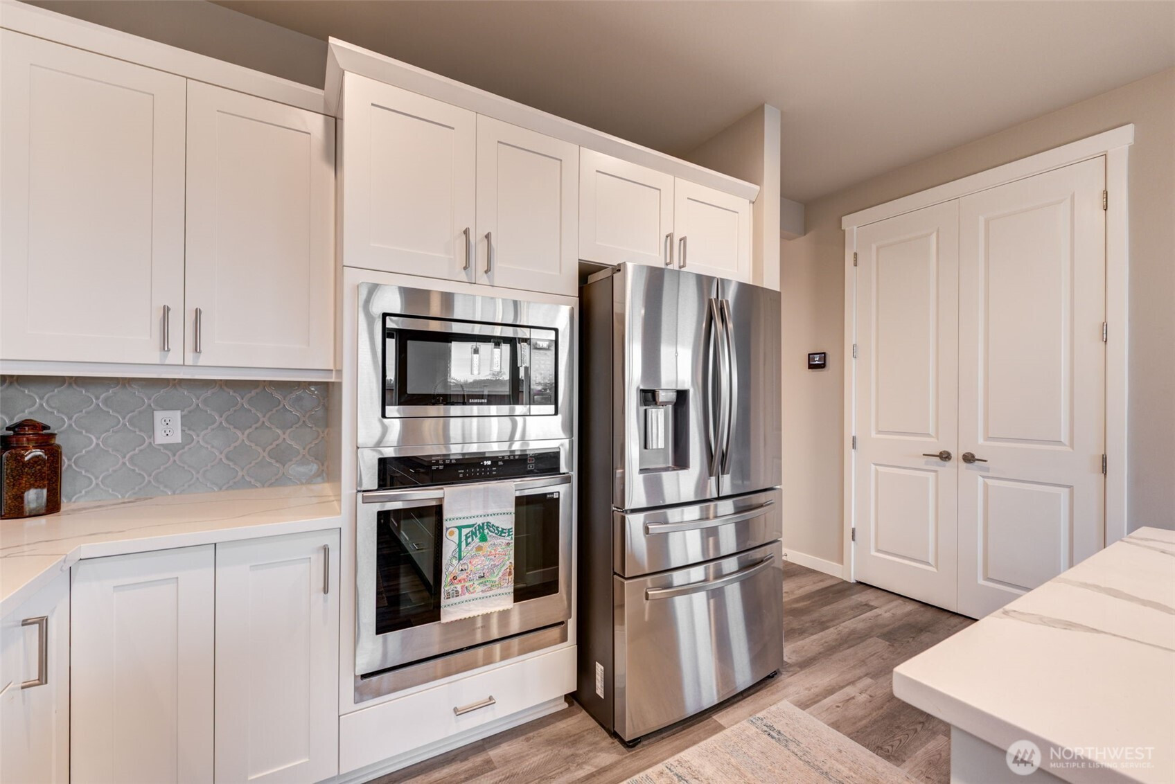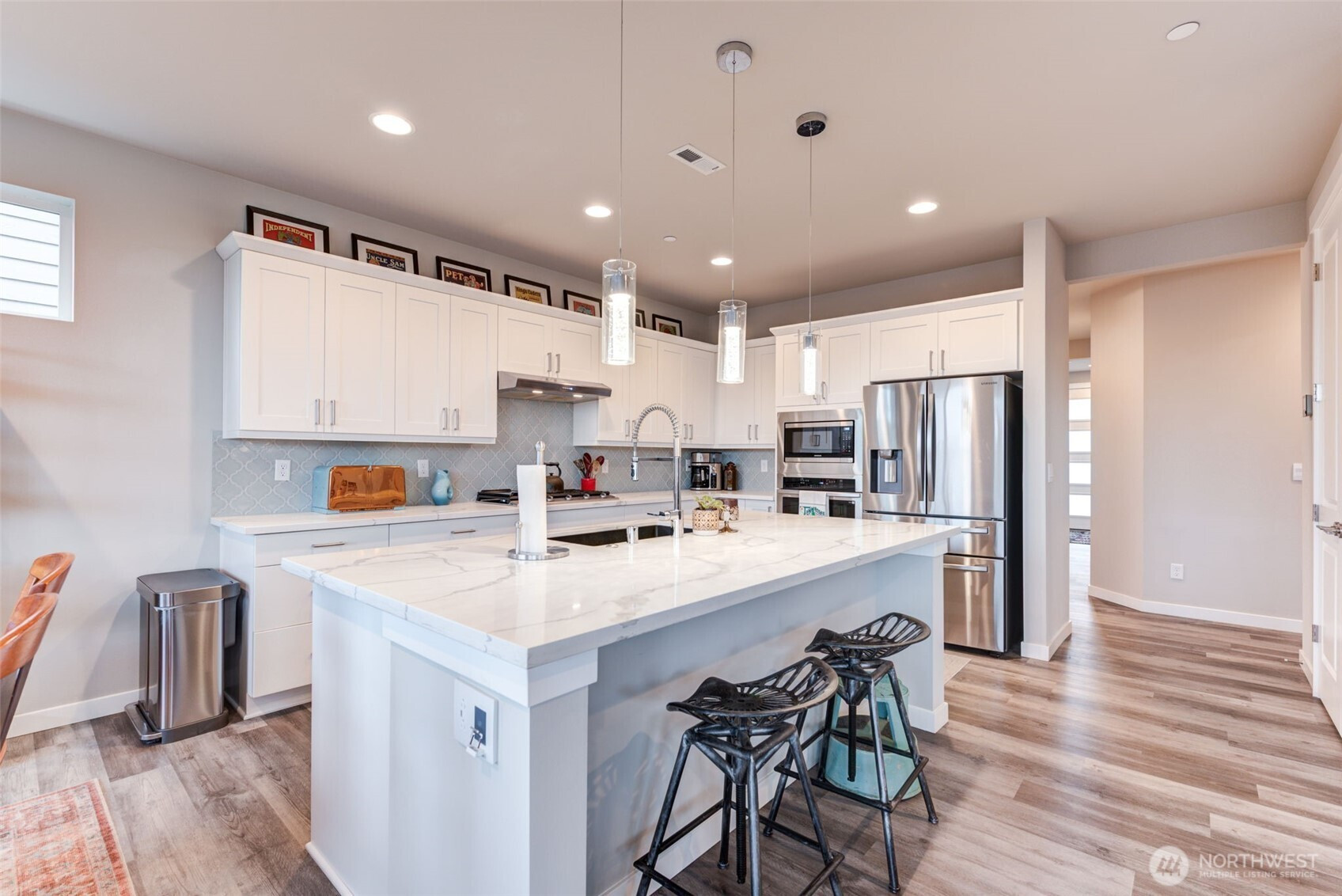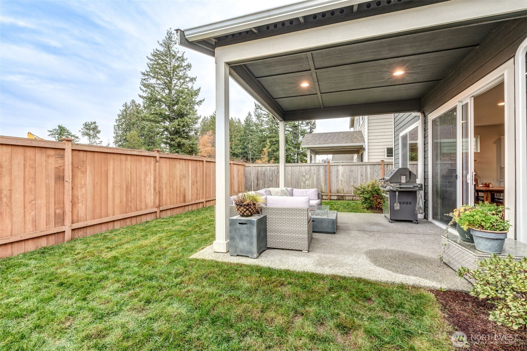 This gorgeous two-story home welcomes you with an inviting entry that flows into a stunning chef’s kitchen and great room—you’ll know you’ve found your home! The kitchen features quartz countertops, subway tile backsplash, farm sink, large island with eating bar, pantry, and stainless steel appliances. Enjoy the open-concept dining, kitchen and living areas with a stone fireplace and custom wood mantle. The sliding doors open to a 12’x12’ covered patio and private fenced yard. The main-floor bedroom and ¾ bath are ideal for guests or multigenerational living. Upstairs offers a family room, utility room luxurious primary suite with 5-piece bath and walk-in closet, plus two additional bedrooms and full bath! Custom blinds.Excellent location!