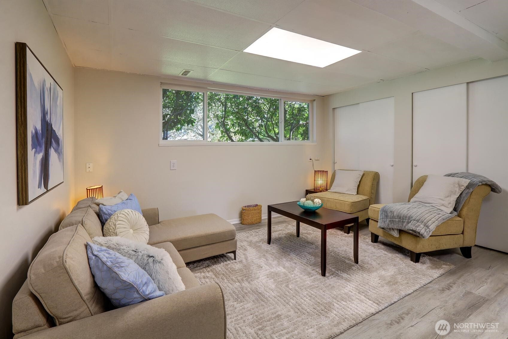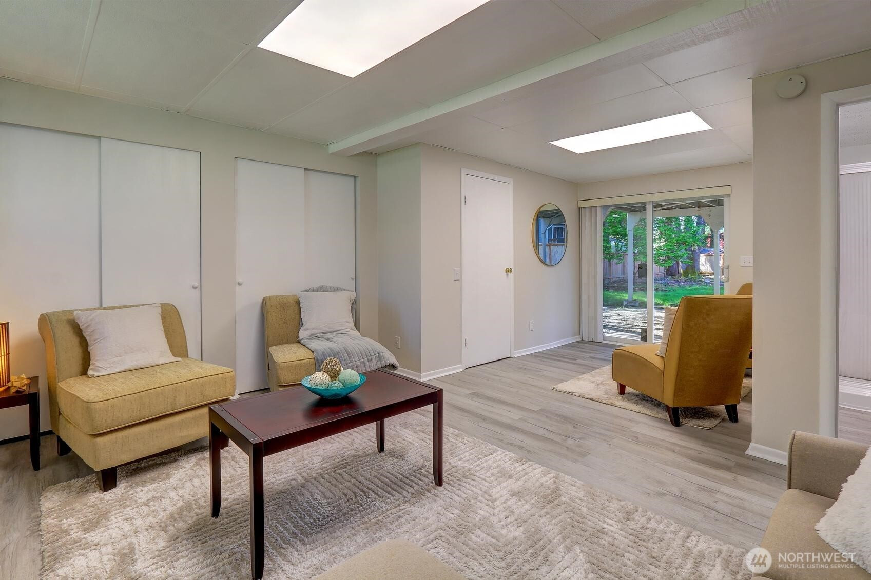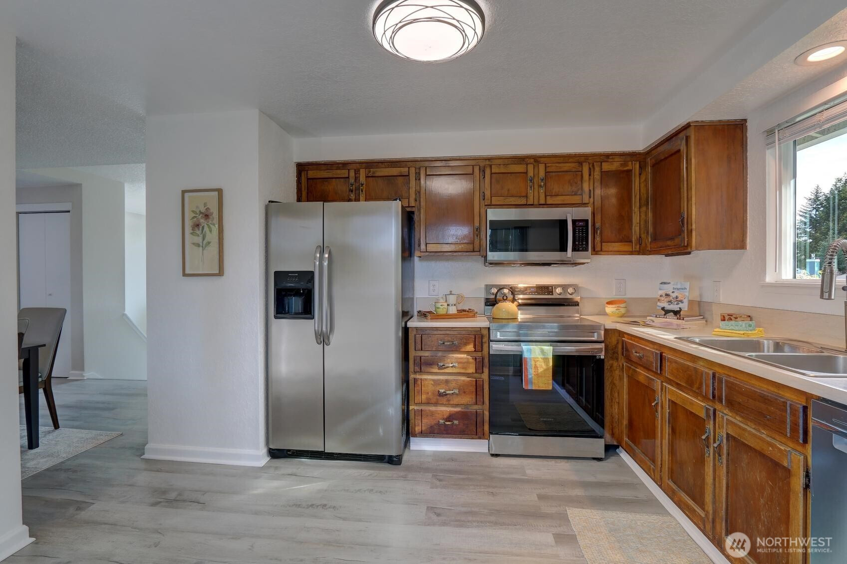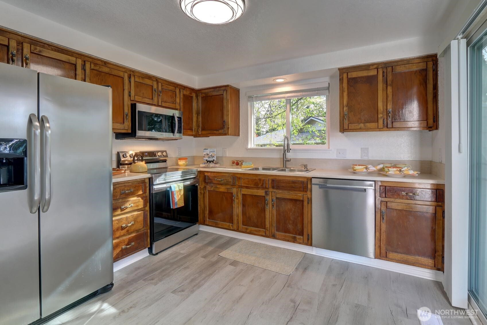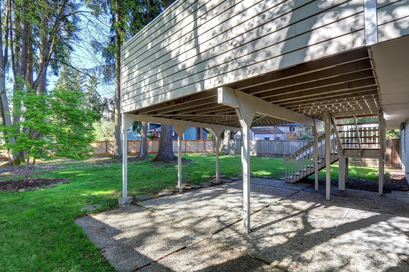 Light-filled and beautifully updated three bedroom mid-entry home nestled at the end of a quiet cul-de-sac. Built in 1978 and completely remodeled inside, this home shines with fresh paint and new laminate hardwood flooring throughout. The spacious kitchen features stainless steel appliances, built-in microwave, double sink, and ample room for an eating area or future center island. Formal dining room flows seamlessly into the bright living room with vaulted ceiling and cozy wood-burning fireplace. Downstairs rec room could be converted to fourth bedroom if desired. And don’t miss the big, multi purpose storage room down here. Enjoy outdoor living on the expansive 17 x 19 ft deck with full railing and staircase, leading to a large, fully fenced backyard – perfect for pets, gardening, or entertaining. The yard is a standout feature with mature evergreens and plenty of space to make it your own. Oversize garage offers incredible functionality with a utility sink, abundant shelving, and a hidden storage room. A rare combination of space, updates and privacy in a desirable cul-de-sac setting - this home is move-in ready and a must see!