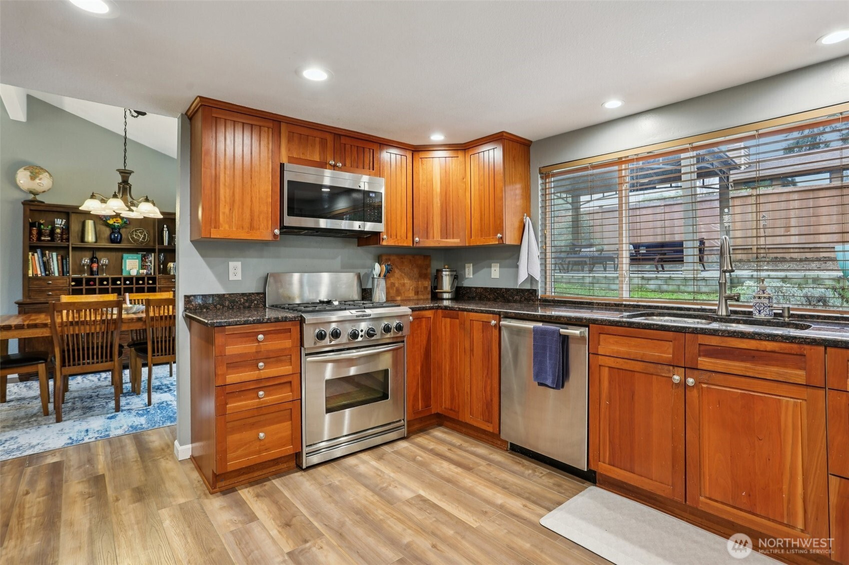 Welcome to this beautifully maintained tri-level home tucked on a quiet cul-de-sac in a desirable neighborhood. The open layout features vaulted ceilings, large picture windows, and a bonus room just off the kitchen. The kitchen offers granite countertops, ample storage, and a comfortable eating nook. Improvements include a new roof, gutters, flooring, interior and exterior paint, and refreshed bathrooms. Outside, enjoy a charming front porch, perfect for morning coffee, a fully fenced backyard, patio, and a charming gazebo, creating a perfect spot to unwind, host friends, or enjoy the fresh air year-round. Move-in ready with thoughtful care throughout, this home truly stands out.
