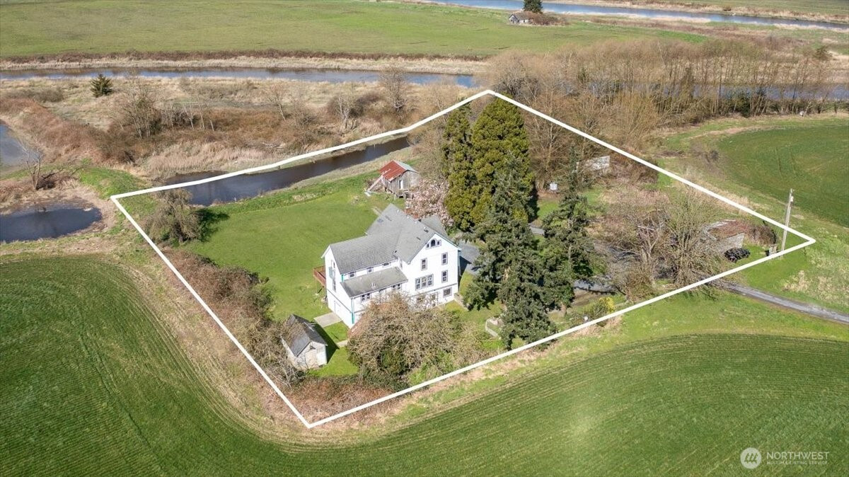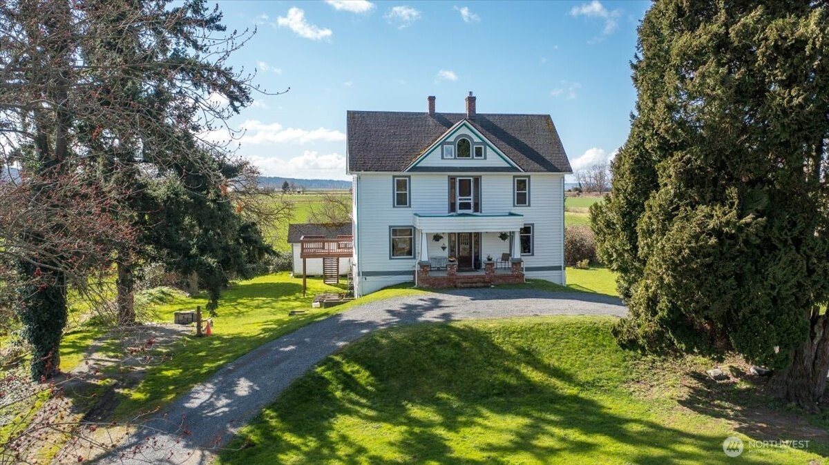 Rare opportunity to own a piece of Stanwood history. Built in 1890, this legacy retreat surrounded by almost 1000 acres has seen only four owners in 136 years & on the market for the first time in over two decades w/views from every room! Tucked at the end of a breathtaking 1,600’ private drive, feels like you are living in a park, the property offers seclusion w/no neighbors in sight. Spanning 316’ of medium-bank waterfront, this is a front-row seat to PNW’s finest wildlife: Trumpeter swans, snow geese, blue herons, river otters, & eagles. The ocean-accessible waterway is perfect for fishing & a truly sustainable lifestyle.The grounds feature an established orchard w/Asian pears tree & other fruit trees, plus room for garden area. Thoughtfully constructed on a significant elevated building pad for peace of mind & commanding views, the home features a massive basement w/radiant floor heating—ideal for a climate-controlled workshop, hobby space, or superior storage. While you will feel worlds away in this private retreat, you are remarkably close to modern amenities - minutes from downtown Stanwood’s shopping, groceries, & dining, w/quick freeway access for commuting. Experience the perfect blend of 19th-century charm, total privacy, and 21st-century convenience. This is a once-in-a-generation private waterfront retreat is waiting for its fifth steward to call it home. Discover the peace, history, & unparalleled beauty of this Historical Landmark Jorgensen HOMESTEAD today.