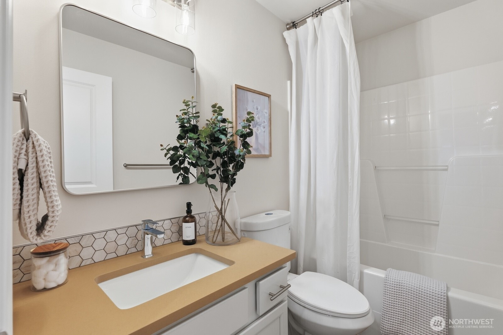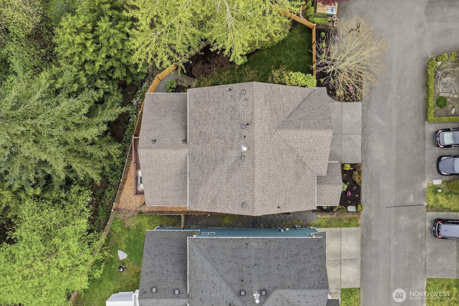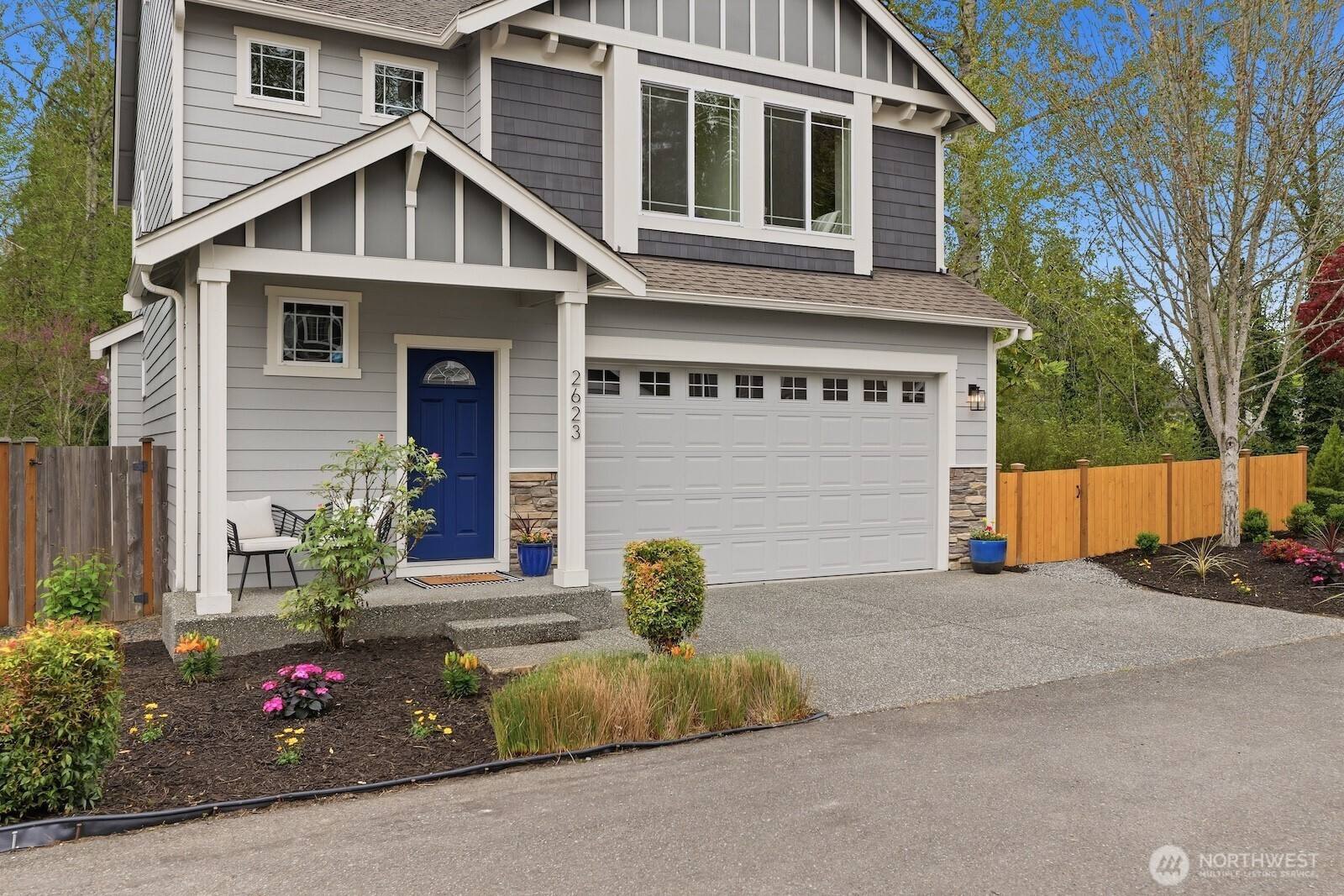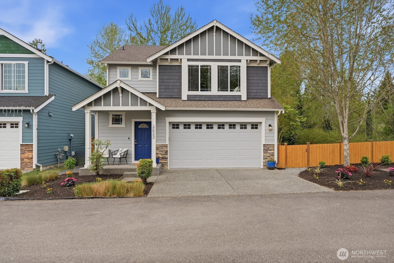 A rare find in North Creek Bothell - this east facing, updated 4 bedroom home offers a fully fenced, usable yard & peaceful greenbelt setting all within a quiet, park-like community of just 18 homes. Ideally located minutes from Mill Creek Town Center, Canyon Park & Alderwood shopping, it combines everyday convenience with a sense of privacy and calm. Lush, mature landscaping welcomes you home & sets the tone for what’s inside. This home is truly move-in ready with fresh interior paint, all new lighting & new flooring throughout the main level & bathrooms. This hard to find main-floor primary suite offers flexibility, privacy & convenience with vaulted ceilings, a spacious closet & an updated ensuite bath. Soaring 2-story ceilings in the entry & living room fill the space with natural light, creating an open, airy feel & highlighting a comfortable, highly livable layout with central A/C & a cozy gas fireplace. The updated kitchen features quartz counters, stainless appliances, a new gas range, subway tile backsplash & an island with seating - perfect for casual meals or gathering with friends. Upstairs includes 3 additional bedrooms plus an office nook. Step outside to a private deck overlooking serene green space & enjoy the sun-filled, private yard ideal for everyday play, pets or summer entertaining. Located in top-rated Everett school district & close to parks, trails, dining, shopping, & commuter routes. No rental cap. Privacy & proximity: the best of both worlds!