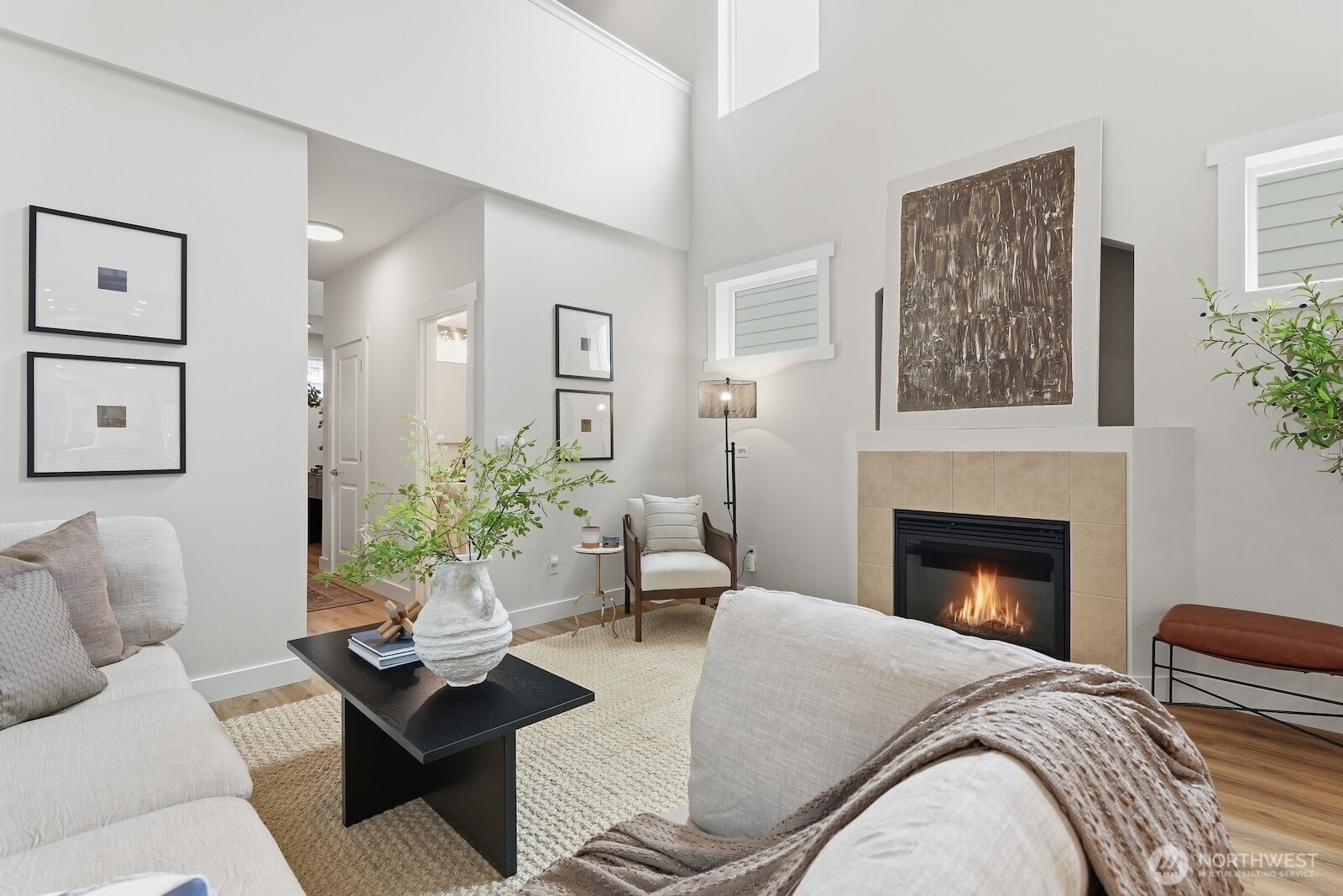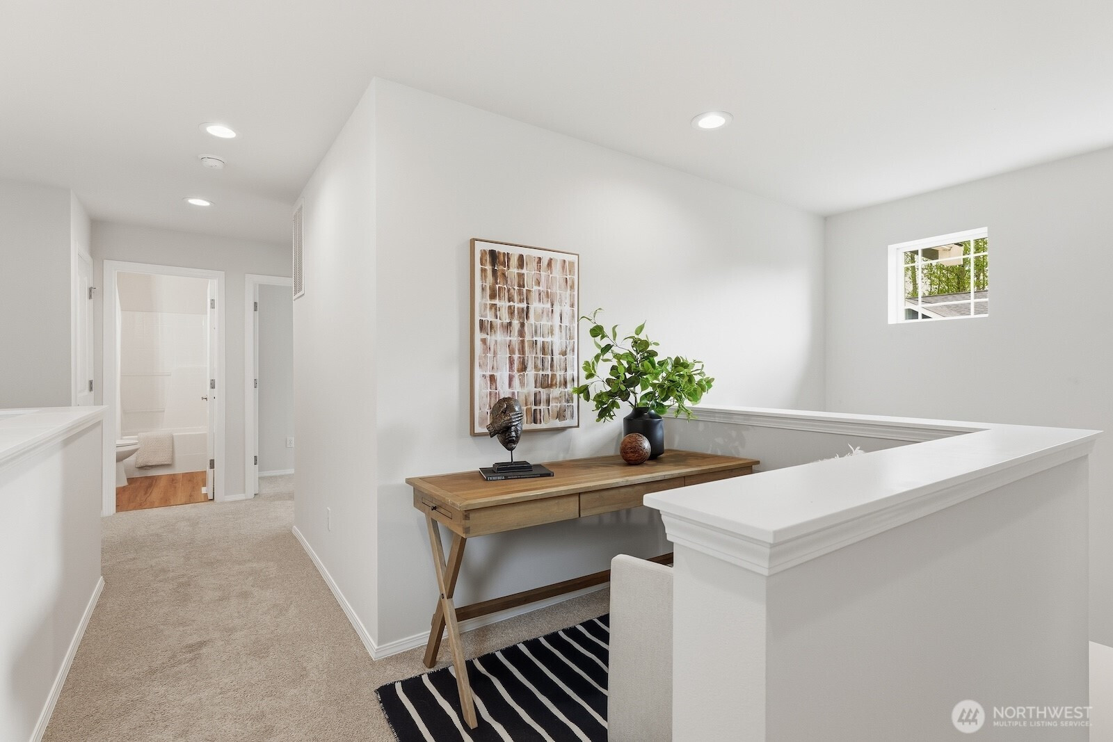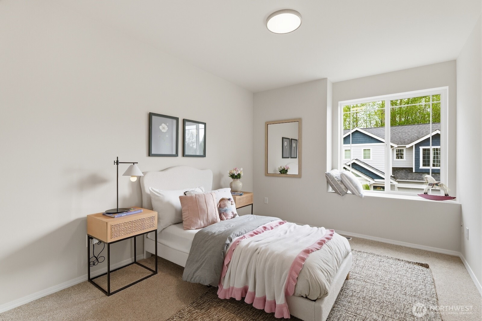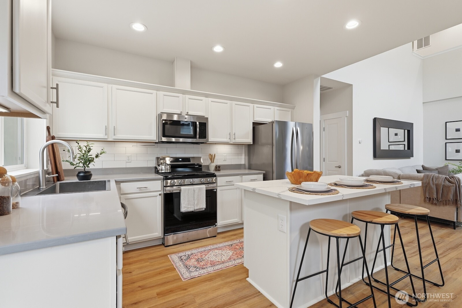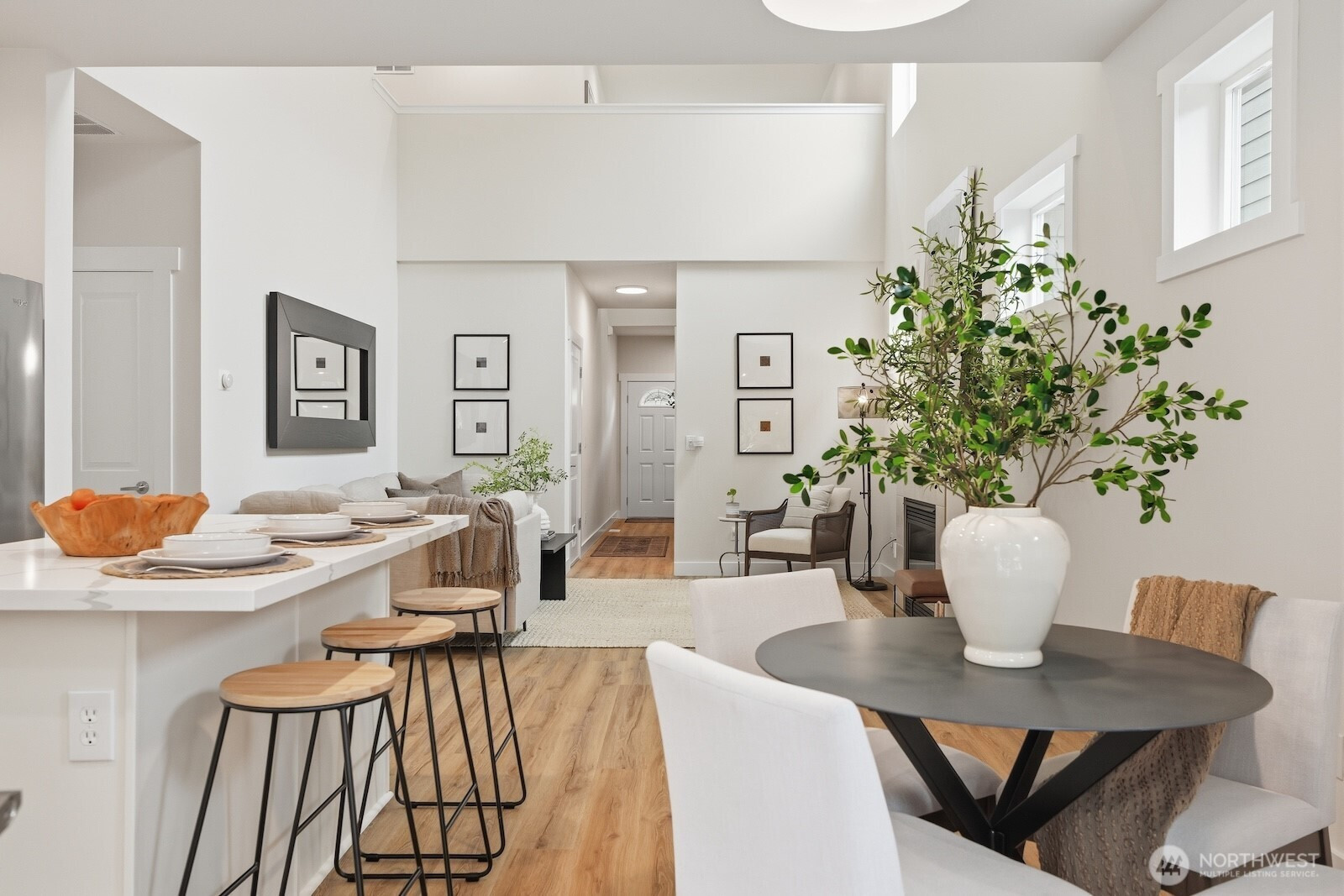 A rare find in North Creek Bothell - this east facing, updated 4 bedroom home offers a fully fenced, usable yard & peaceful greenbelt setting all within a quiet, park-like community of just 18 homes. Ideally located minutes from Mill Creek Town Center, Canyon Park & Alderwood shopping, it combines everyday convenience with a sense of privacy and calm. Lush, mature landscaping welcomes you home & sets the tone for what’s inside. This home is truly move-in ready with fresh interior paint, all new lighting & new flooring throughout the main level & bathrooms. This hard to find main-floor primary suite offers flexibility, privacy & convenience with vaulted ceilings, a spacious closet & an updated ensuite bath. Soaring 2-story ceilings in the entry & living room fill the space with natural light, creating an open, airy feel & highlighting a comfortable, highly livable layout with central A/C & a cozy gas fireplace. The updated kitchen features quartz counters, stainless appliances, a new gas range, subway tile backsplash & an island with seating - perfect for casual meals or gathering with friends. Upstairs includes 3 additional bedrooms plus an office nook. Step outside to a private deck overlooking serene green space & enjoy the sun-filled, private yard ideal for everyday play, pets or summer entertaining. Located in top-rated Everett school district & close to parks, trails, dining, shopping, & commuter routes. No rental cap. Privacy & proximity: the best of both worlds!