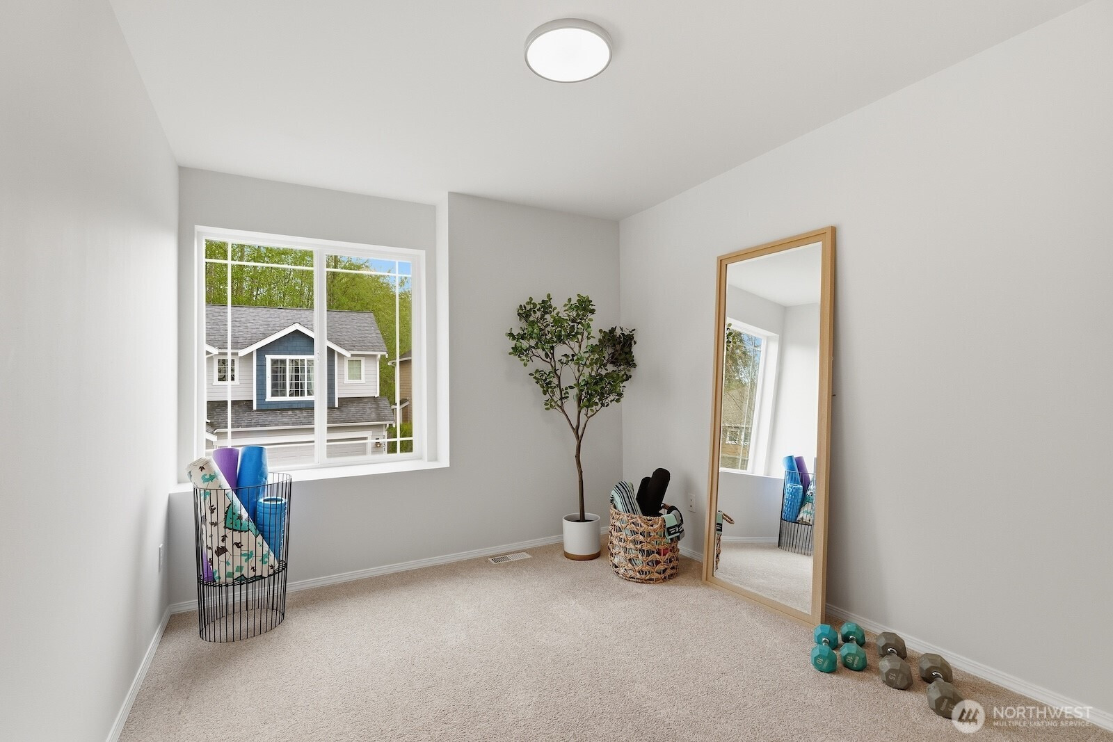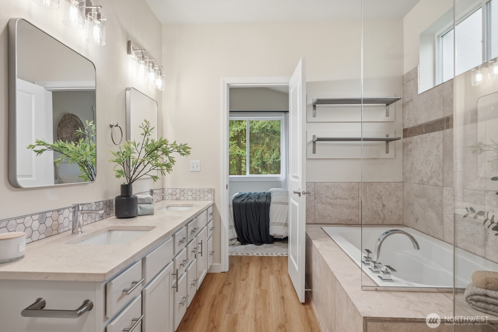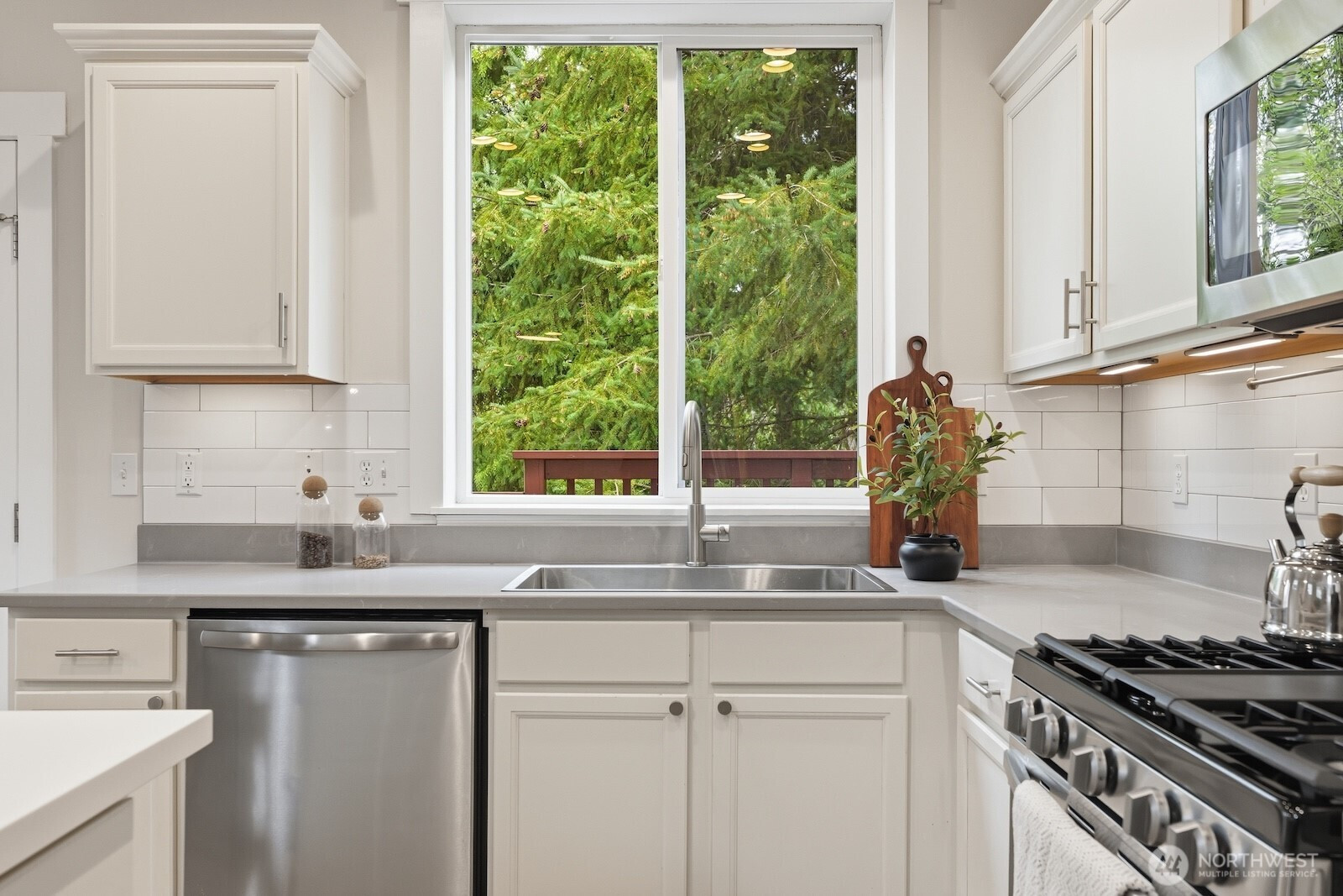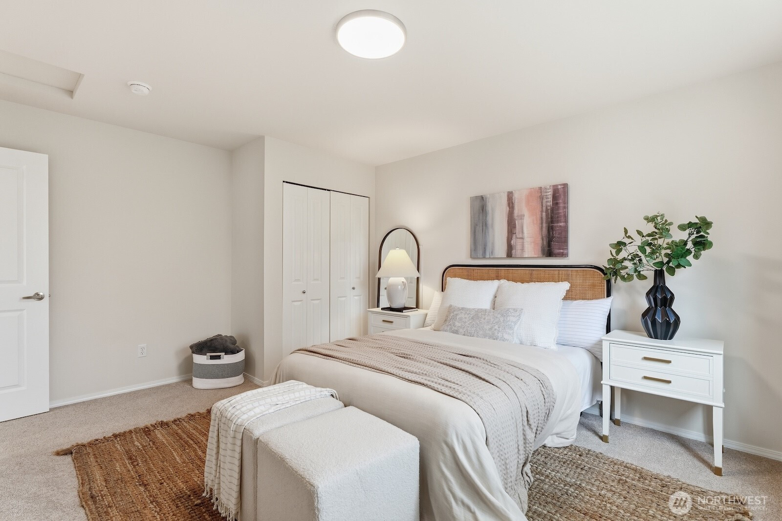 A rare find in North Creek Bothell - this east facing, updated 4 bedroom home offers a fully fenced, usable yard & peaceful greenbelt setting all within a quiet, park-like community of just 18 homes. Ideally located minutes from Mill Creek Town Center, Canyon Park & Alderwood shopping, it combines everyday convenience with a sense of privacy and calm. Lush, mature landscaping welcomes you home & sets the tone for what’s inside. This home is truly move-in ready with fresh interior paint, all new lighting & new flooring throughout the main level & bathrooms. This hard to find main-floor primary suite offers flexibility, privacy & convenience with vaulted ceilings, a spacious closet & an updated ensuite bath. Soaring 2-story ceilings in the entry & living room fill the space with natural light, creating an open, airy feel & highlighting a comfortable, highly livable layout with central A/C & a cozy gas fireplace. The updated kitchen features quartz counters, stainless appliances, a new gas range, subway tile backsplash & an island with seating - perfect for casual meals or gathering with friends. Upstairs includes 3 additional bedrooms plus an office nook. Step outside to a private deck overlooking serene green space & enjoy the sun-filled, private yard ideal for everyday play, pets or summer entertaining. Located in top-rated Everett school district & close to parks, trails, dining, shopping, & commuter routes. No rental cap. Privacy & proximity: the best of both worlds!