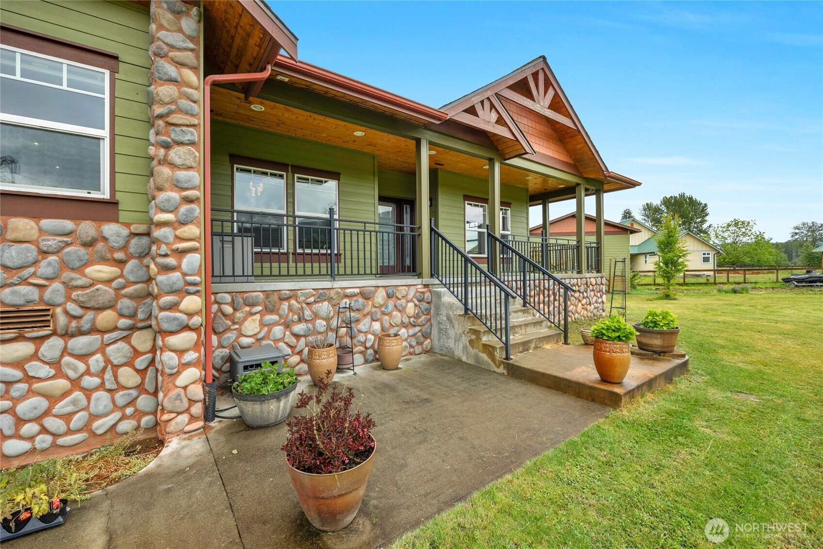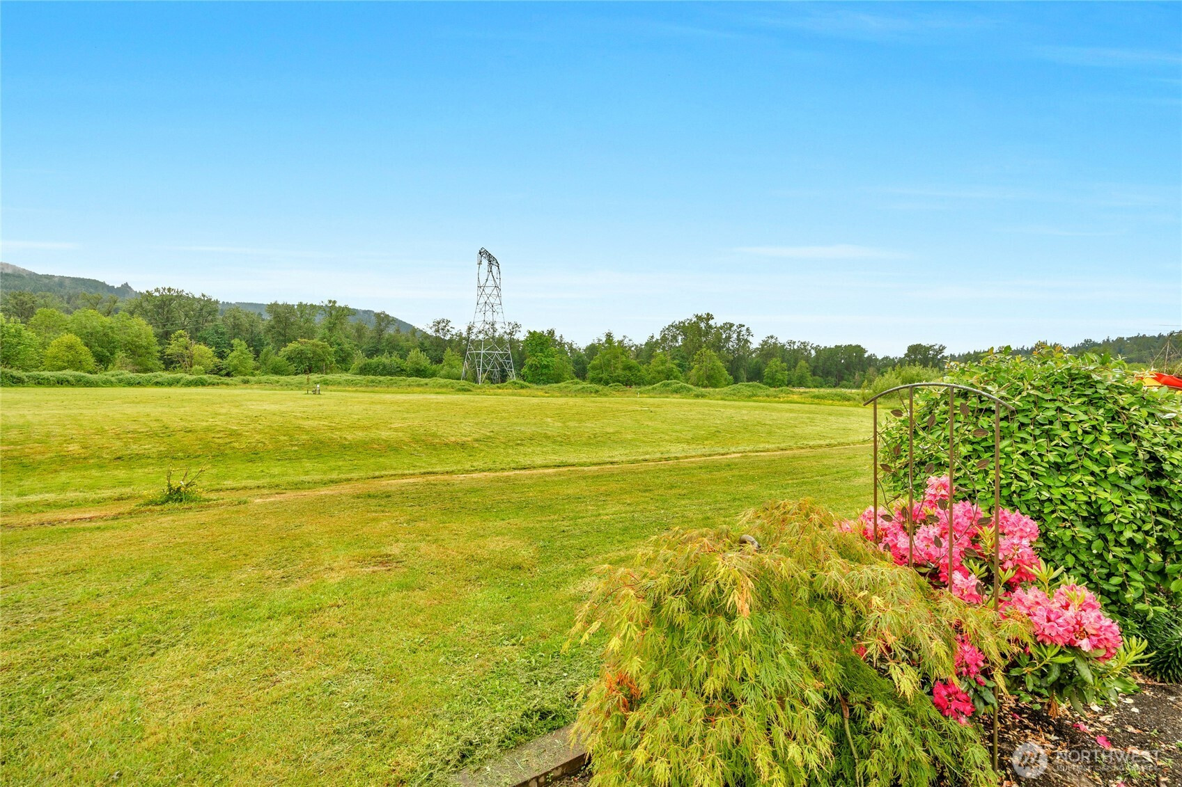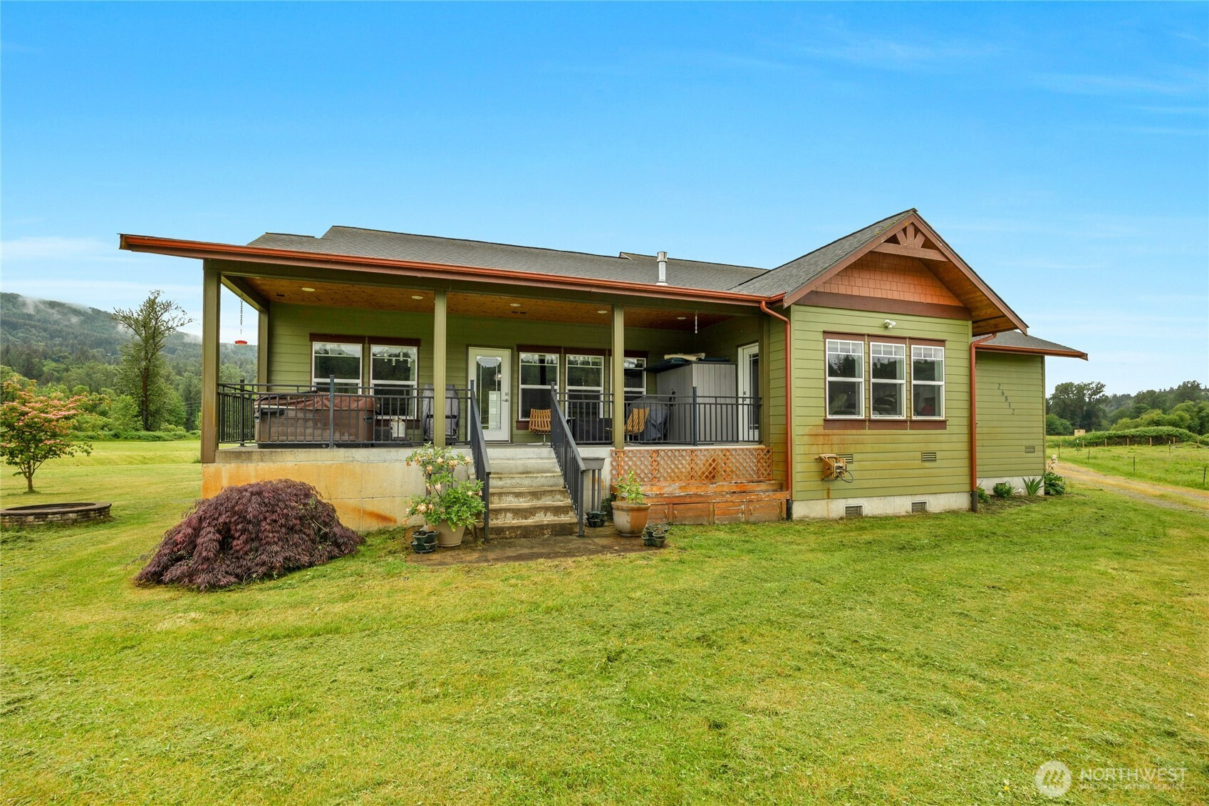 Peaceful 3.7-acre Monroe rambler w/ stunning mountain views & peek of Skykomish River. 'Great Room' layout shines w/ vaulted ceilings, walls of windows, custom propane FP, & open flow from living to dining to gourmet kitchen—featuring powered island, walk-in pantry, & custom cabinetry. Large patio off 'Great Room' is perfect for BBQs, stargazing, or coffee w/ the birds. Primary suite offers private patio access, 5-pc ensuite w/ soaking tub, walk-in shower, & extra large closet. French doors open to 3rd bed, ideal for office/studio. Formal living room adds flexible space. Efficient radiant floor heating. Outside: 20x20 powered shed, raised garden beds, 2-car attached garage, private well w/ new water system—comfort, beauty & room to roam!