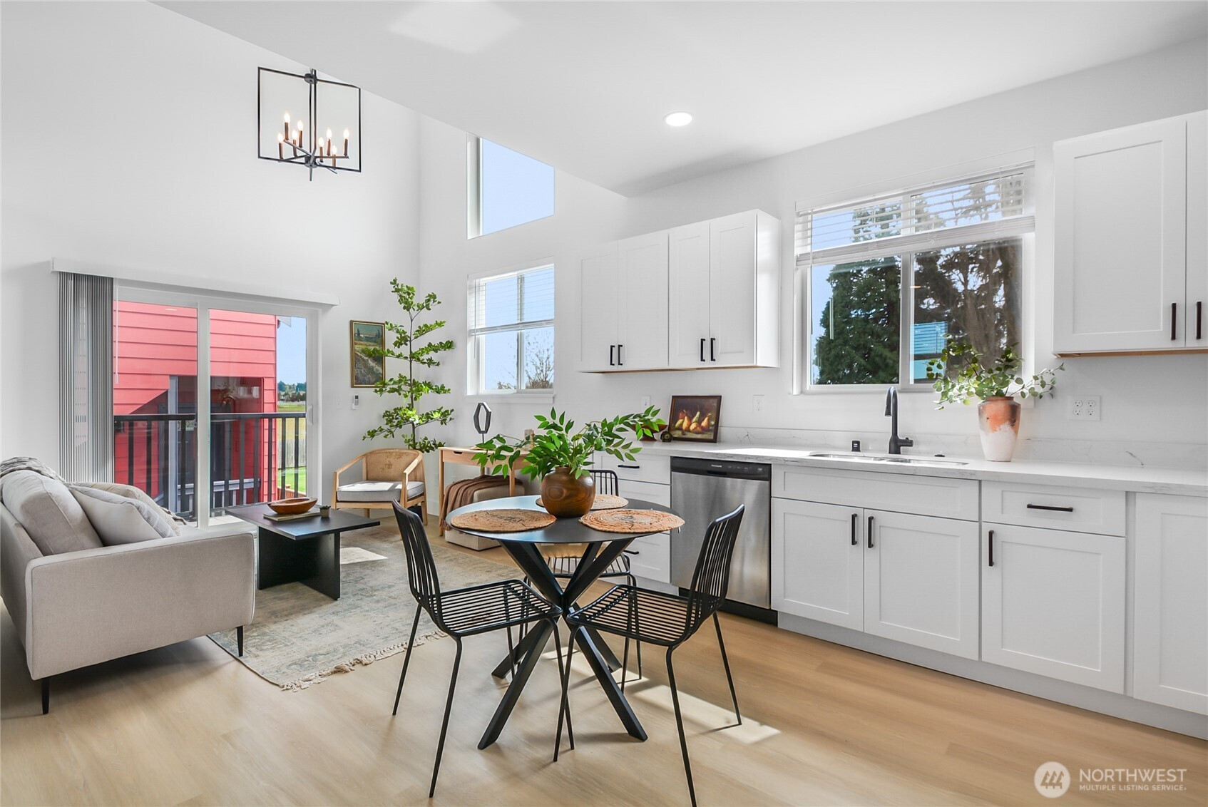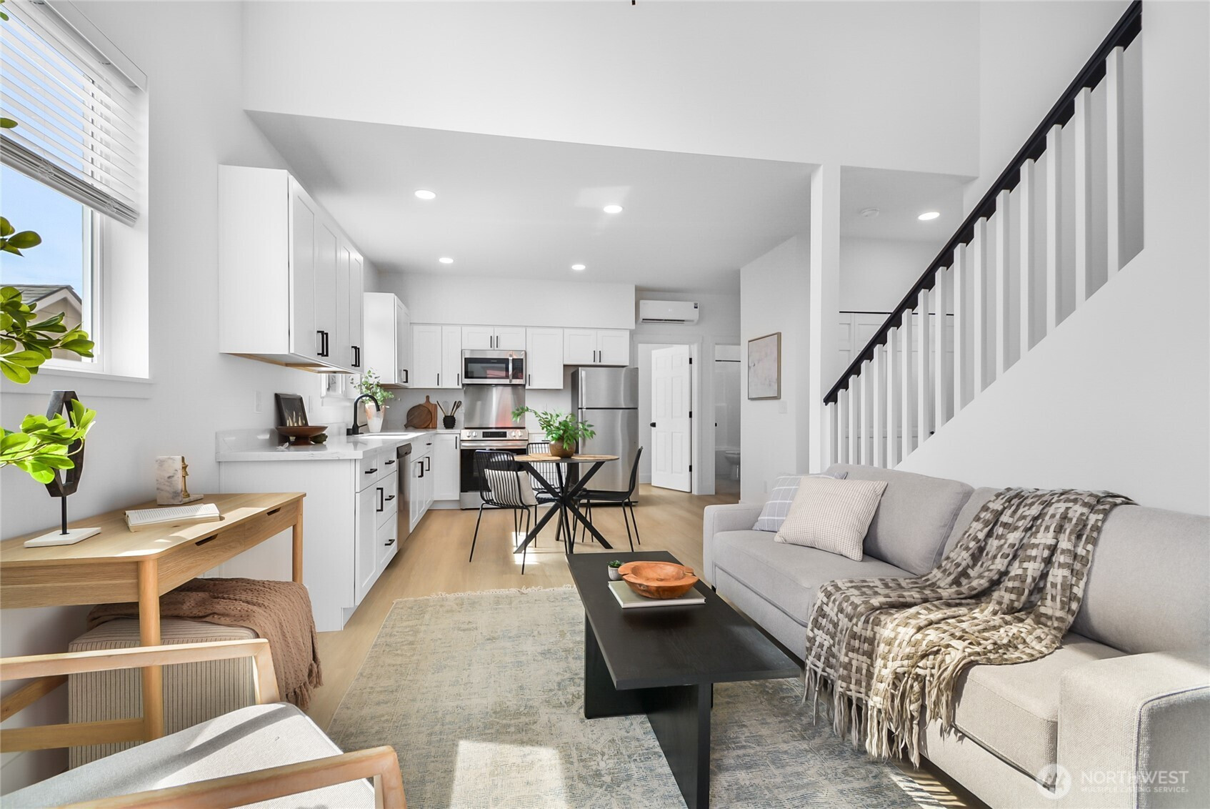 Welcome to this stunning brand-new 2-bedroom, 1¾-bath townhouse-style condo in a convenient Stanwood location, close to all of Stanwood’s amenities. Walk to the park, downtown, and to Stanwood Elementary and Middle School. Built with quality and comfort in mind, this thoughtfully designed home features soaring vaulted ceilings that fill the space with light & warmth. Durable vinyl plank flooring flows throughout, while the bathrooms are beautifully finished with tile floors and a full tile surround in the bath and shower. The fantastic kitchen boasts beautiful countertops, generous storage, and stainless-steel appliances — a true centerpiece for cooking and entertaining. A washer and dryer are included, making this home truly move-in ready from day one. Stay comfortable year-round with a zoned mini-split heating and cooling system and enjoy superior indoor air quality thanks to the whole-house Energy Recovery Ventilation(ERV) system — a premium feature that continuously circulates fresh, filtered air throughout the home. Step outside to your beautifully fenced backyard — a private retreat perfect for relaxing or entertaining. The finished two-car garage features extra workshop space, ideal for hobbies, projects, or storage. Energy-efficient, low-maintenance, and move-in ready — this is the new construction opportunity you’ve been waiting for.