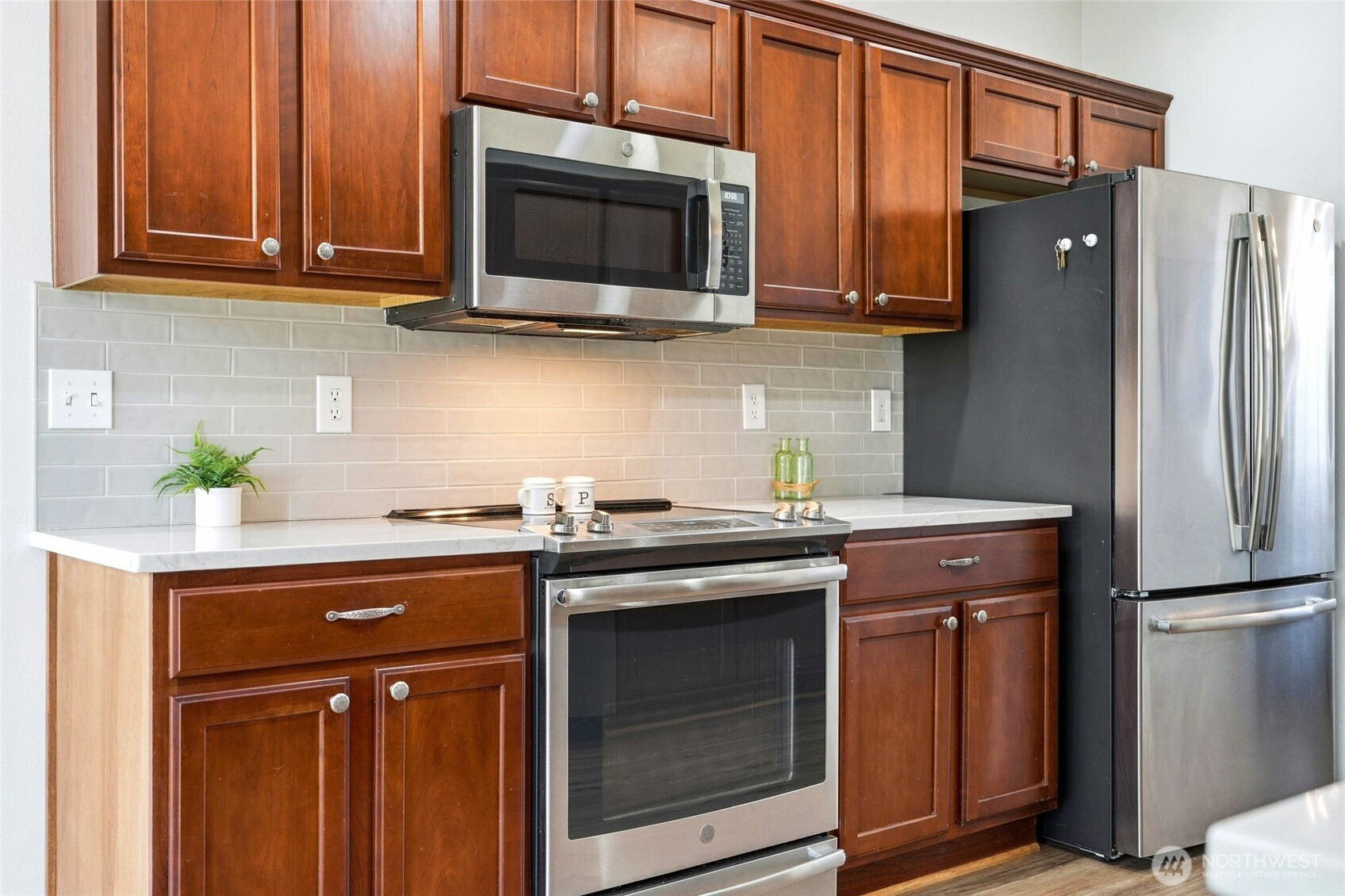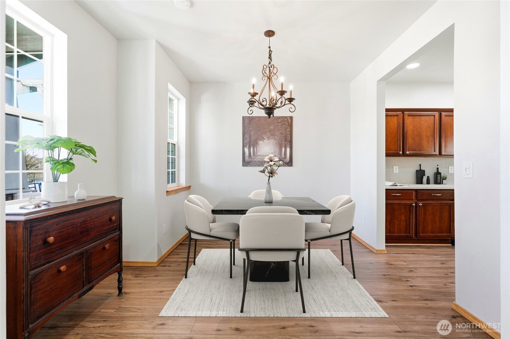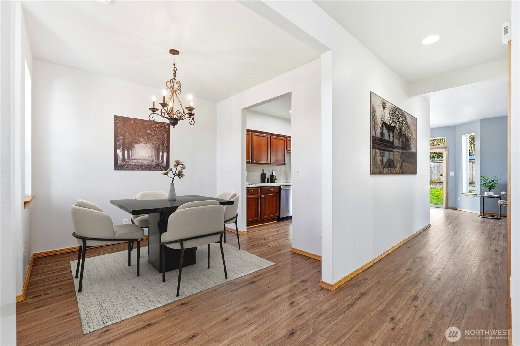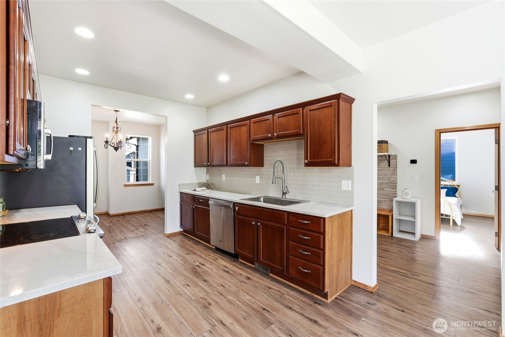 Welcome to this Stanwood stunner where everyday living feels a little more elevated. A charming covered porch sets the tone, inviting you to slow down & stay awhile. Inside, formal living & dining spaces shine with gorgeous new LVP flooring, plush carpet, & fresh paint throughout—crisp, clean, & move-in ready. The heart of the home is the beautifully updated kitchen, featuring sleek new countertops, stylish backsplash, & sunny breakfast nook made for early-morning coffee or afternoon homework sessions. The adjoining family room is warm & welcoming with natural light, cozy gas fireplace, & new smart thermostat to keep comfort dialed in year-round. A spacious mudroom with built-in bench seating & storage just off the 2-car garage keeps backpacks, cleats, & daily chaos tucked away. The main-level bedroom & full bath offer flexibility for guests, multi-gen living, or private home office. Upstairs, retreat to a generous primary suite with a massive en-suite bath—your own end-of-day escape. Two additional bedrooms & extra storage space provide room to grow. And then there’s the showstopper: a dedicated movie room with built-in projector & certified 7.2 THX surround sound. This isn’t just movie night—this is an experience. Outside, refreshed landscaping & fully fenced yard create space to play, garden, or unwind. Located minutes from amenities & walking distance to Stanwood schools—no bus ride to Camano required! This is more than a house, it's where you can start your next chapter.