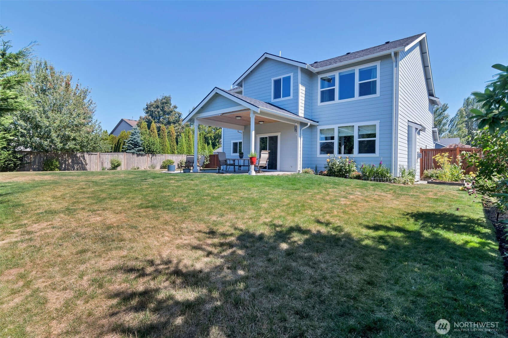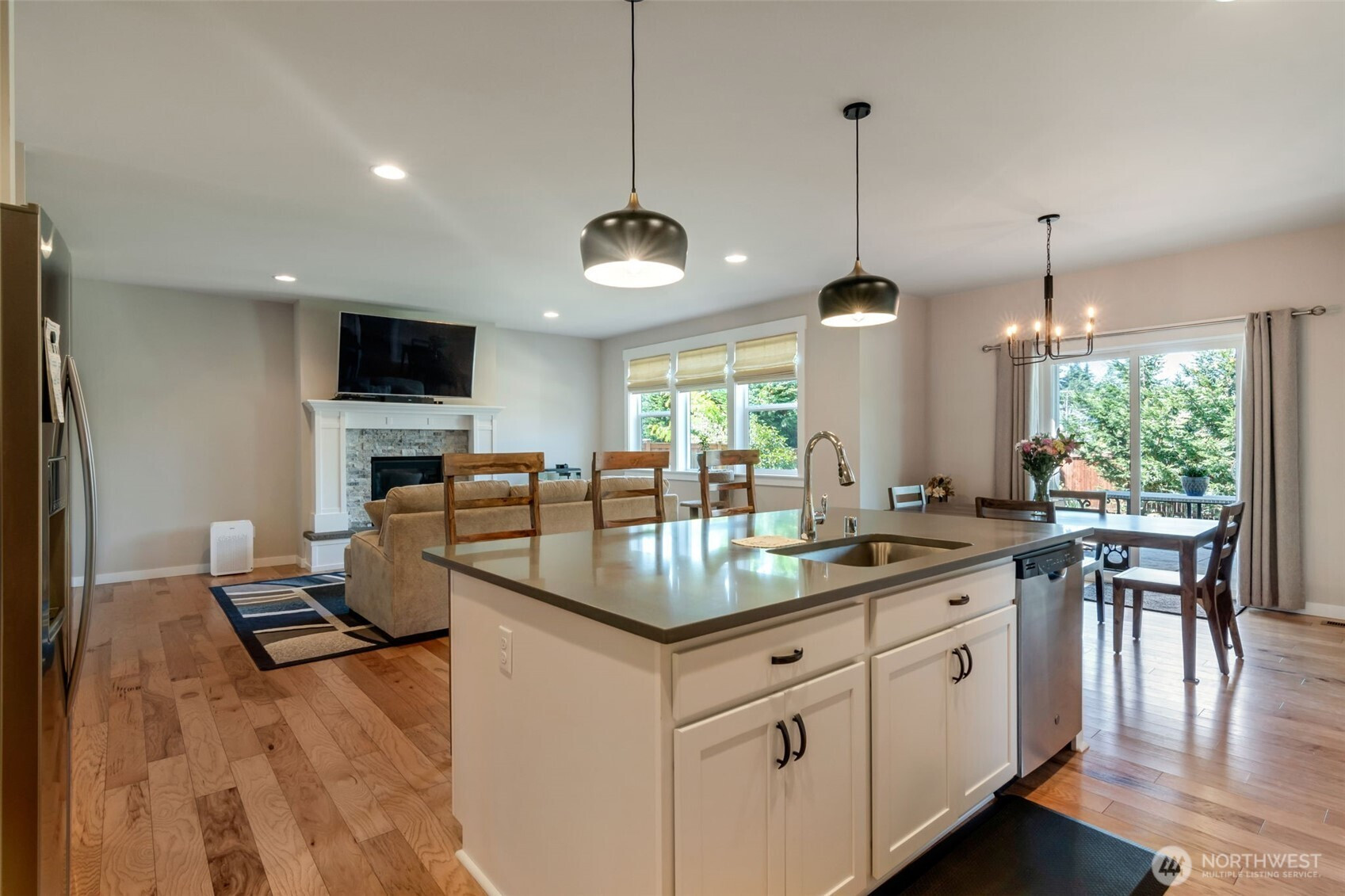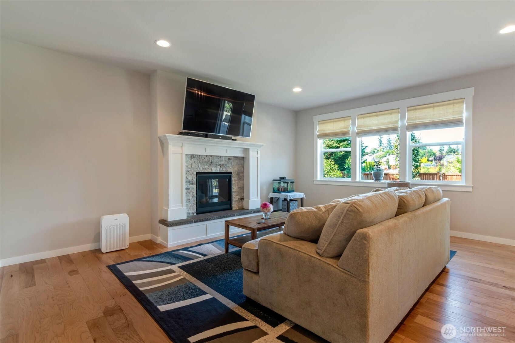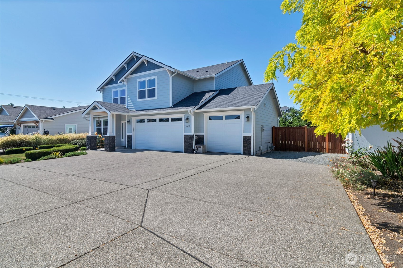 Welcome home to this beautifully appointed craftsman in Stanwood, where thoughtful design meets everyday comfort. The open-concept main level impresses from the moment you step inside, with rich hardwood floors flowing from the welcoming entryway through the spacious living room — anchored by a cozy fireplace — into the chef's kitchen and dining area. The kitchen shines with white cabinetry, a gas range with statement hood, granite counters, a large island with bar seating, and stainless appliances. A main-level office (easily used as a 5th bedroom) adds versatility, while the oversized mudroom and laundry room off the garage keep daily life organized. A full guest bath completes the main floor. Upstairs, the primary suite is a true retreat — vaulted ceilings, a generous walk-in closet, and a luxurious en suite bath with dual vanities, a soaking tub, and a separate shower. Three additional bedrooms, a massive bonus room, and a second full bath with his-and-hers sinks and a private shower/toilet room round out the upper level. Outside, enjoy a covered patio perfect for year-round entertaining, a spacious and private backyard, and a generous side yard — all framed by mature landscaping. The attached two-car garage and wide driveway offer ample parking. This is the one you've been waiting for — space, style, and functionality all in one.