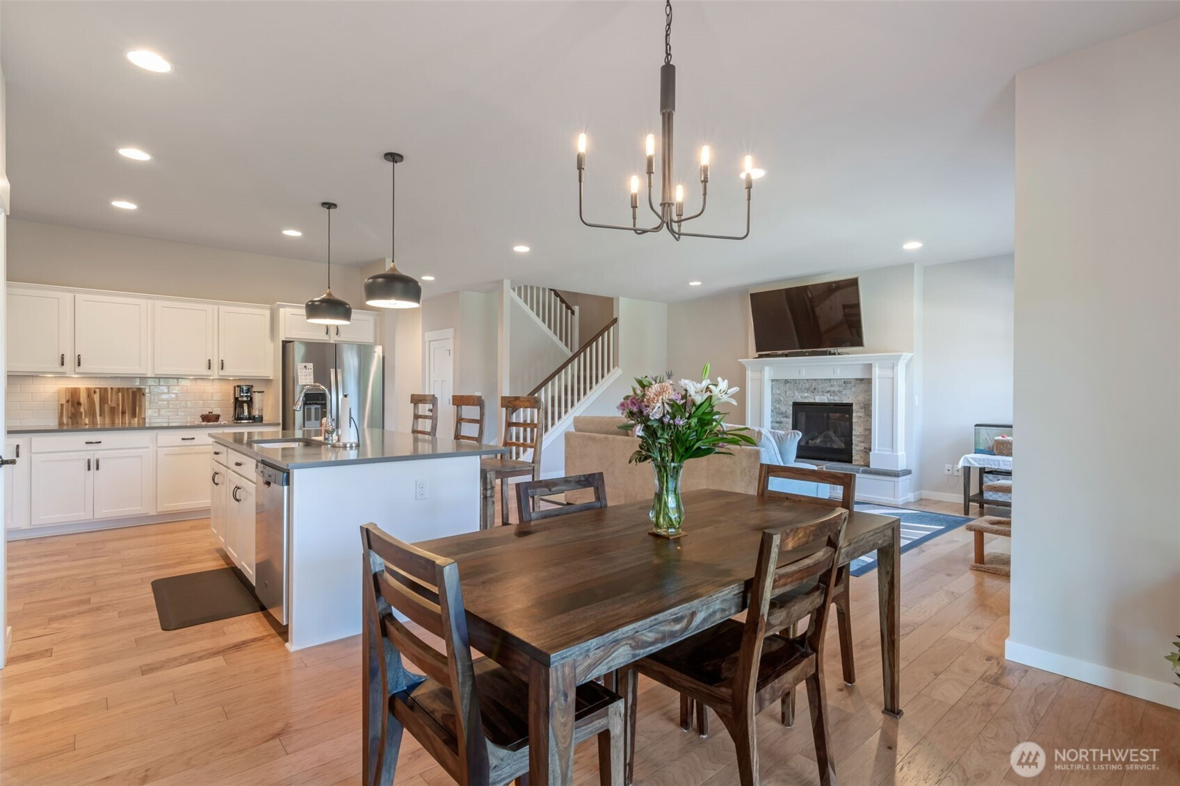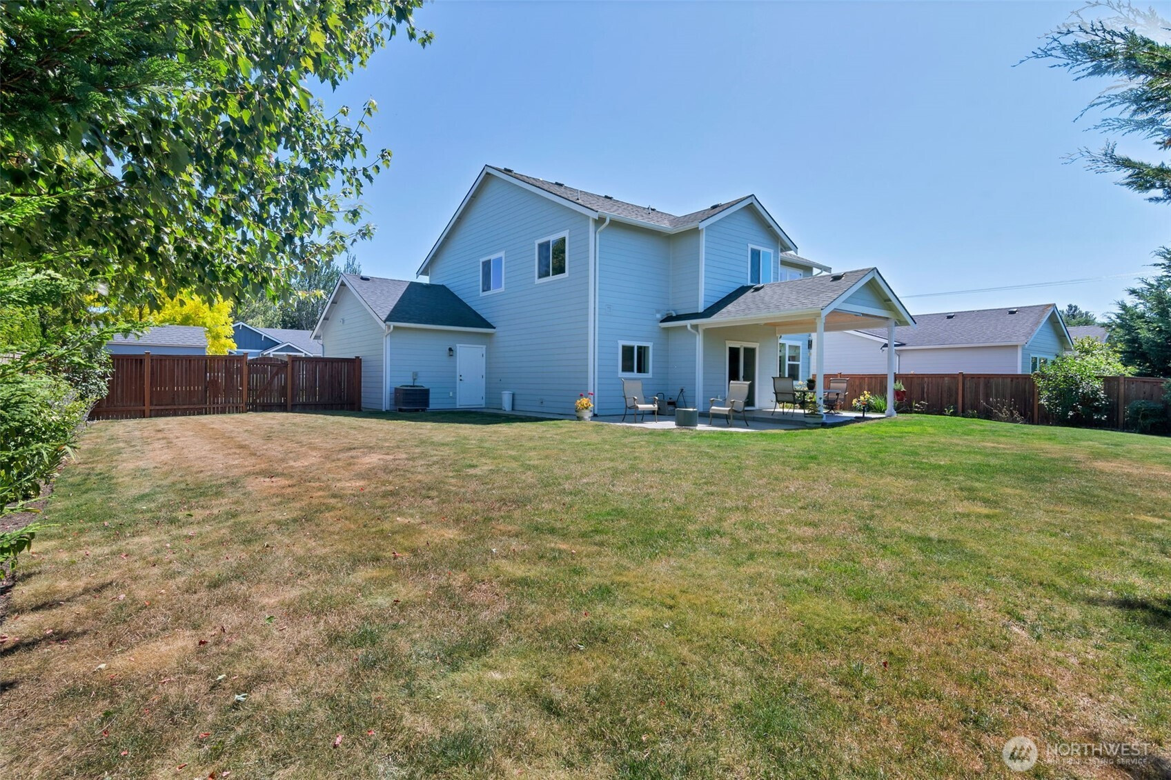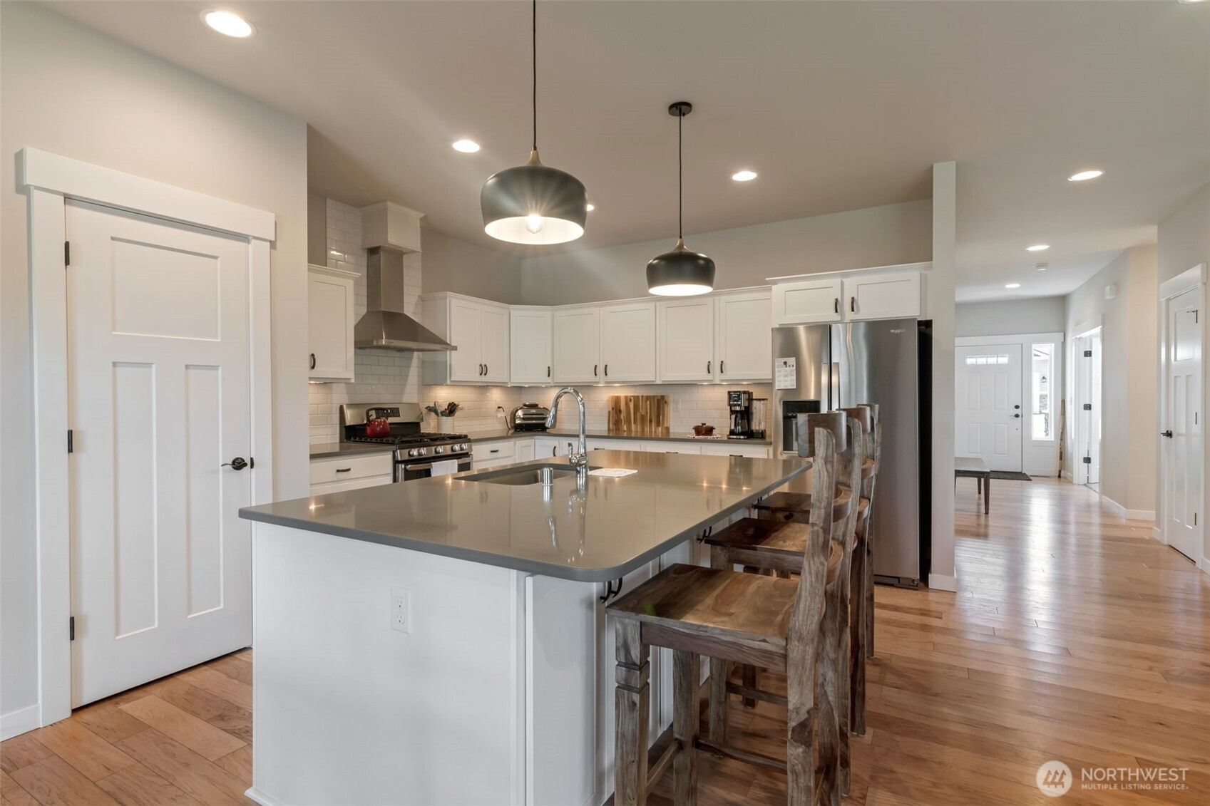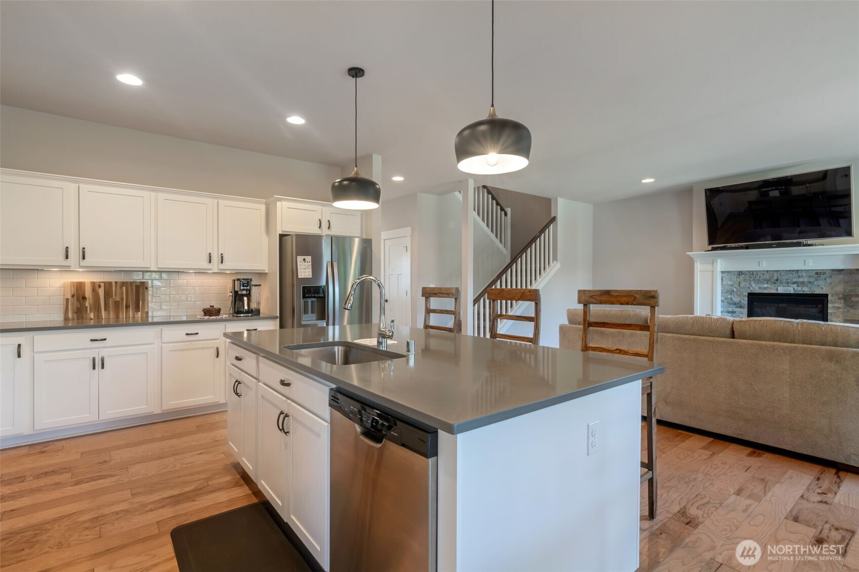 Welcome home to this beautifully appointed craftsman in Stanwood, where thoughtful design meets everyday comfort. The open-concept main level impresses from the moment you step inside, with rich hardwood floors flowing from the welcoming entryway through the spacious living room — anchored by a cozy fireplace — into the chef's kitchen and dining area. The kitchen shines with white cabinetry, a gas range with statement hood, granite counters, a large island with bar seating, and stainless appliances. A main-level office (easily used as a 5th bedroom) adds versatility, while the oversized mudroom and laundry room off the garage keep daily life organized. A full guest bath completes the main floor. Upstairs, the primary suite is a true retreat — vaulted ceilings, a generous walk-in closet, and a luxurious en suite bath with dual vanities, a soaking tub, and a separate shower. Three additional bedrooms, a massive bonus room, and a second full bath with his-and-hers sinks and a private shower/toilet room round out the upper level. Outside, enjoy a covered patio perfect for year-round entertaining, a spacious and private backyard, and a generous side yard — all framed by mature landscaping. The attached two-car garage and wide driveway offer ample parking. This is the one you've been waiting for — space, style, and functionality all in one.
