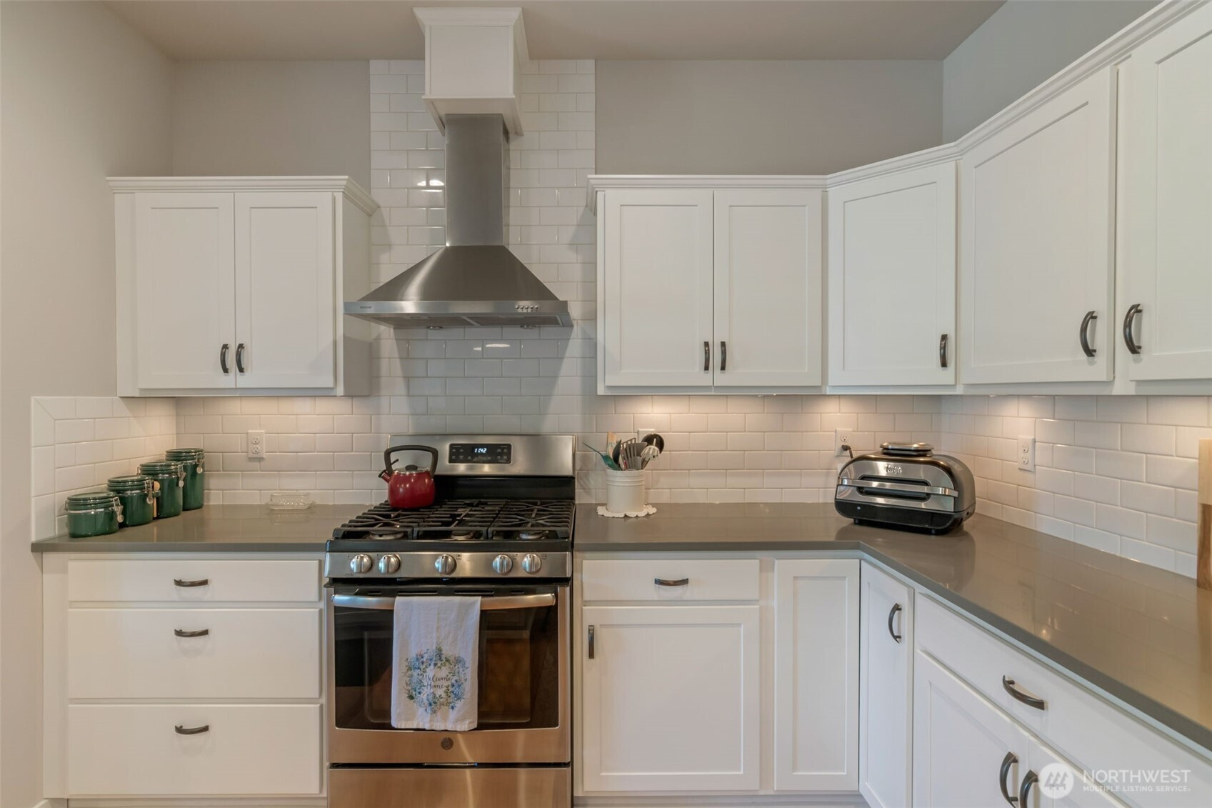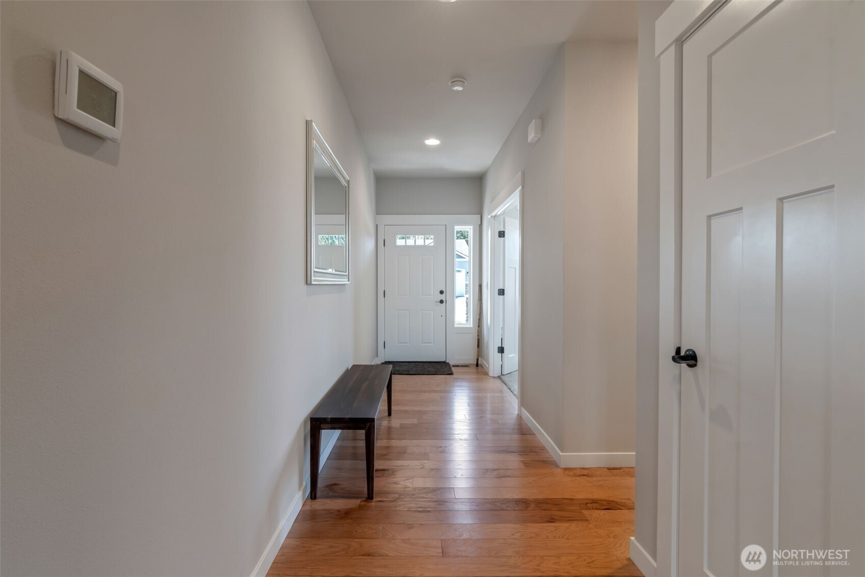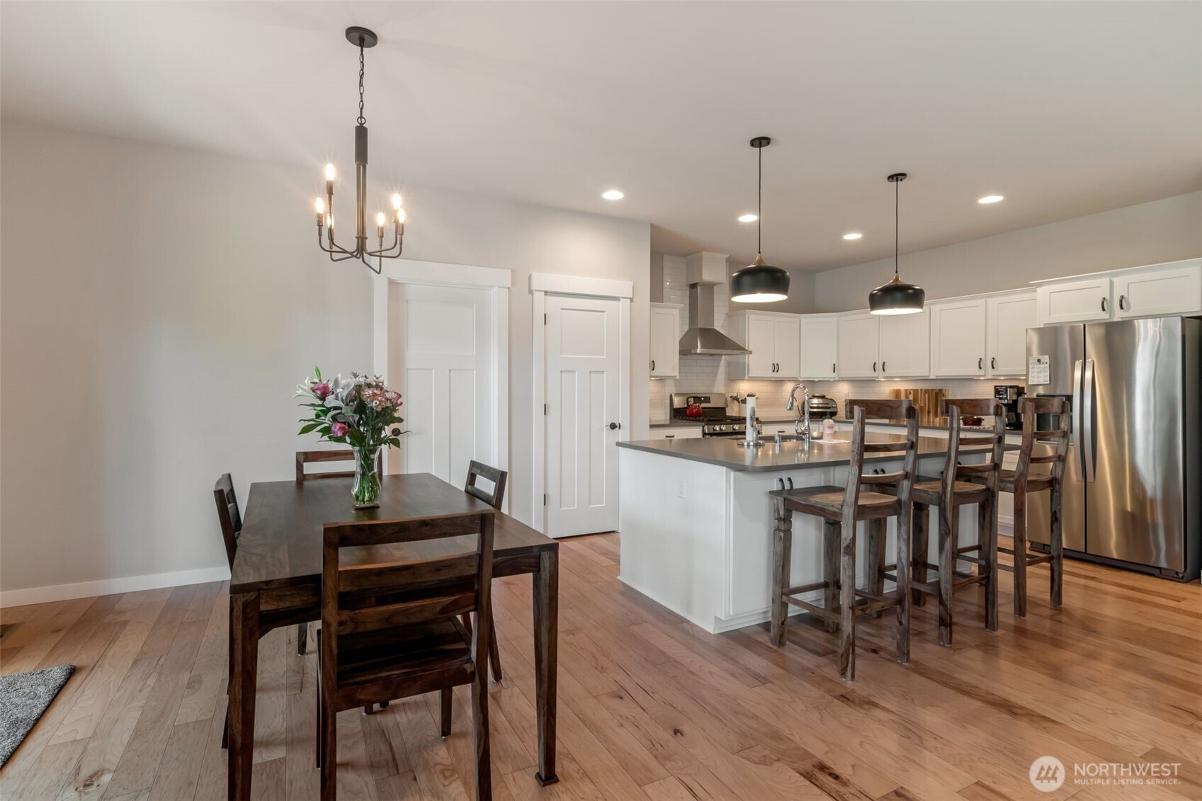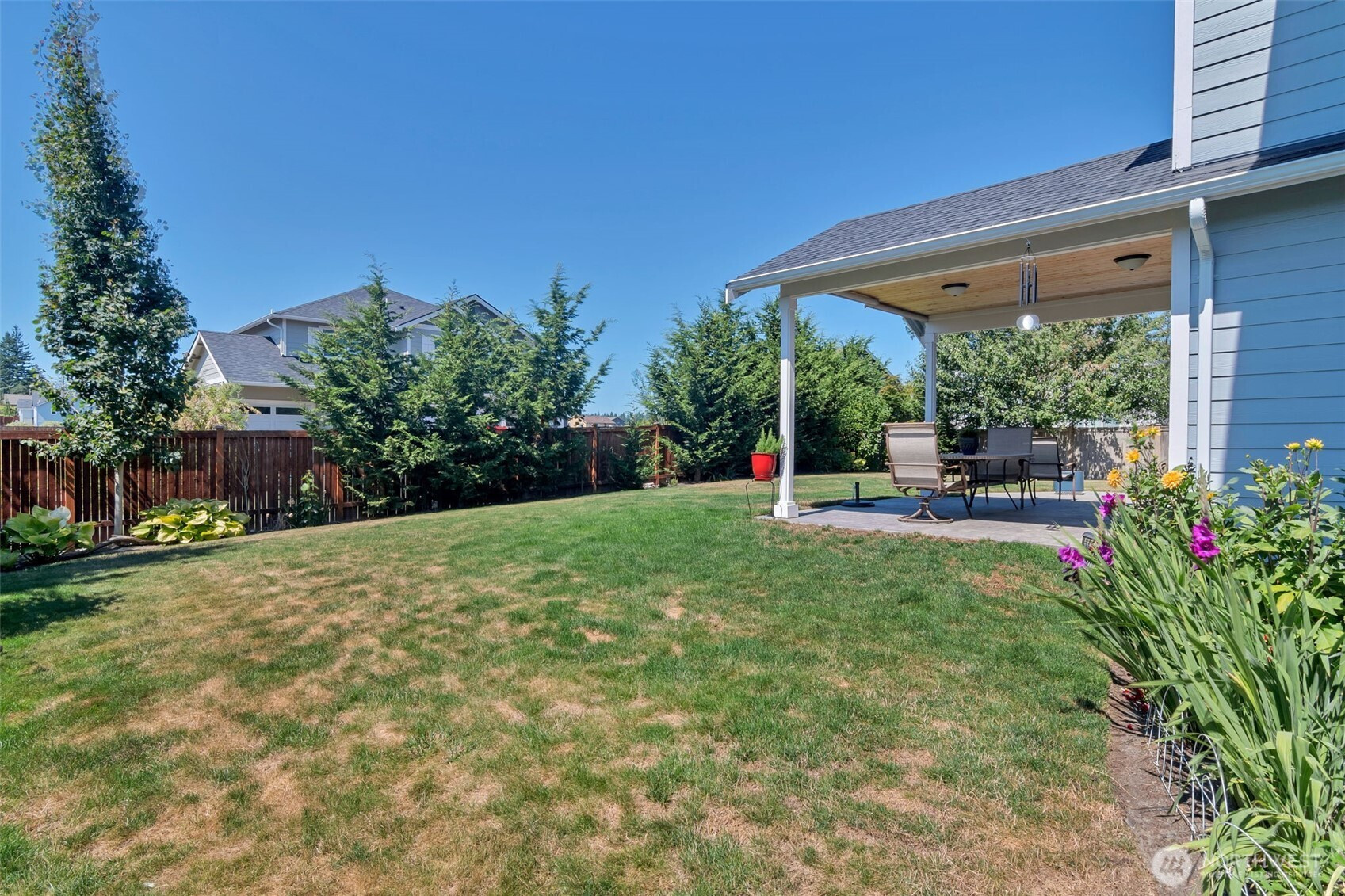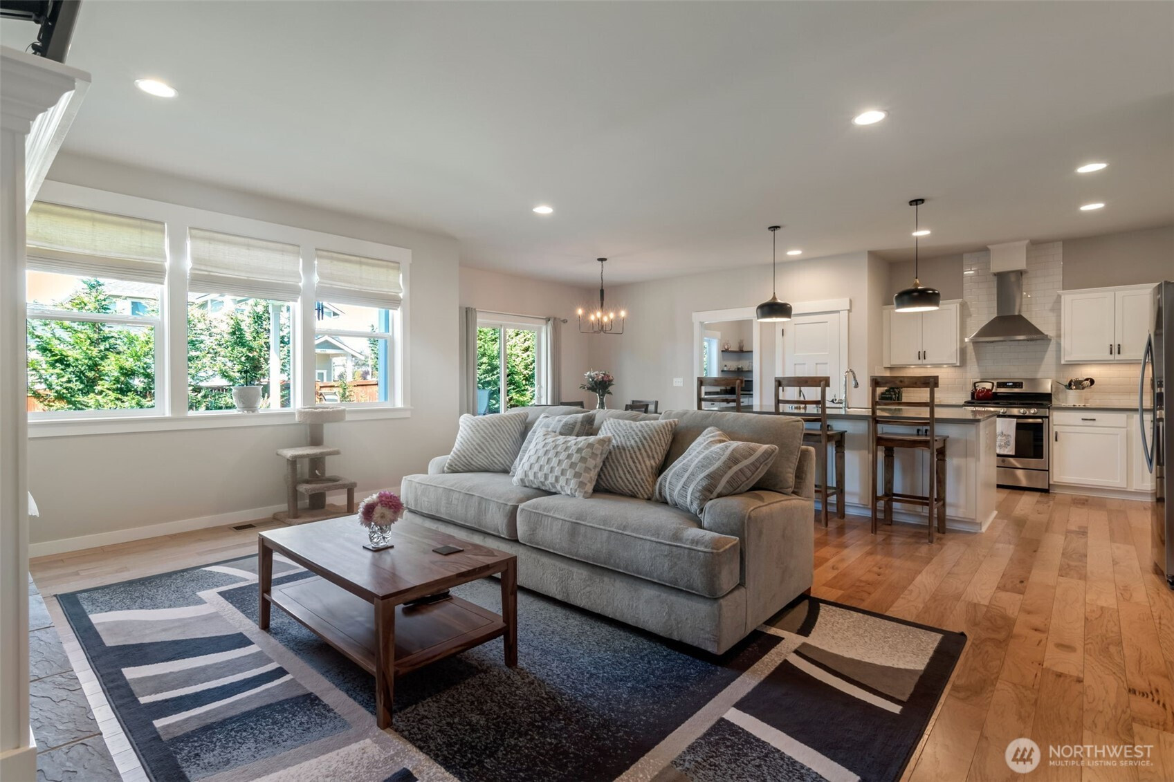 Welcome home to this beautifully appointed craftsman in Stanwood, where thoughtful design meets everyday comfort. The open-concept main level impresses from the moment you step inside, with rich hardwood floors flowing from the welcoming entryway through the spacious living room — anchored by a cozy fireplace — into the chef's kitchen and dining area. The kitchen shines with white cabinetry, a gas range with statement hood, granite counters, a large island with bar seating, and stainless appliances. A main-level office (easily used as a 5th bedroom) adds versatility, while the oversized mudroom and laundry room off the garage keep daily life organized. A full guest bath completes the main floor. Upstairs, the primary suite is a true retreat — vaulted ceilings, a generous walk-in closet, and a luxurious en suite bath with dual vanities, a soaking tub, and a separate shower. Three additional bedrooms, a massive bonus room, and a second full bath with his-and-hers sinks and a private shower/toilet room round out the upper level. Outside, enjoy a covered patio perfect for year-round entertaining, a spacious and private backyard, and a generous side yard — all framed by mature landscaping. The attached two-car garage and wide driveway offer ample parking. This is the one you've been waiting for — space, style, and functionality all in one.