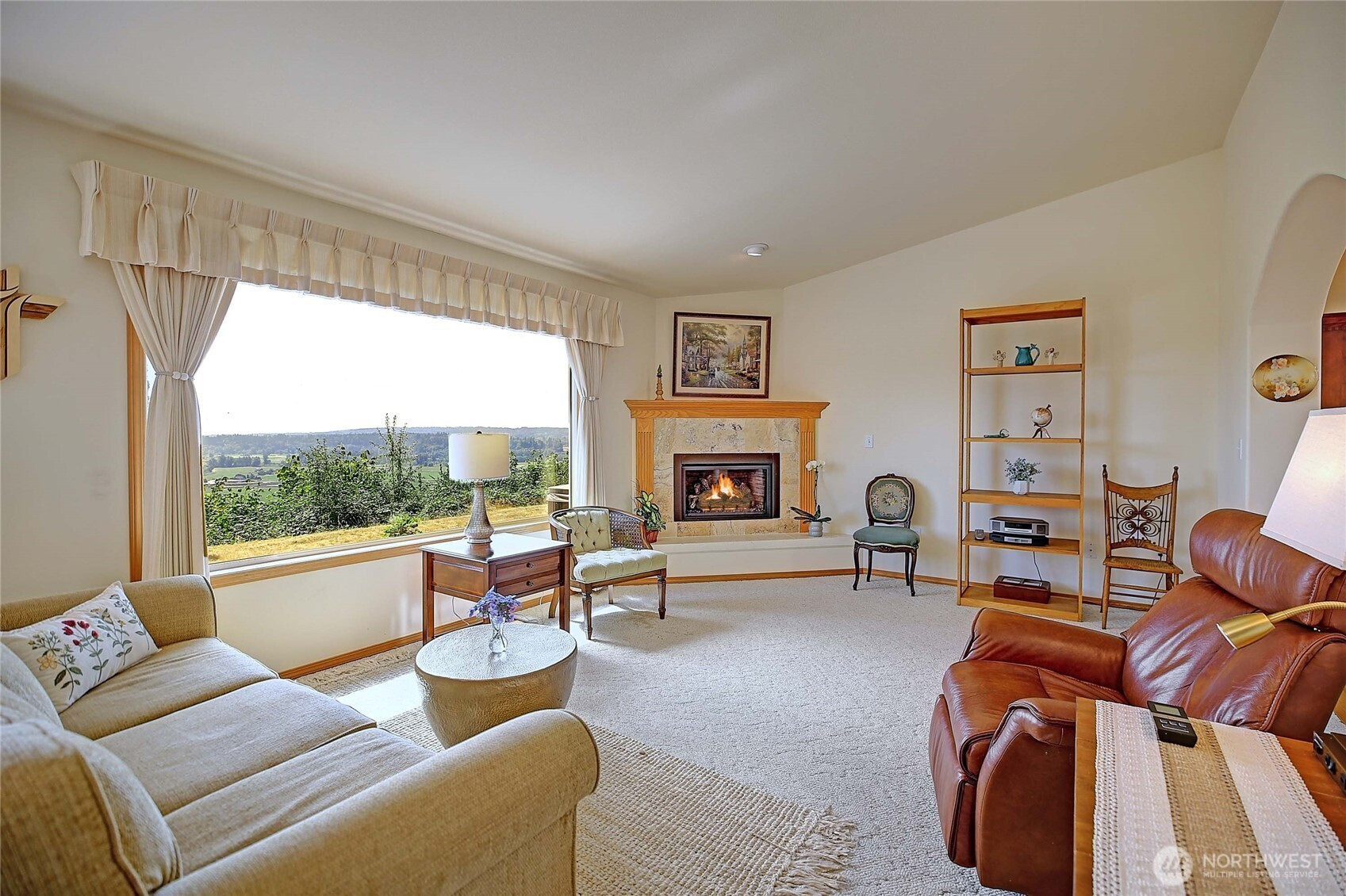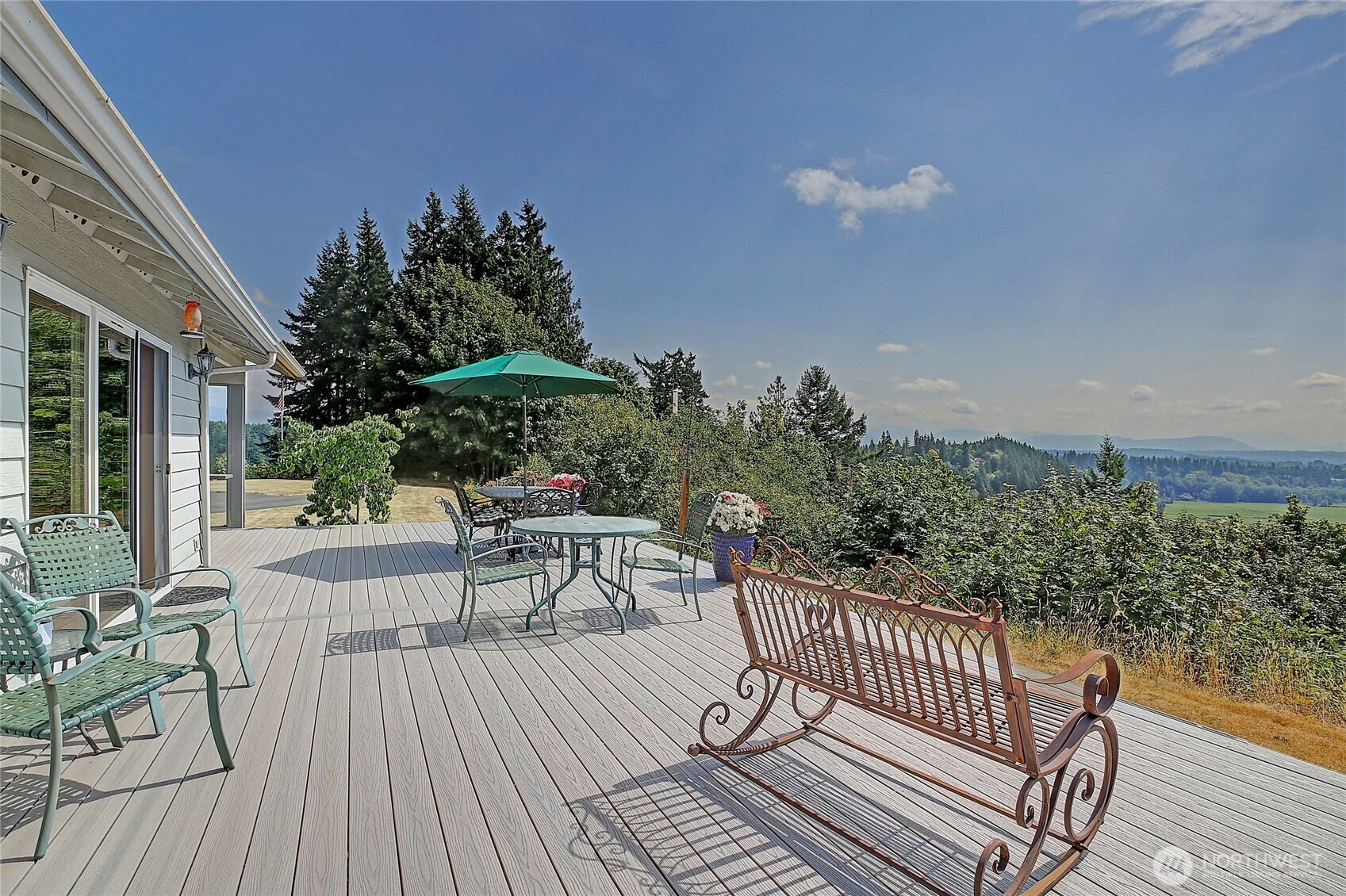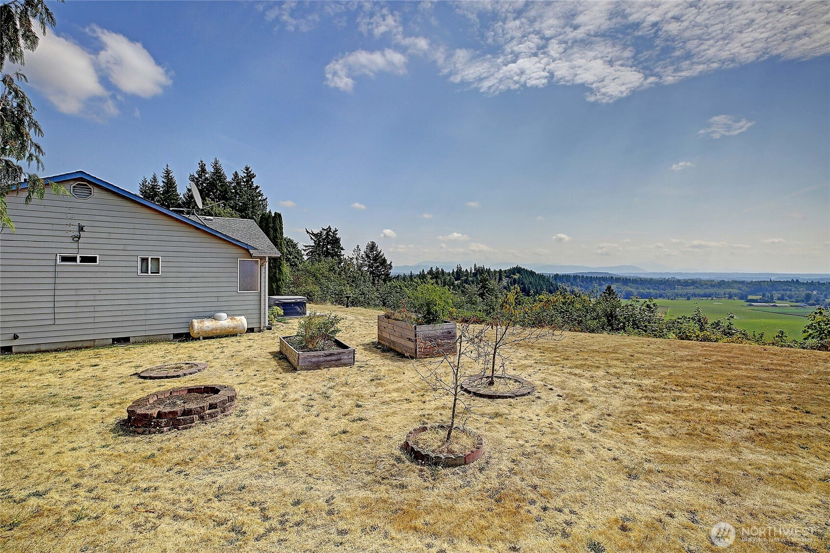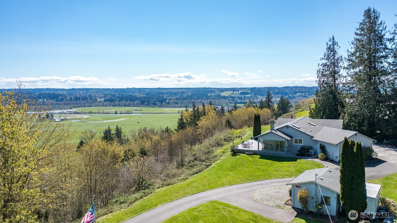 Perched on a stunning bluff with sweeping views of the Cascade Mountains and the picturesque Stillaguamish Valley, this exceptional 3-bedroom, 2.5-bath rambler offers the perfect blend of privacy, beauty, and convenience. Set on 5 acres within a gated community, the home is filled with natural light thanks to expansive windows that frame seamless, breathtaking scenery from nearly every room. Open concept dining room and great room with cozy gas fireplace and slider door opening up onto back deck perfect for large gatherings and BBQs. Home features an additional wood burning fireplace in living room off of the kitchen. Enjoy indoor-outdoor living with a large deck, inviting partially enclosed sunroom, and relaxing hot tub—ideal for taking in the peaceful surroundings. The property also features a 3-car garage with plenty of storage, paved driveway, and multiple sheds and outbuildings for added versatility. All this, just minutes from I-5, making for an easy commute without sacrificing tranquility.