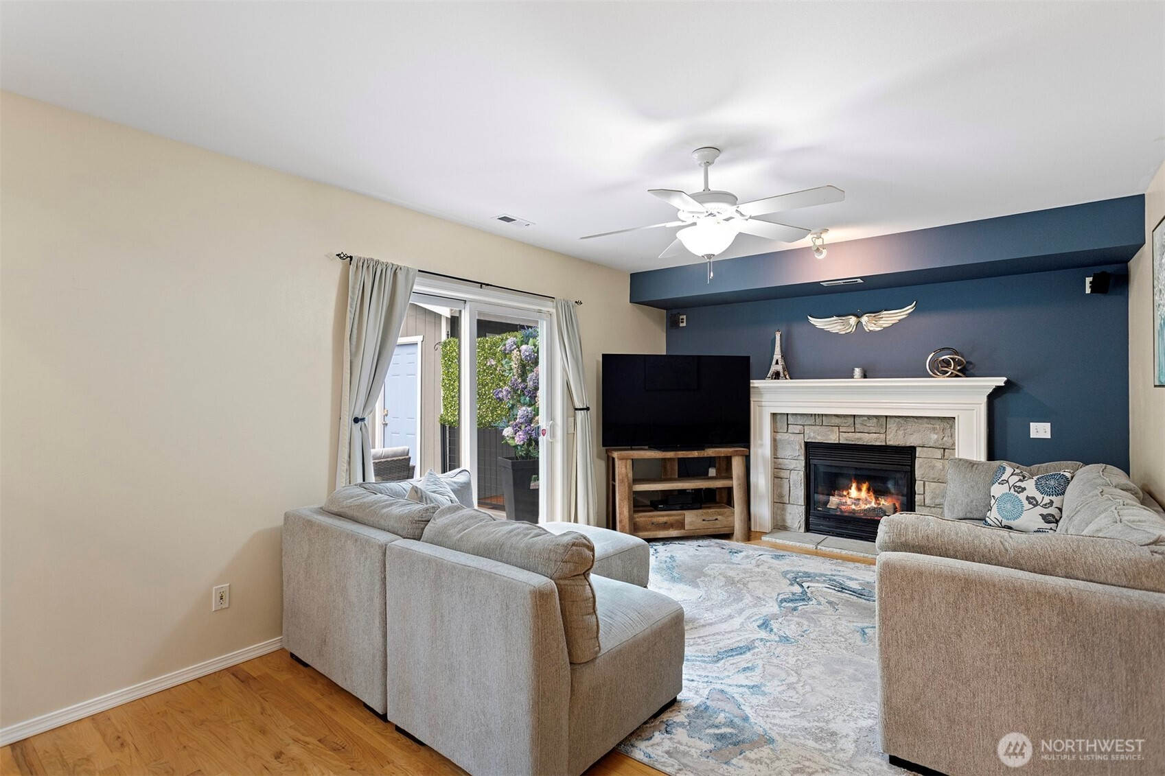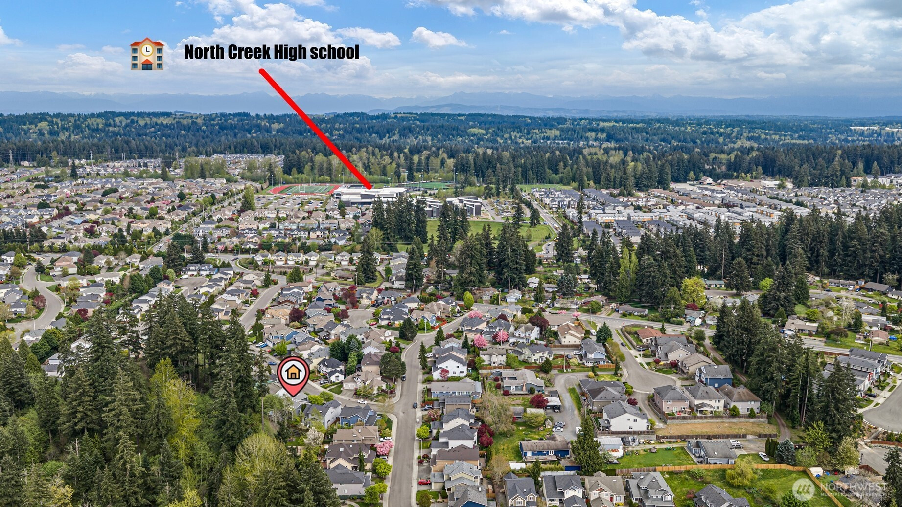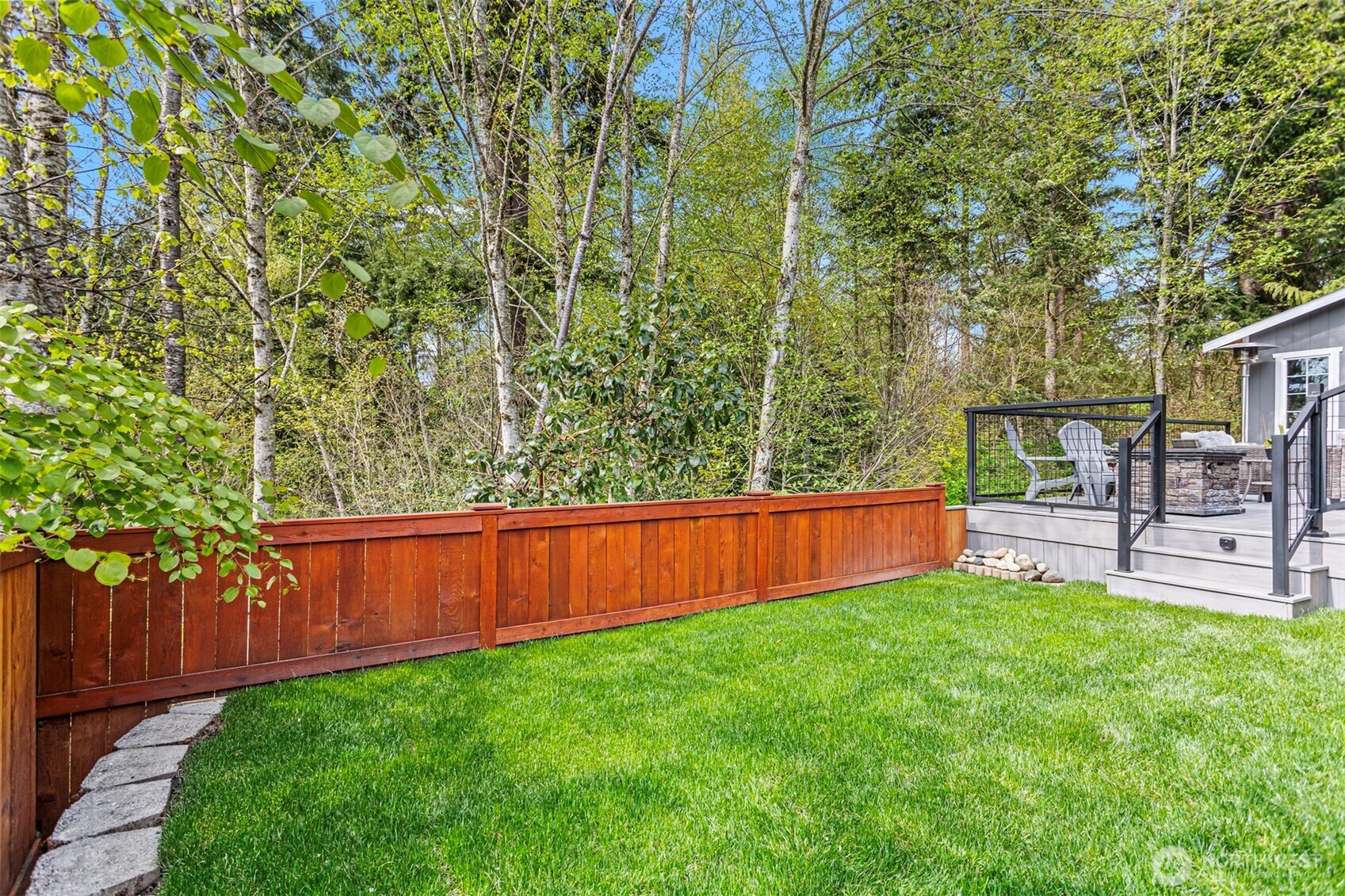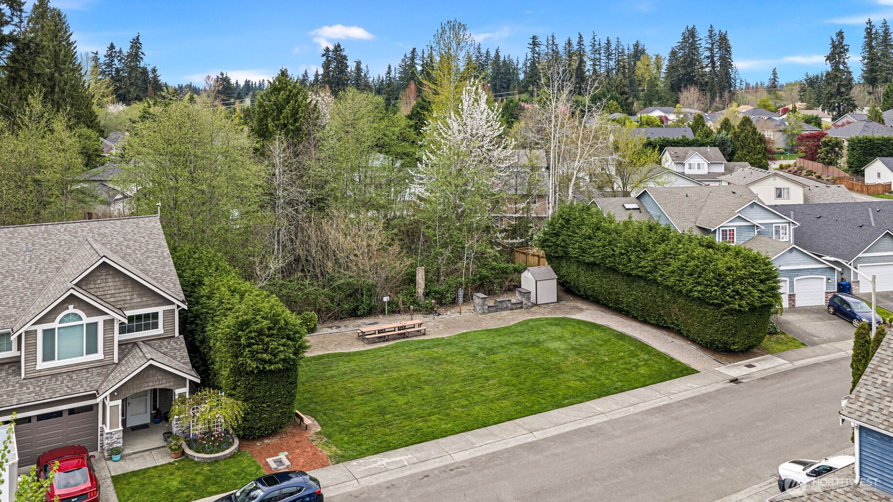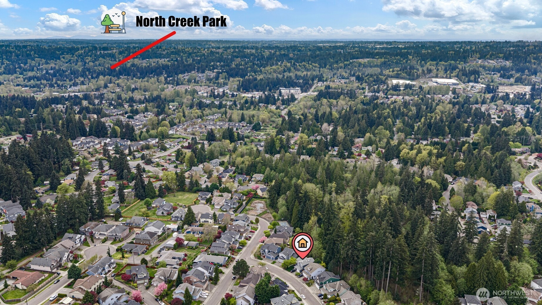 Rare opportunity for a peaceful greenbelt home in Jordyn Park. Meticulously maintained 4-bedroom home, with one bedroom and ¾ bath on the main level, perfect for guests, home office, or workout space. Hardwood floors throughout the main living areas, and ceramic tile in the 3 updated bathrooms. Kitchen has newer stainless-steel appliances and granite counter tops. Two main living areas with spacious formal living room and dining room, and cozy family room with a gas fireplace. Two sliding doors open up to the large composite deck that backs to a protected greenbelt. It is a tranquil space to enjoy warm summer nights as the sun sets behind the tall evergreens. A custom-built shed can house all your gardening tools or deck furniture. Primary bedroom faces the greenbelt as well to enjoy birdsong in the morning and frogs at night. Updated en suite bath with frameless glass shower and soaking tub. Two additional bedrooms upstairs get the morning sunrise. Community areas include a sports court that can be used for basketball, volleyball, tennis and pickleball. The playground and open space is available for use with provided picnic tables. Community events include Easter egg hunts and a Halloween warming station with hot cocoa and cider to warm you on the chilly fall night. Top rated Northshore School District and close to Mill Creek Town center makes this is a perfectly situated home for your next chapter.