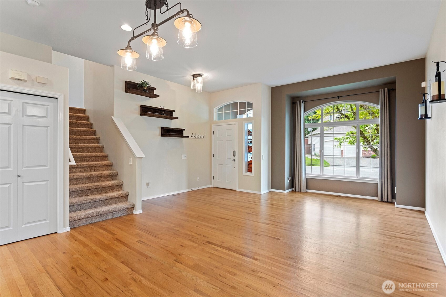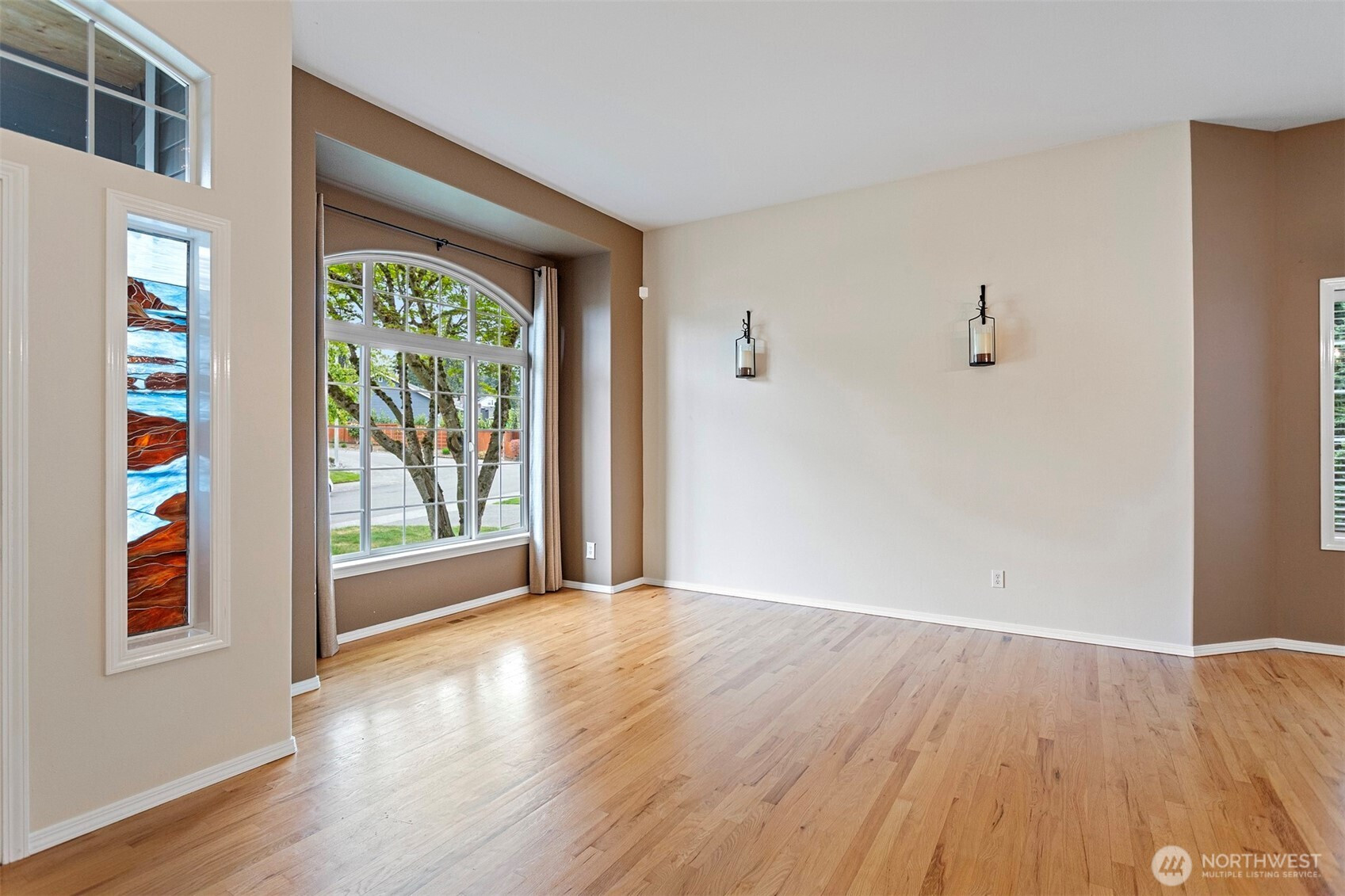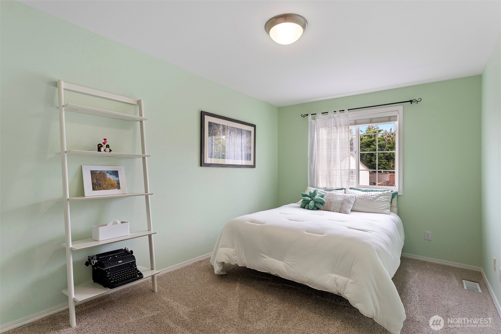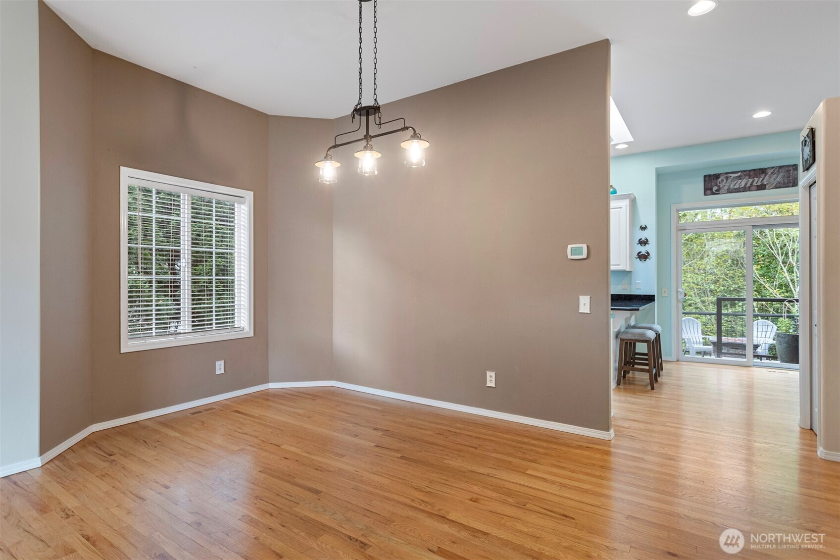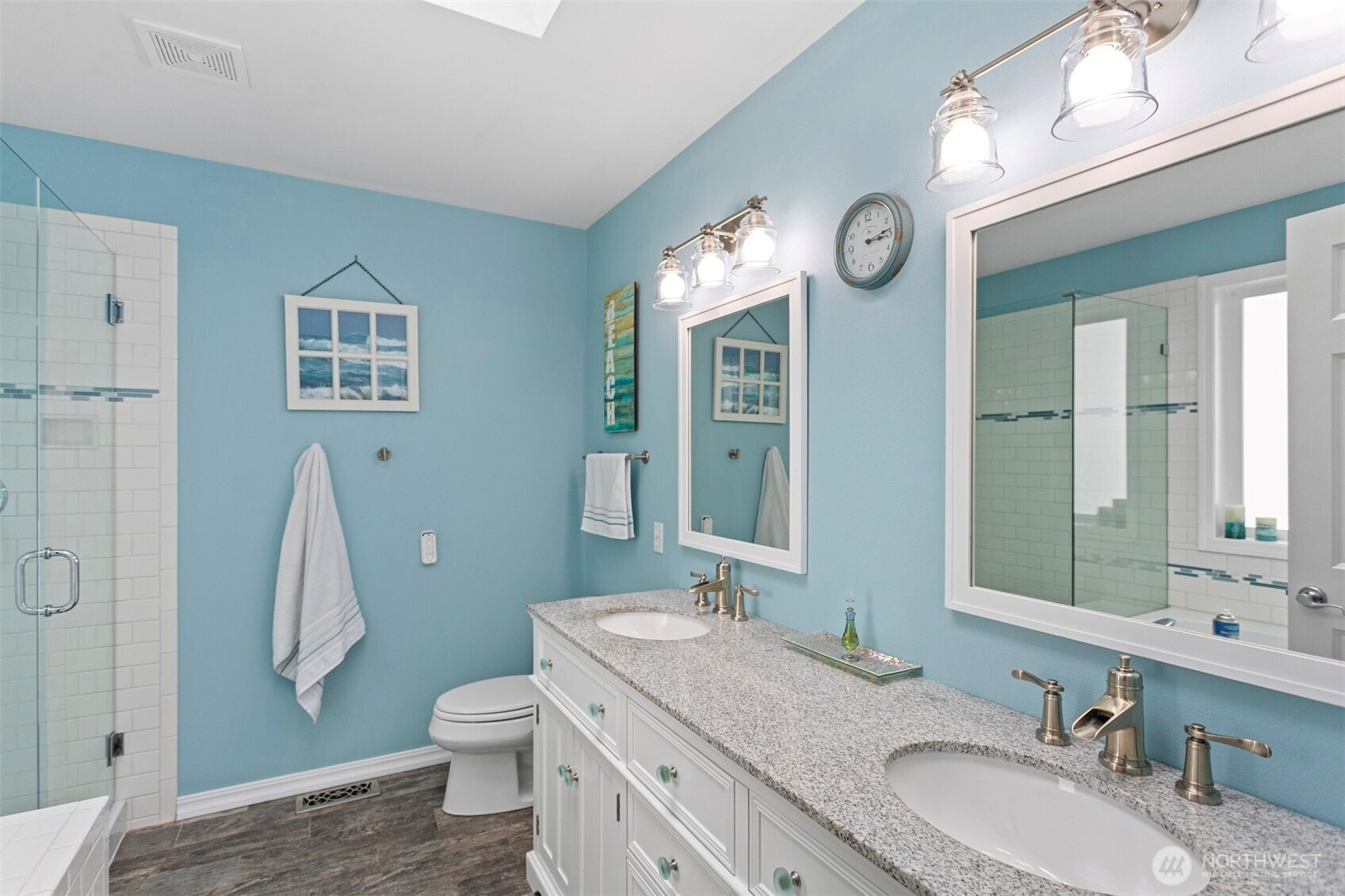 Rare opportunity for a peaceful greenbelt home in Jordyn Park. Meticulously maintained 4-bedroom home, with one bedroom and ¾ bath on the main level, perfect for guests, home office, or workout space. Hardwood floors throughout the main living areas, and ceramic tile in the 3 updated bathrooms. Kitchen has newer stainless-steel appliances and granite counter tops. Two main living areas with spacious formal living room and dining room, and cozy family room with a gas fireplace. Two sliding doors open up to the large composite deck that backs to a protected greenbelt. It is a tranquil space to enjoy warm summer nights as the sun sets behind the tall evergreens. A custom-built shed can house all your gardening tools or deck furniture. Primary bedroom faces the greenbelt as well to enjoy birdsong in the morning and frogs at night. Updated en suite bath with frameless glass shower and soaking tub. Two additional bedrooms upstairs get the morning sunrise. Community areas include a sports court that can be used for basketball, volleyball, tennis and pickleball. The playground and open space is available for use with provided picnic tables. Community events include Easter egg hunts and a Halloween warming station with hot cocoa and cider to warm you on the chilly fall night. Top rated Northshore School District and close to Mill Creek Town center makes this is a perfectly situated home for your next chapter.
