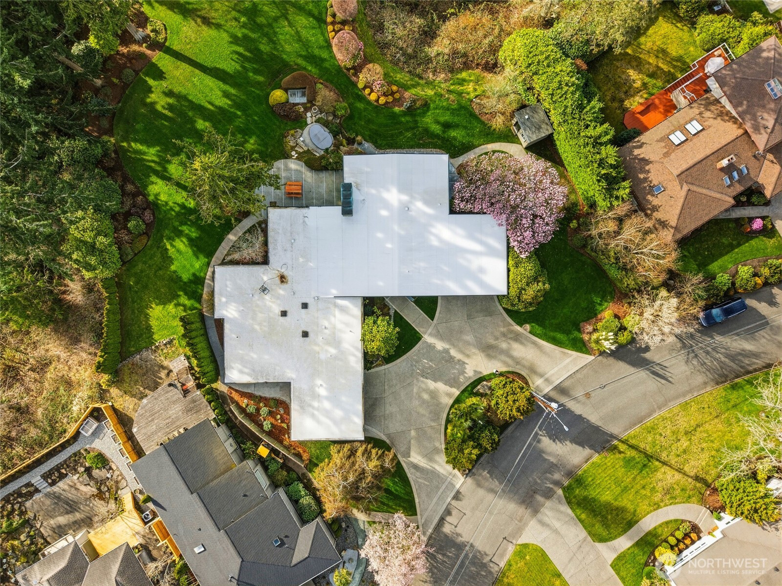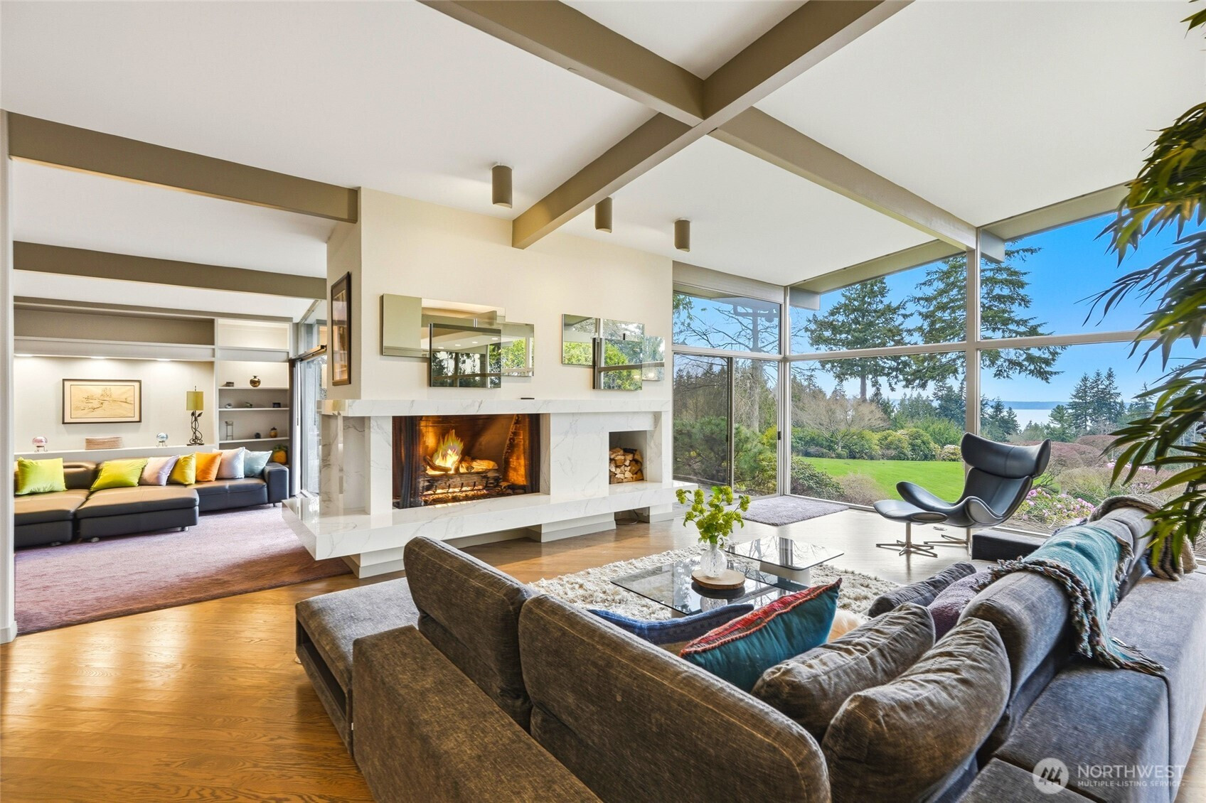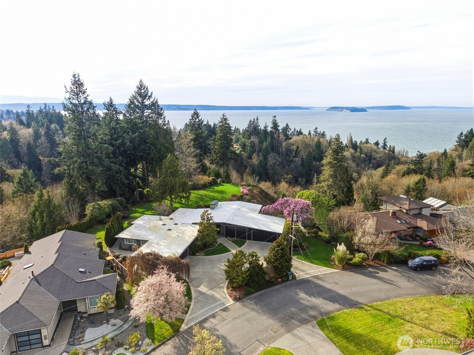 Spectacular views highlight this mid-century rambler with a daylight basement, ideally located in View Ridge on nearly two acres of private, serene grounds. Offering more than 3,500 square feet on the main level, this home showcases expansive living spaces, soaring ceilings, and stunning new floor-to-ceiling windows that capture the surrounding scenery. The updated kitchen features quartz countertops, new cabinetry, and modern finishes, while recent upgrades including a new roof, heat pump, and hot water tanks provide comfort and peace of mind. The spacious primary suite with view and beautiful bathroom completes the main floor retreat. Downstairs, the fully finished daylight basement adds another 3,500 square feet with a large rec room and wet bar that also enjoys views of Puget Sound. In addition, there is a second rec room, an exercise room, an office, a work shop, and abundant storage—offering excellent potential for a second living space. Two attached garages with four total stalls complete this exceptional property.