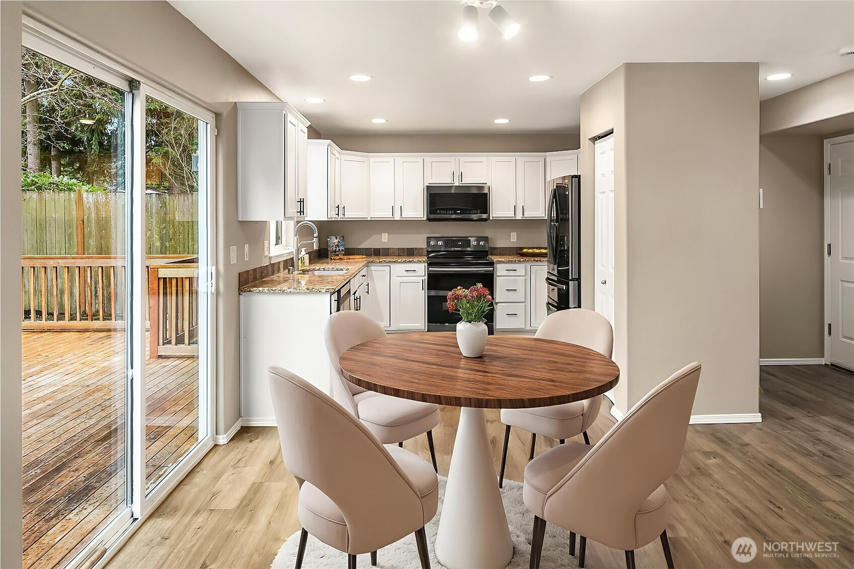 Tucked away on a private drive, this beautifully maintained home lives like a single-family residence while offering the ease of a well-designed community. Inside, a formal living room pairs with a spacious great room anchored by a cozy gas fireplace. The kitchen features freshly painted cabinetry, granite counters, and Samsung appliances. Upstairs, the generous primary suite includes a walk-in closet and a stunningly updated bath with a frameless glass shower. A versatile sky lit loft provides the perfect flex space for work or relaxation, complemented by an upstairs laundry with new washer and dryer. Recent upgrades include newer carpet, LVP flooring, freshly painted trim and interior doors, and exterior paint completed within the last four months. Comfort comes easy with A/C, a two-year-old furnace, newer water heater, and Leaf Guard gutters. Outside, enjoy a fully fenced yard, expansive deck, and low-maintenance landscaping ideal for outdoor living. A nearby park and play area enhance the neighborhood charm. Minutes to amenities. Welcome home.