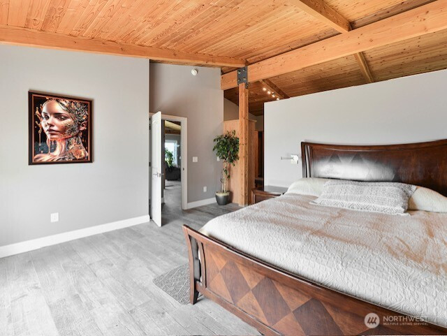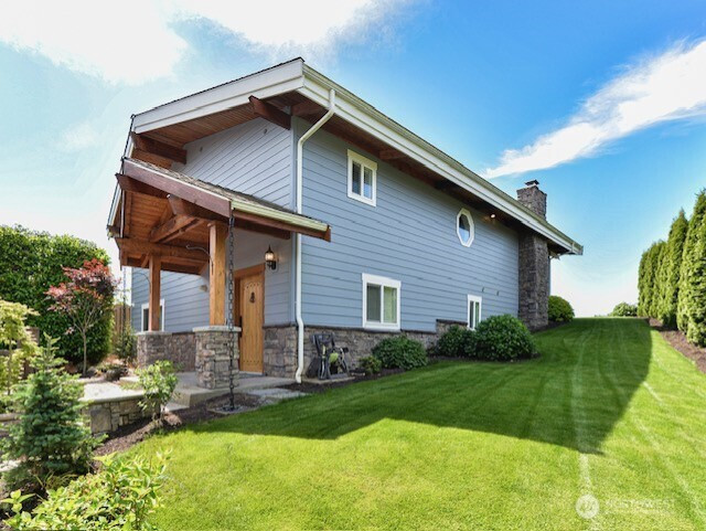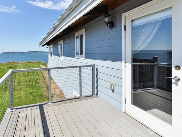 Keybox and sign to be installed Saturday morning. Panoramic Puget Sound and Olympic Mountain views from this 66’ high-bank waterfront /property. Fully remodeled in 2017 ($735K) with the addition of a 4-car garage and a 950 sq ft DADU, totaling approx. 3,450 sq ft on privately owned land (no lease). Main home features a spacious primary suite with private view balcony, walk-in closet, and heated floors in bathroom. Open-concept great room with vaulted ceilings, fireplace, and chef’s kitchen with granite counters and Thermador propane range. Nano doors fold back 18 feet to open to a Trex deck for seamless indoor-outdoor living. Lower level offers two oversized bedrooms—ideal for guests, office, or media space. DADU over the garage includes kitchen, fireplace, W/D hookups, and ¾ bath. Great for short or long term rental. Gated entry, manicured landscaping, and stamped concrete driveway. Sandy beach access via community area plus $175K bulkhead (2020). Just 20 minutes to downtown Everett.
