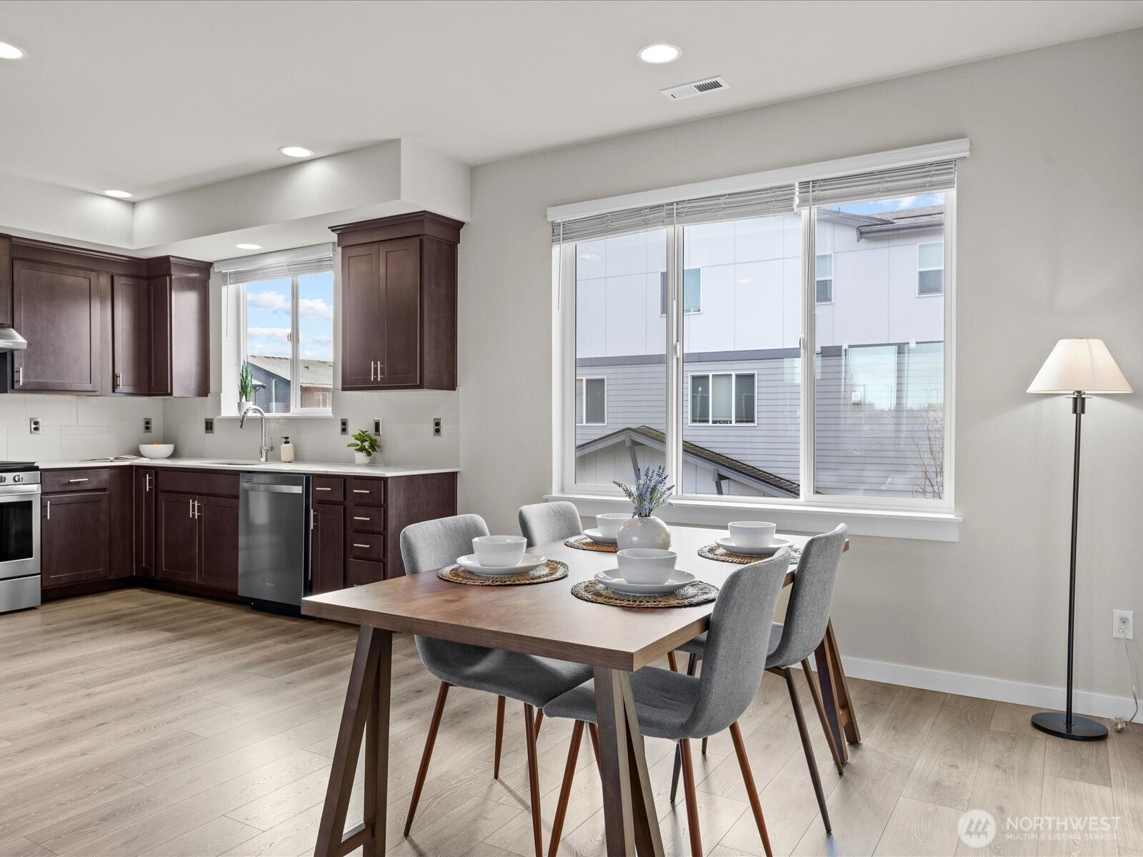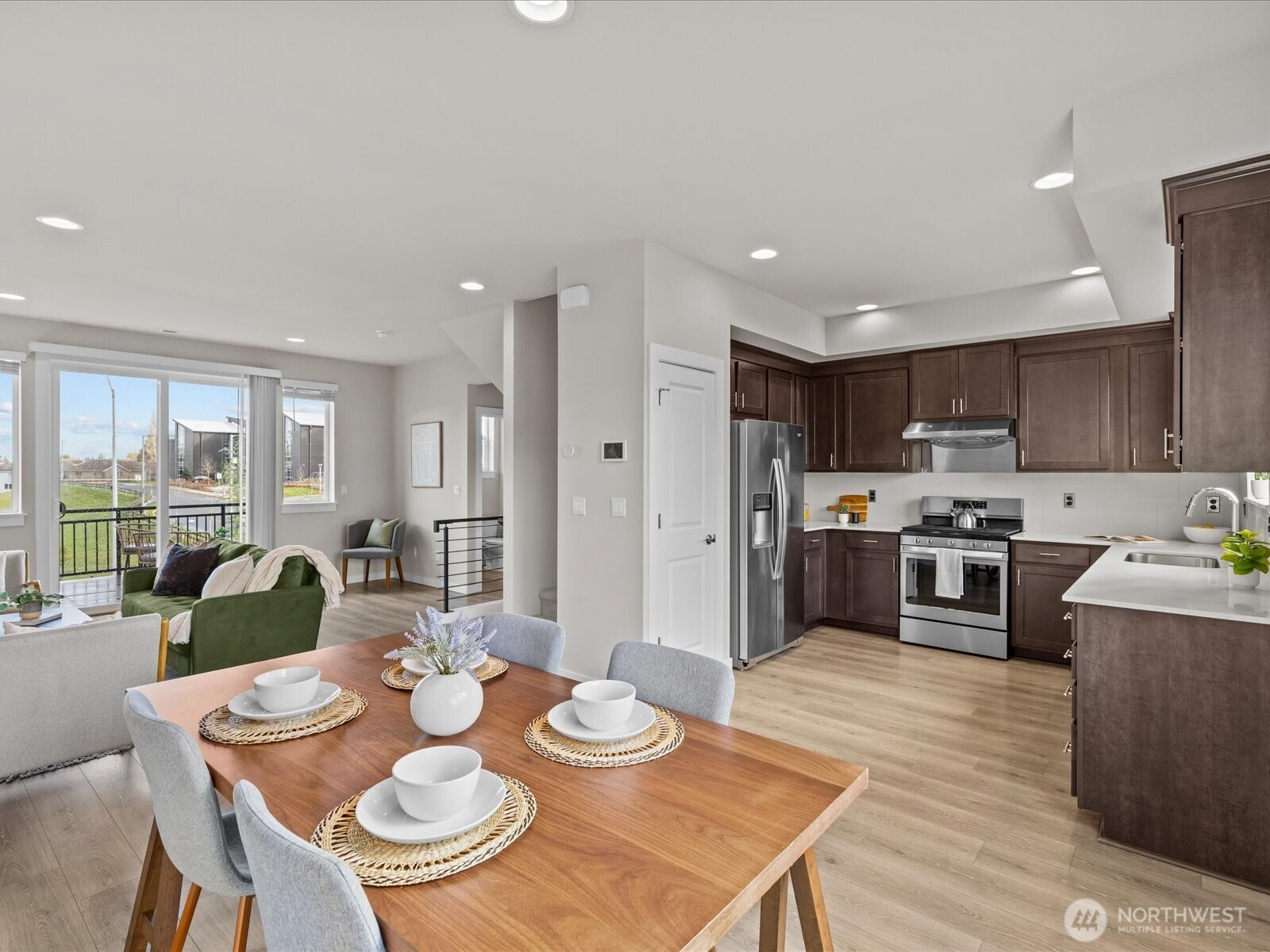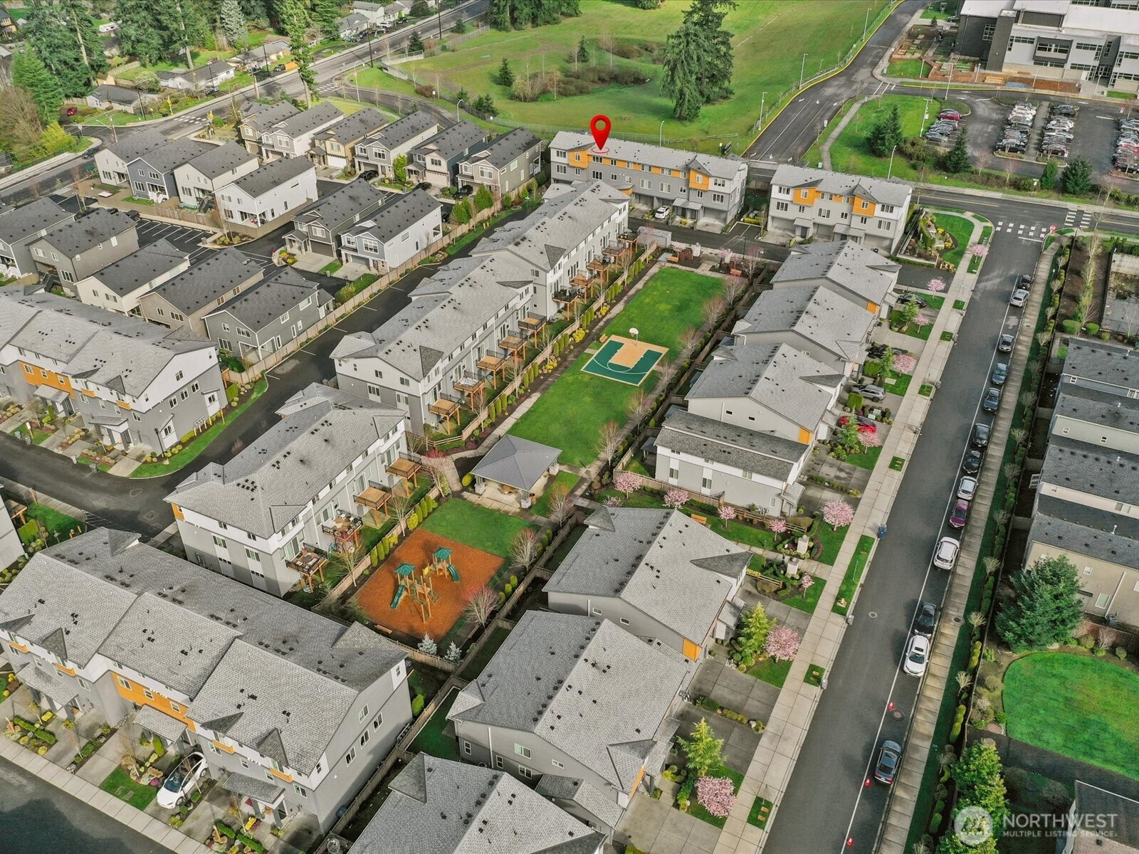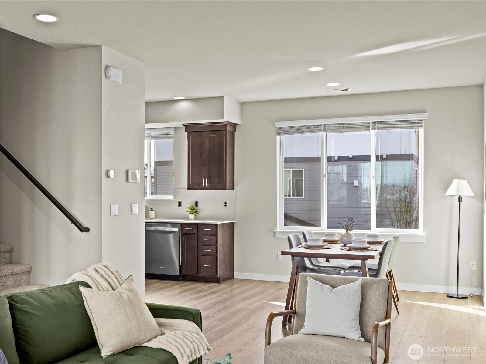Welcome to this beautifully maintained 2-bedroom, 2.5-bath townhome in Central Park Townhomes in Bothell. Thoughtfully designed with an open-concept layout, this home features abundant natural light, quartz countertops, stainless steel appliances, and a seamless flow ideal for everyday living and entertaining. Recent updates include fresh interior paint and modern smart switches compatible with Google Nest for added convenience. The spacious garage offers ample parking and extra storage space. Step outside to a private patio that backs up to open green space—perfect for relaxing or enjoying seasonal activities. The community offers an athletic court, playground, and a pavilion with picnic tables, creating inviting outdoor spaces to enjoy. Ideally located just steps from the neighborhood park and close to shopping, dining, and commuter routes. Situated within the Northshore School District, including Fernwood Elementary and Northshore High School. A wonderful opportunity to own a home in a welcoming community with convenient access to everything Bothell has to offer.