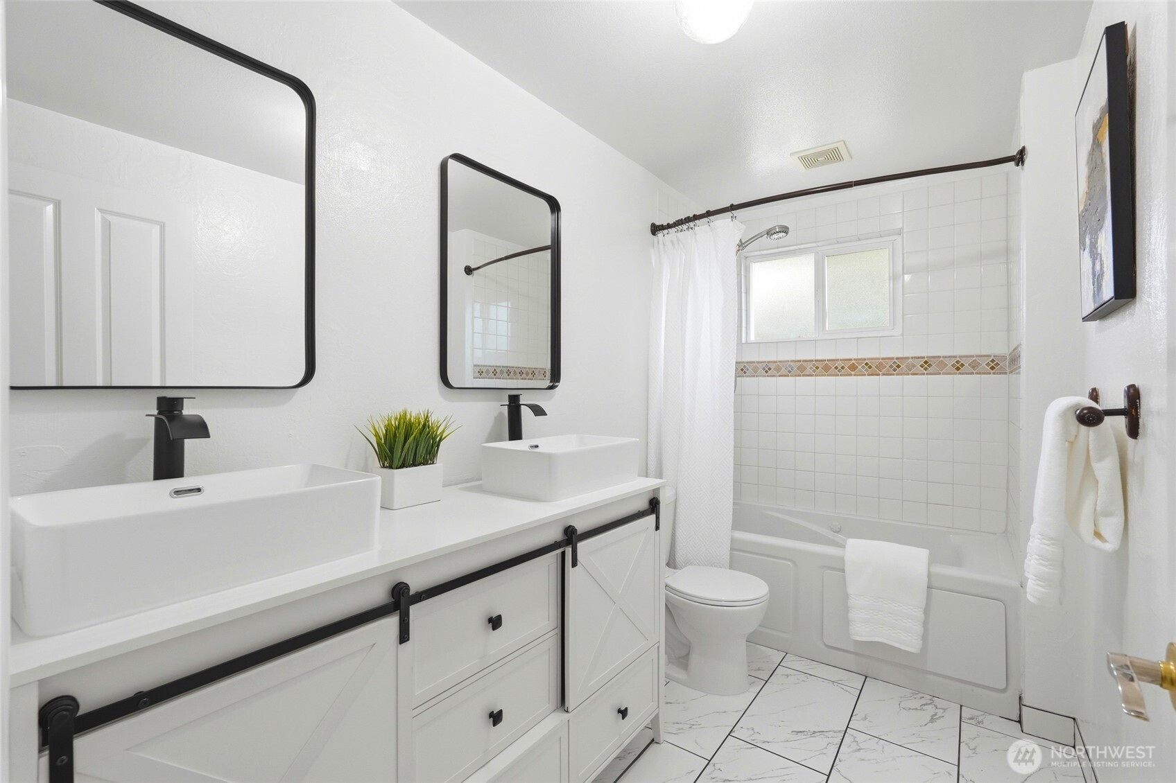 Great home in a fantastic, central location in South Lake Stevens. Refreshed inside and out, this split-level home sits on a large lot offering tons of parking, including paved & covered boat/RV parking and a freshly seeded backyard that is a blank canvas for your vision: garden beds, firepit, and whatever else you can conceptualize (you'll have room for it all). New flooring, carpet, interior paint throughout. The main bathroom has been refreshed with a new vanity and mirror, adding a clean, modern touch to the space. Covered deck off dining area perfect for year-round enjoyment. This home is clean, solid, and move-in ready!