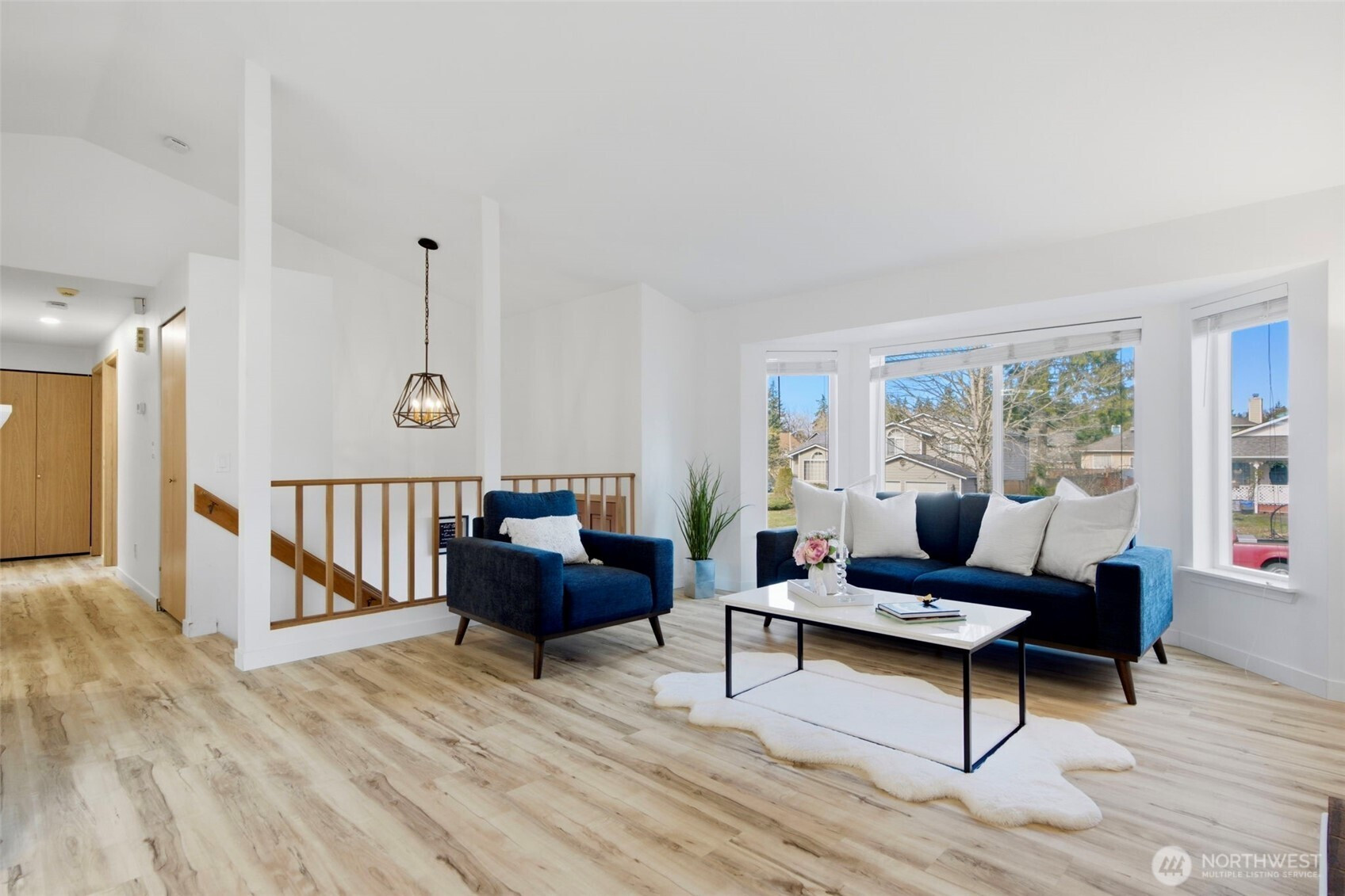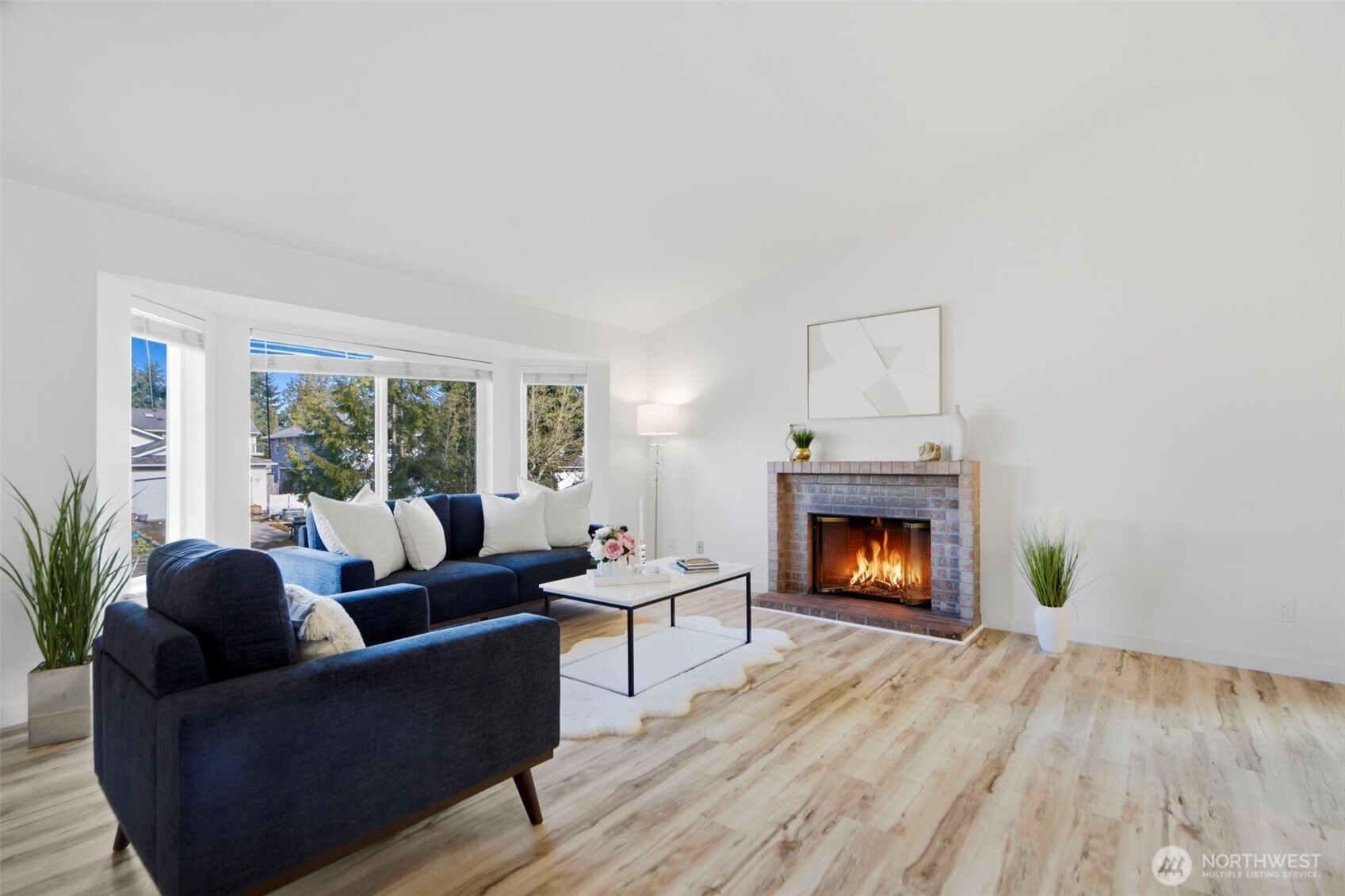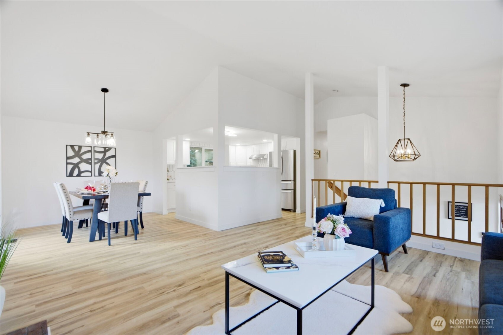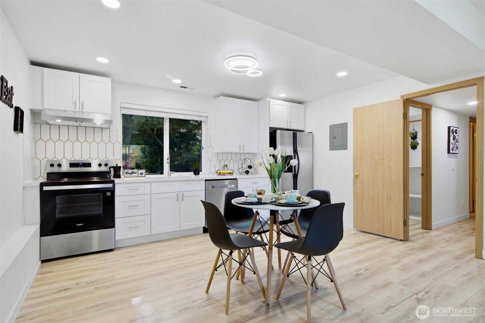 Located on a quiet cul-de-sac, this well-maintained 4-bedroom, 3-bath home offers 1,924 sq ft of versatile living space on a 7,405 sq ft (.170 acre) lot. The bright living room features a dramatic cathedral ceiling and cozy fireplace, creating a warm and inviting atmosphere. A deck just off the main dining area and kitchen provides seamless indoor-outdoor flow for entertaining. The lower level offers excellent flexibility with a bedroom, bathroom and spacious family room, making it ideal for a potential mother-in-law suite.Separate kitchens and laundry areas provide outstanding opportunity for rental income or multigenerational living. Extensive updates include new lighting, fresh interior paint, new electrical, new flooring, new deck. The lower and upper kitchens were updated in December 2025. Furnace was installed at end of 2024. Siding and exterior paint were completed in 2021, and bathrooms were fully updated in 2022. Conveniently located near Spruce Park and within the Edmonds School District, just minutes to Costco, Fred Meyer, Alderwood Mall, Walmart, Target and numerous dining options. Easy access to I-5, I-405 and light rail makes commuting simple. This home combines functionality, modern updates and an excellent location in one attractive package.