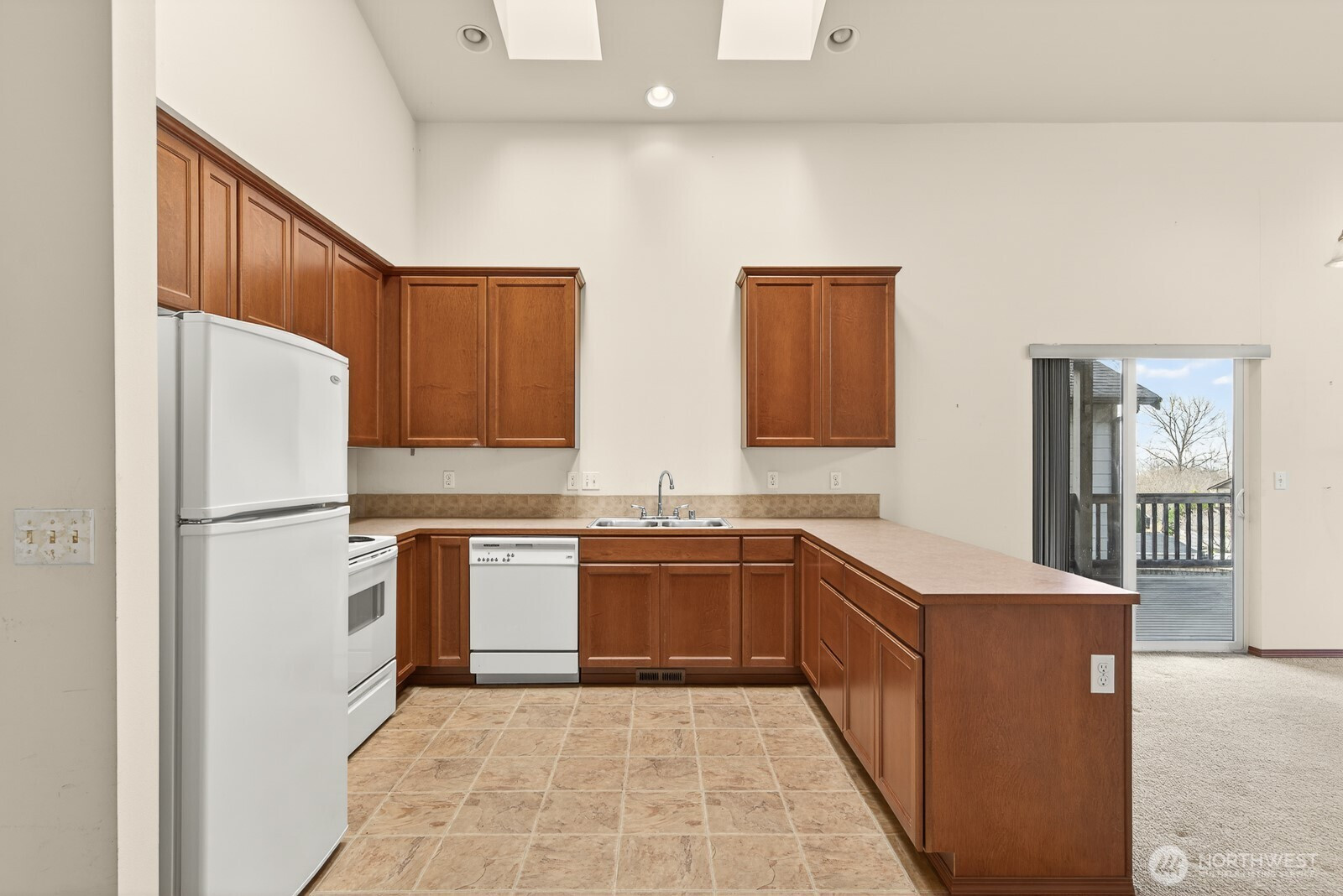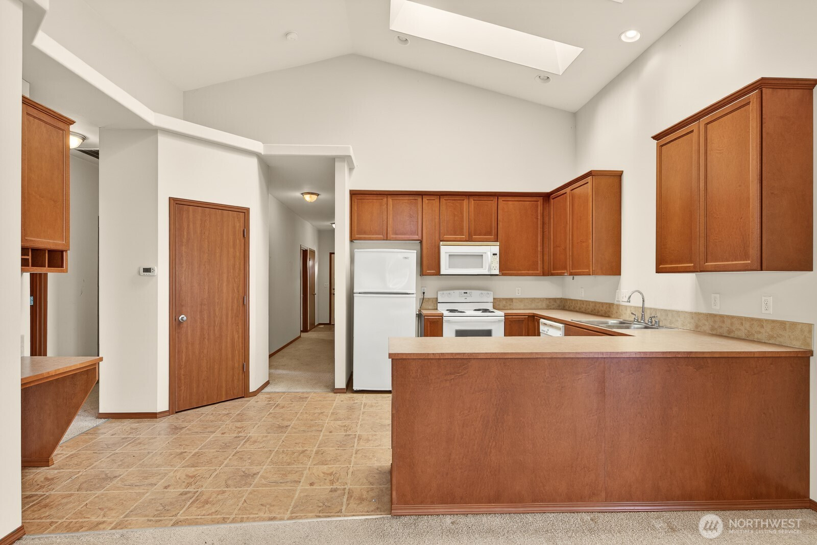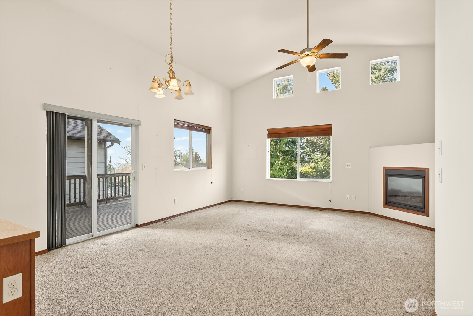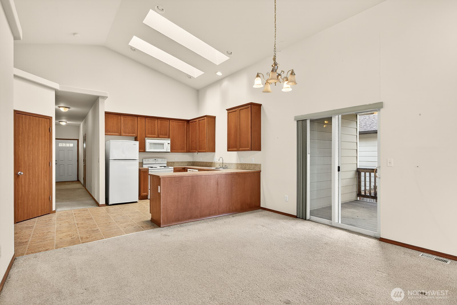 Rambler in a great neighborhood! 3 bed, 2 bath with tall vaulted ceilings in kitchen and living room that gives it a larger feel. Kitchen has lots of cabinet space and all appliances are included. Living room features a gas fireplace and a glass slider out to the covered deck. Primary bedroom also has vaulted ceilings as well as two closets. Laundry room is plumbed for possibility of a future utility sink. Extra deep garage makes room for a 3rd car or shop space? Workout area? Storage? You name it! The backyard is fully fenced and ready for fun! Come make this great single level home your own!