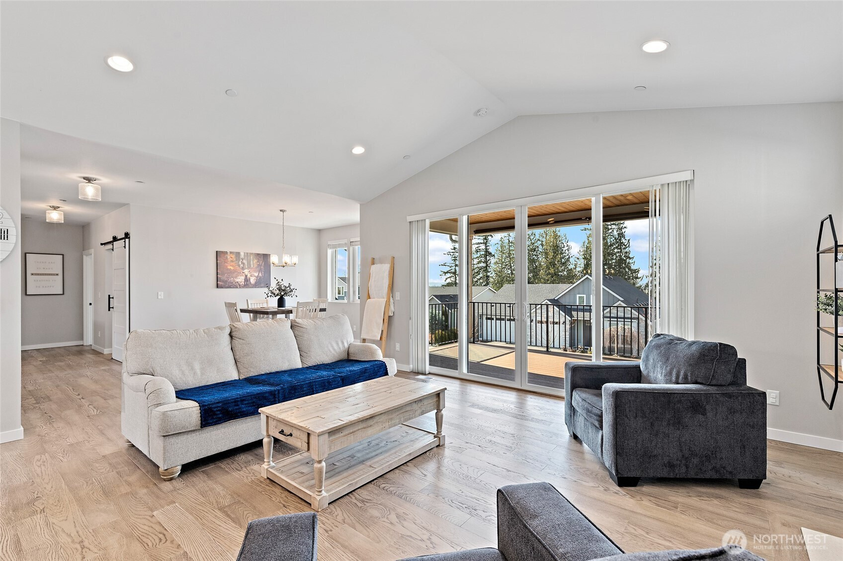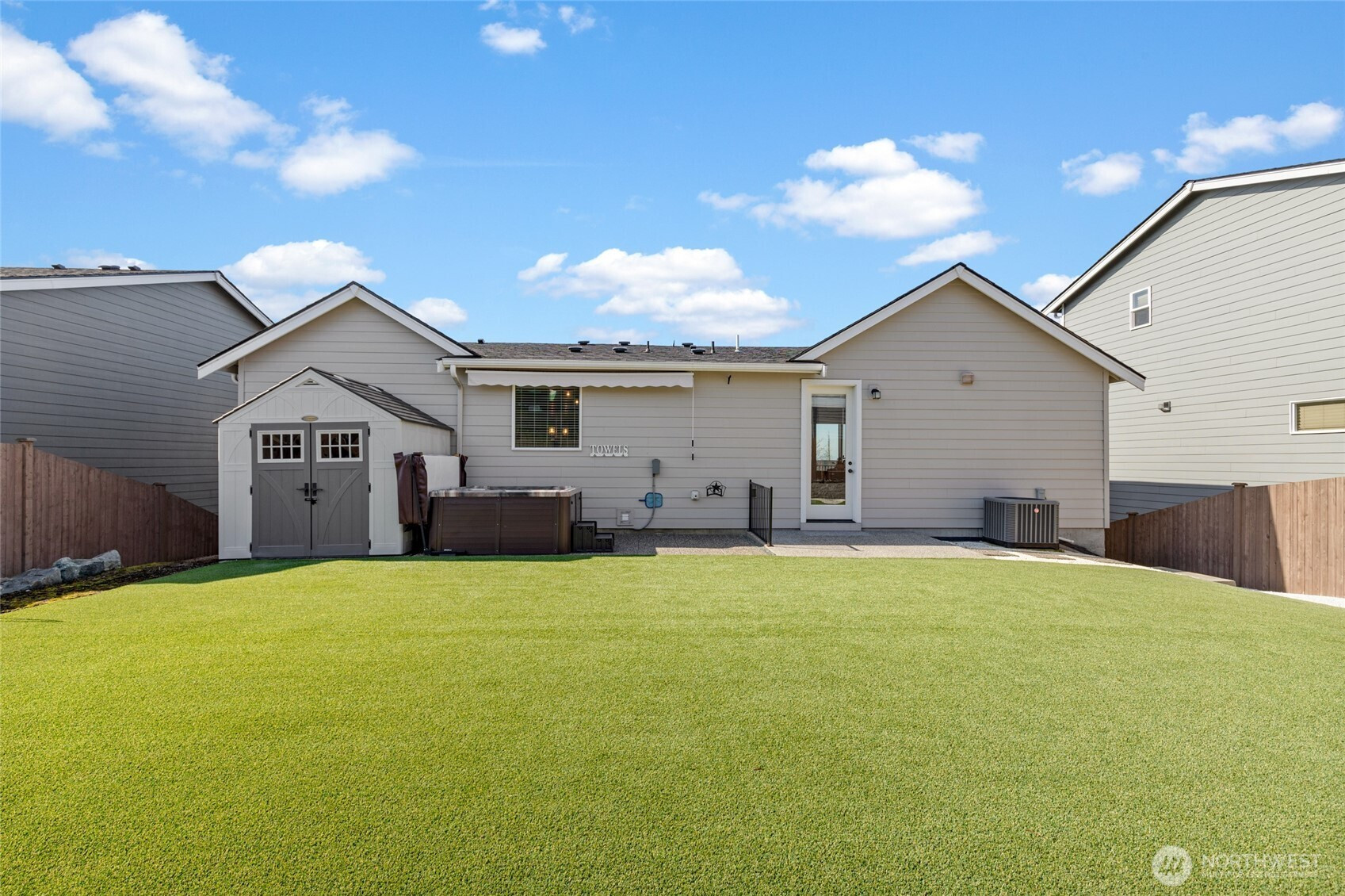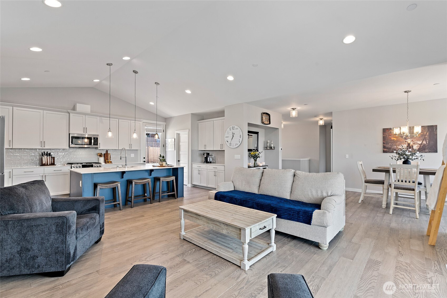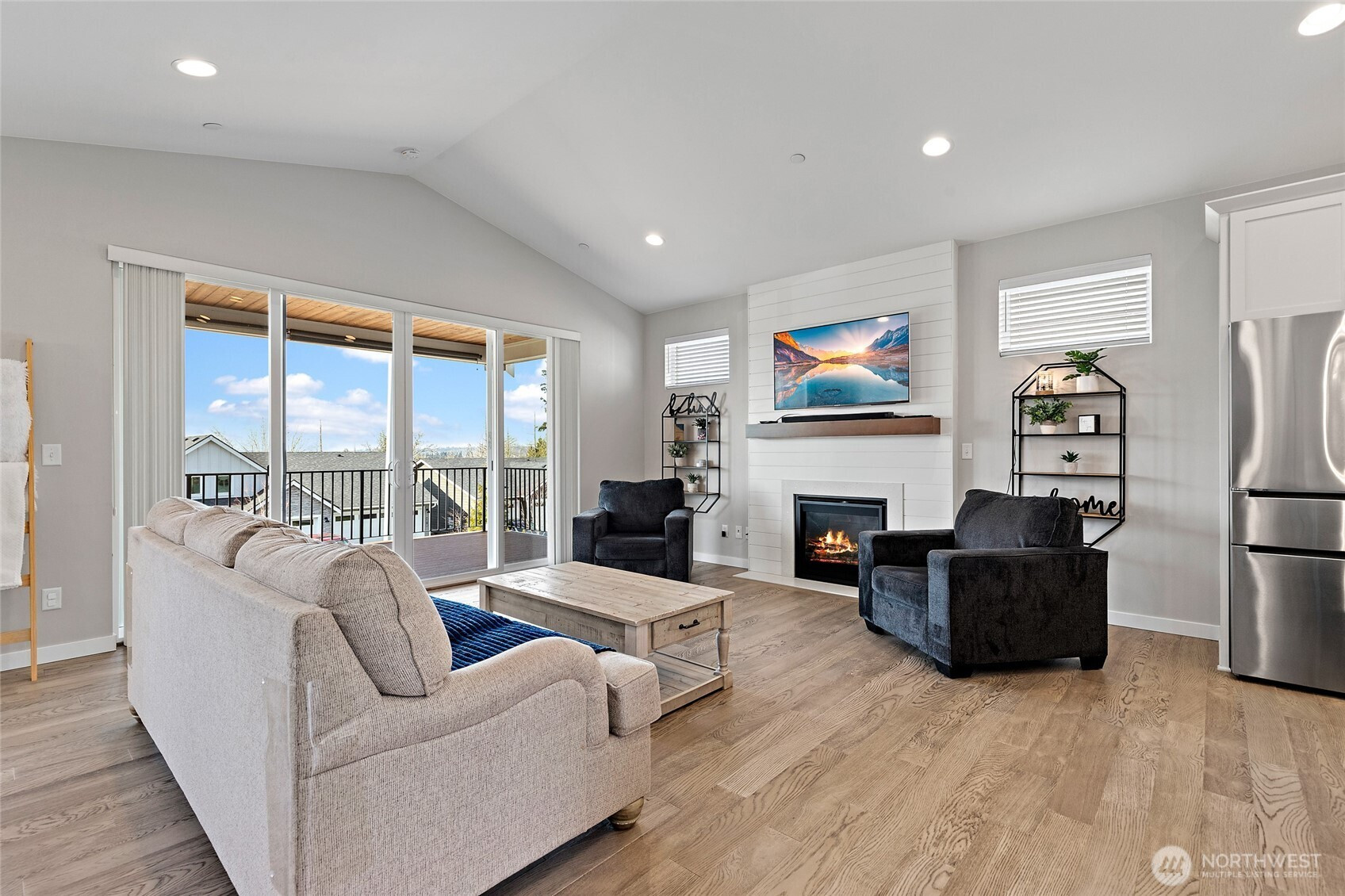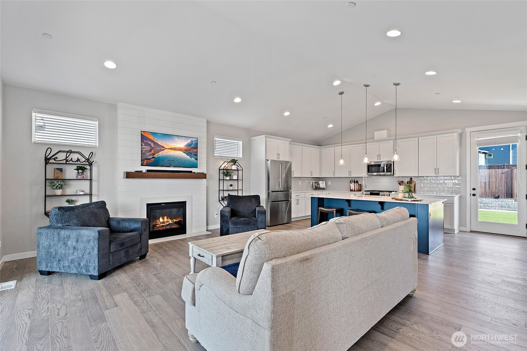Discover the perfect blend of modern farmhouse charm and contemporary luxury in this expansive 2,691 sq ft residence, featuring 4 generously sized bedrooms plus a dedicated home office. The inviting open-concept layout flows effortlessly, creating an ideal space for entertaining and comfortable everyday living. Bathed in abundant natural light, the home feels bright, airy, and welcoming throughout. Retreat to the luxurious primary suite, a true sanctuary illuminated by natural light and complete with a spa-inspired en-suite bath. Indulge in the elegant freestanding soaking tub and step into the sophisticated tiled shower boasting dual showerheads for a rejuvenating experience. The chef's kitchen shines with stunning quartz countertops, complemented by a sleek modern tile backsplash and premium finishes that extend to all bathrooms. Underfoot, gorgeous engineered hardwood floors add timeless warmth and sophistication. Curb appeal is elevated by handsome stone accents, classic 8 ft garage doors, and the signature modern farmhouse aesthetic. Step outside to beautifully fully landscaped front and back yards, complete with a welcoming covered front deck with mountain and sound views—perfect for morning coffee or evening relaxation. Low maintenance fully fenced back yard features hot tub and storage shed. This thoughtfully designed home combines style, functionality, and premium details—ready for your next chapter. Mortgage savings may be available for buyers of this listing.