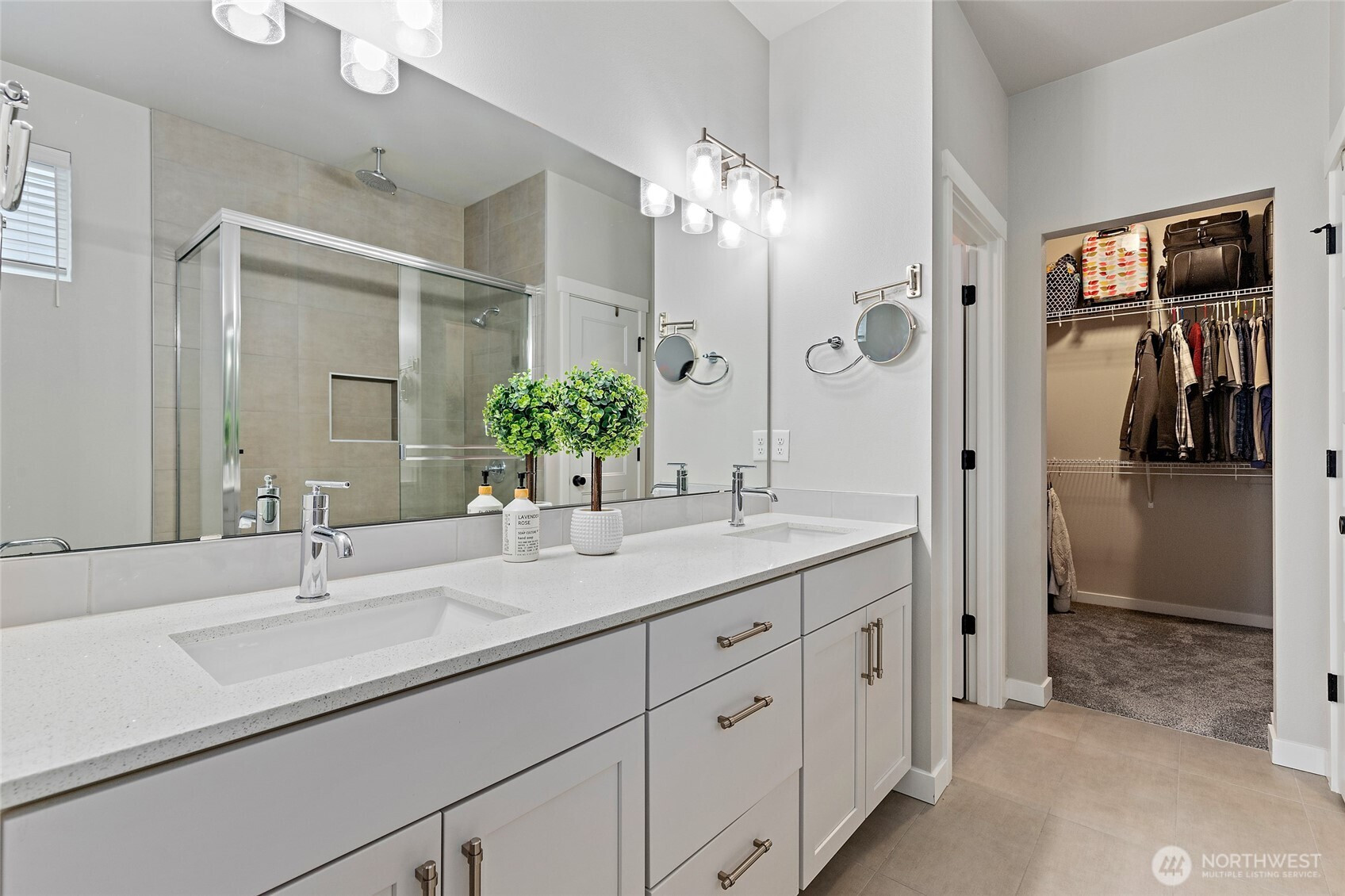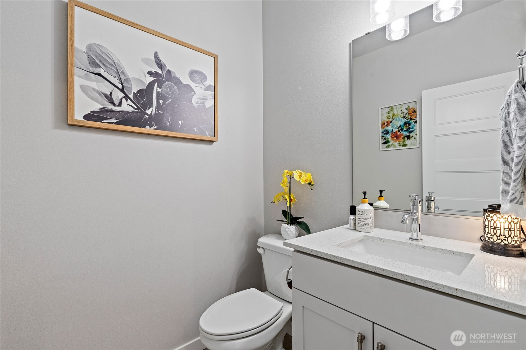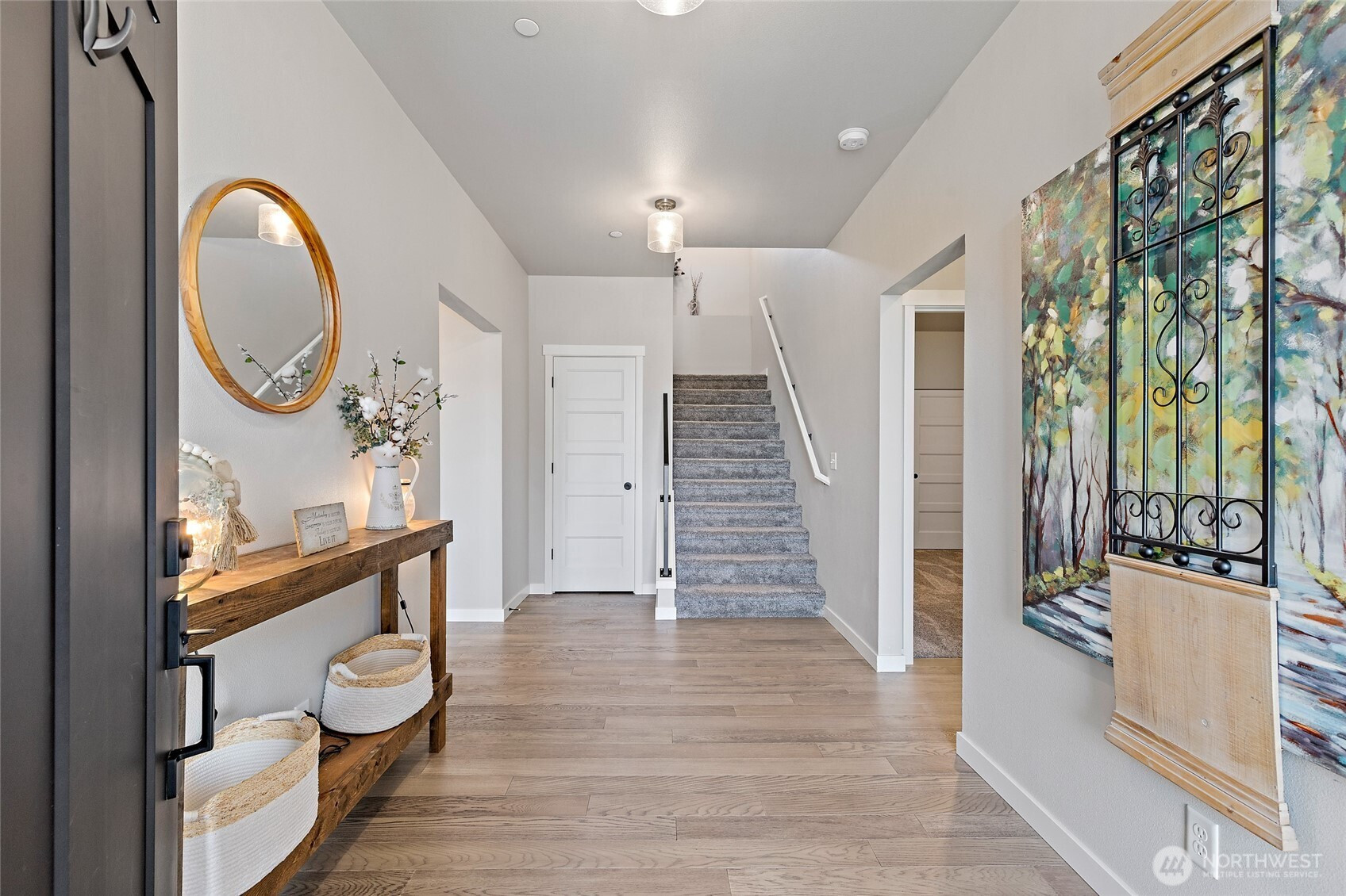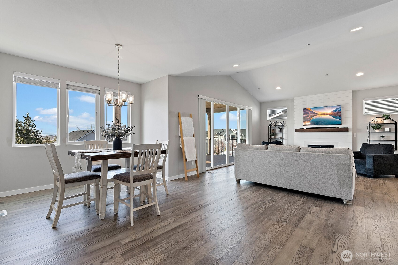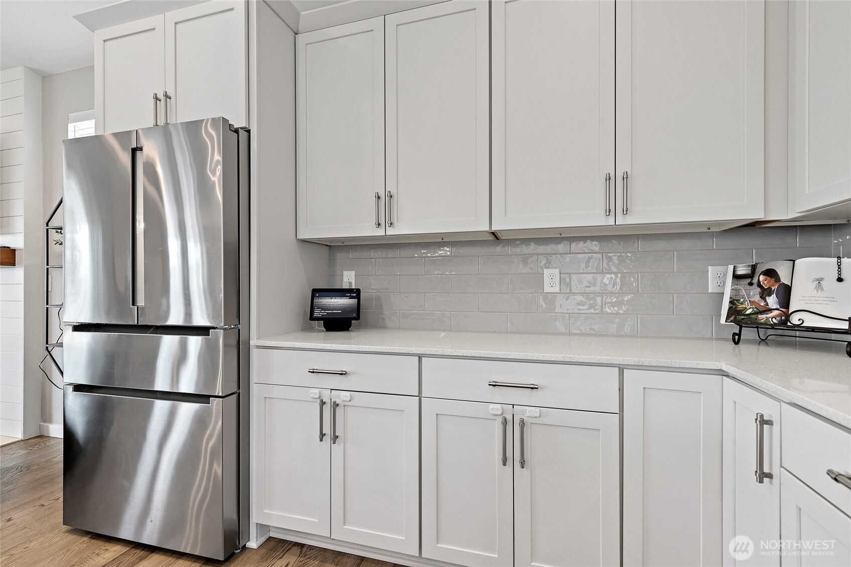 Discover the perfect blend of modern farmhouse charm and contemporary luxury in this expansive 2,691 sq ft residence, featuring 4 generously sized bedrooms plus a dedicated home office. The inviting open-concept layout flows effortlessly, creating an ideal space for entertaining and comfortable everyday living. Bathed in abundant natural light, the home feels bright, airy, and welcoming throughout. Retreat to the luxurious primary suite, a true sanctuary illuminated by natural light and complete with a spa-inspired en-suite bath. Indulge in the elegant freestanding soaking tub and step into the sophisticated tiled shower boasting dual showerheads for a rejuvenating experience. The chef's kitchen shines with stunning quartz countertops, complemented by a sleek modern tile backsplash and premium finishes that extend to all bathrooms. Underfoot, gorgeous engineered hardwood floors add timeless warmth and sophistication. Curb appeal is elevated by handsome stone accents, classic 8 ft garage doors, and the signature modern farmhouse aesthetic. Step outside to beautifully fully landscaped front and back yards, complete with a welcoming covered front deck with mountain and sound views—perfect for morning coffee or evening relaxation. Low maintenance fully fenced back yard features hot tub and storage shed. This thoughtfully designed home combines style, functionality, and premium details—ready for your next chapter. Mortgage savings may be available for buyers of this listing.
