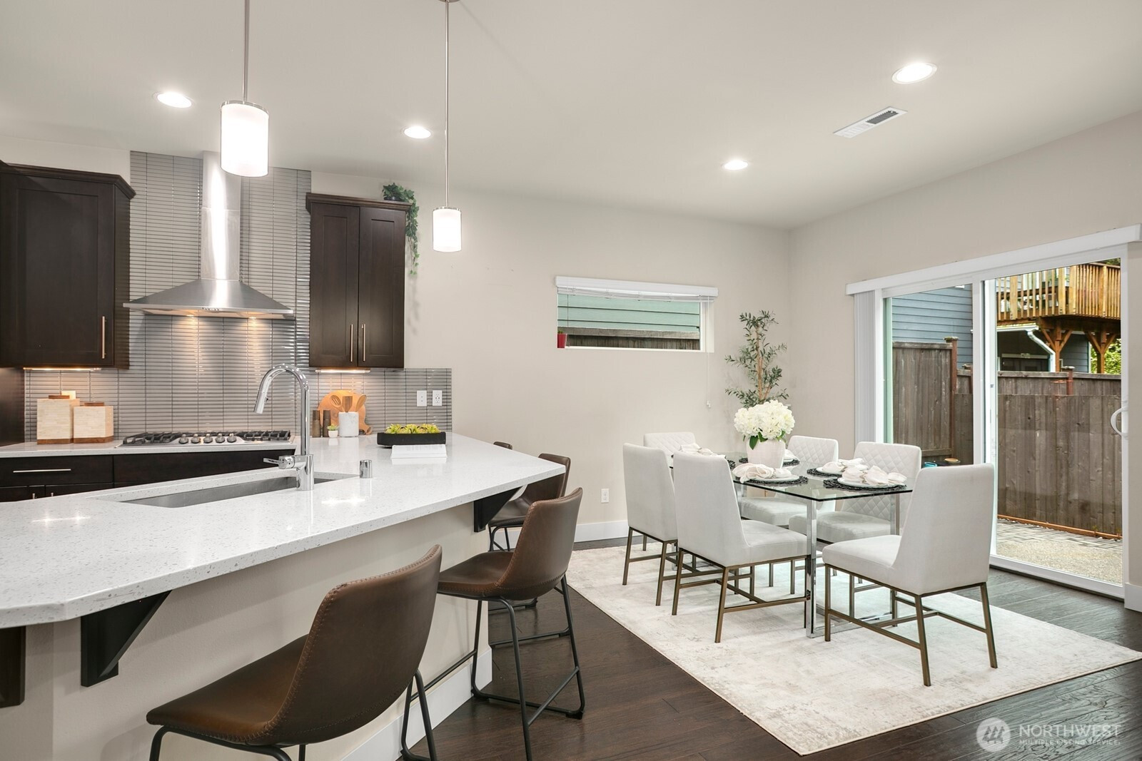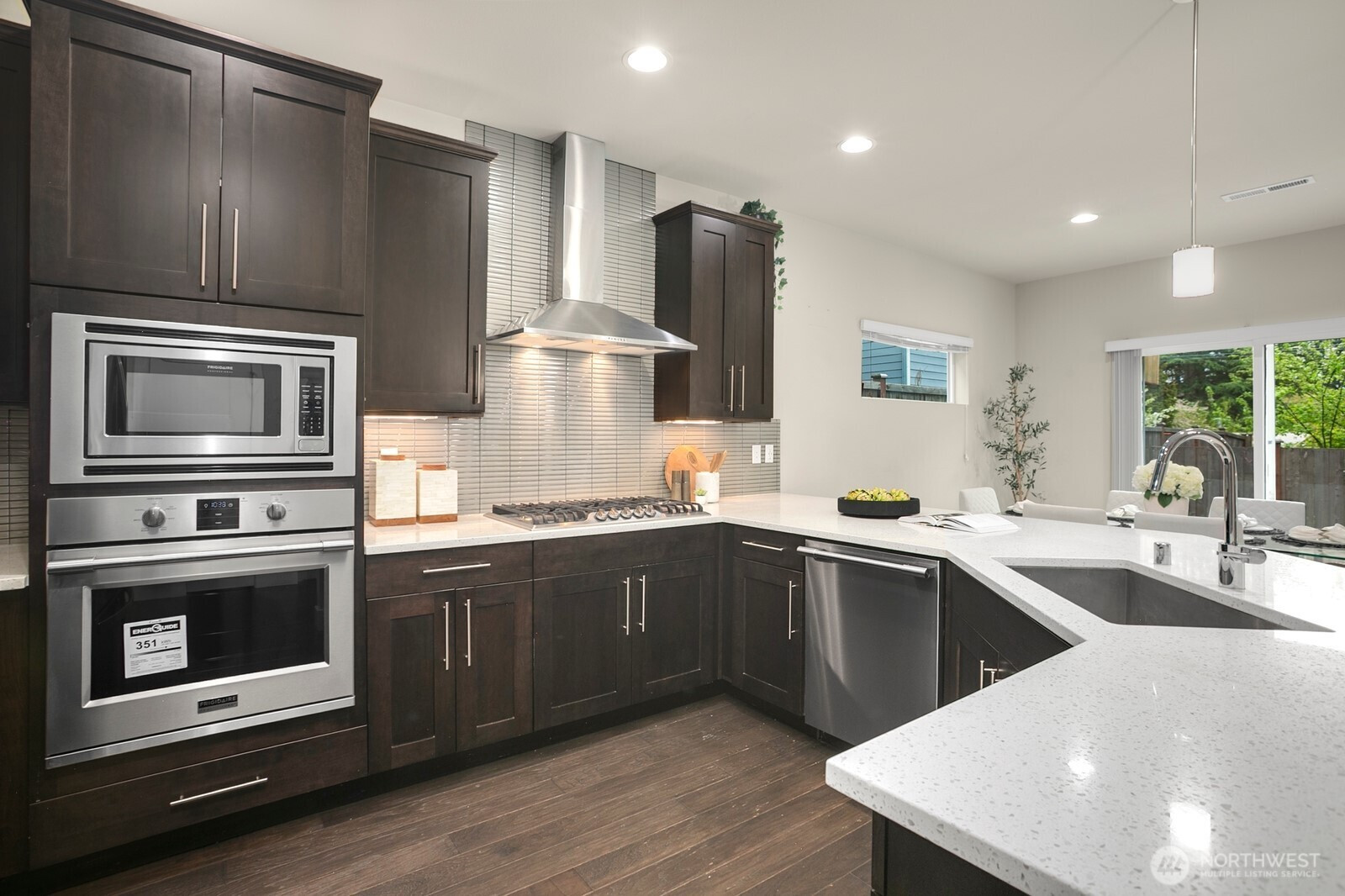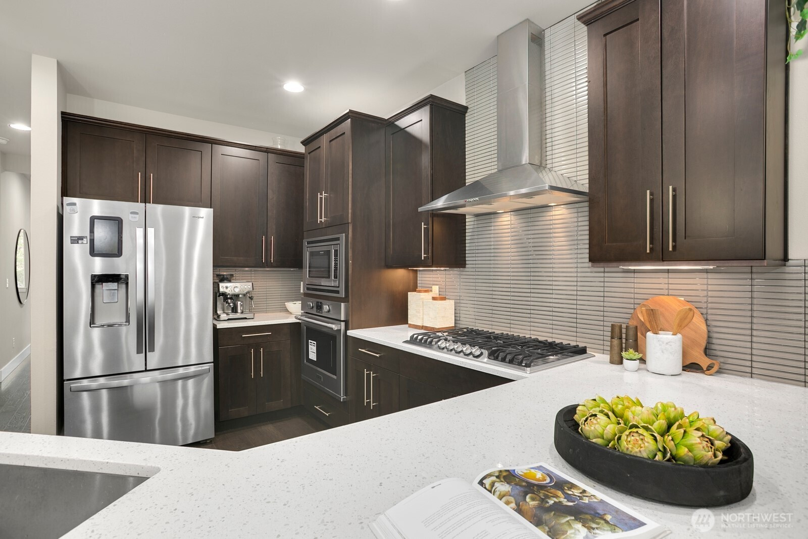 Discover elevated living in this elegantly designed, north facing home, perfectly positioned in one of Bothell’s most desirable neighborhoods within the renowned Northshore School District. Recently refreshed with tasteful paint touch-ups and meticulously maintained, this 5 bedroom, 2.75 bath residence showcases a thoughtfully planned layout that harmonizes modern comfort with understated sophistication. A main level bedroom with a ¾ bath provides flexibility for guests or multi generational living. At the heart of the home, the gourmet kitchen impresses with sleek quartz countertops, a statement 5 burner cooktop with extraction hood, soft close cabinetry, designer pendant lighting, and an expansive pantry seamlessly flowing into grand, light filled living spaces highlighted by soaring ceilings and abundant natural light. Upstairs, the serene primary suite features a private balcony, spa like 5 piece bath, and a generous walk in closet. Designed for modern living, the home also features energy efficient heating and cooling systems for year round comfort. The low maintenance backyard, enhanced with stylish pavers, offers a versatile outdoor setting perfect for entertaining in any season. Ideally located near top rated schools, parks, shopping, dining, and major tech hubs, this pre inspected home offers an exceptional blend of tranquility, convenience, and enduring appeal. Welcome Home!