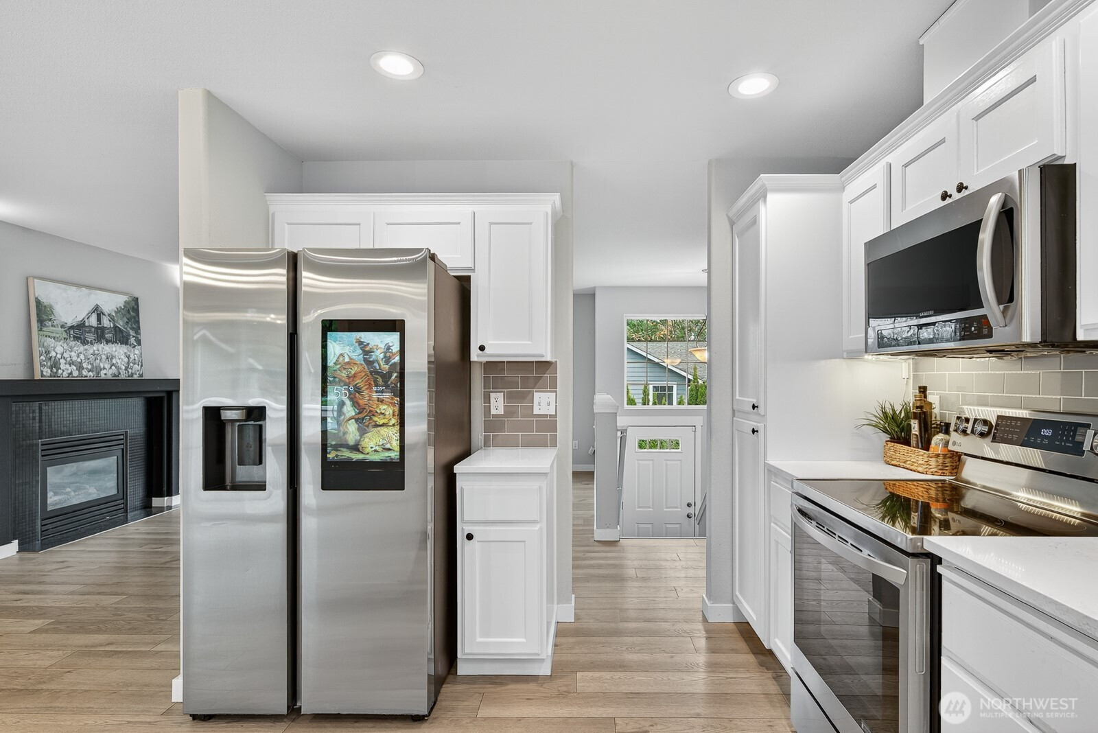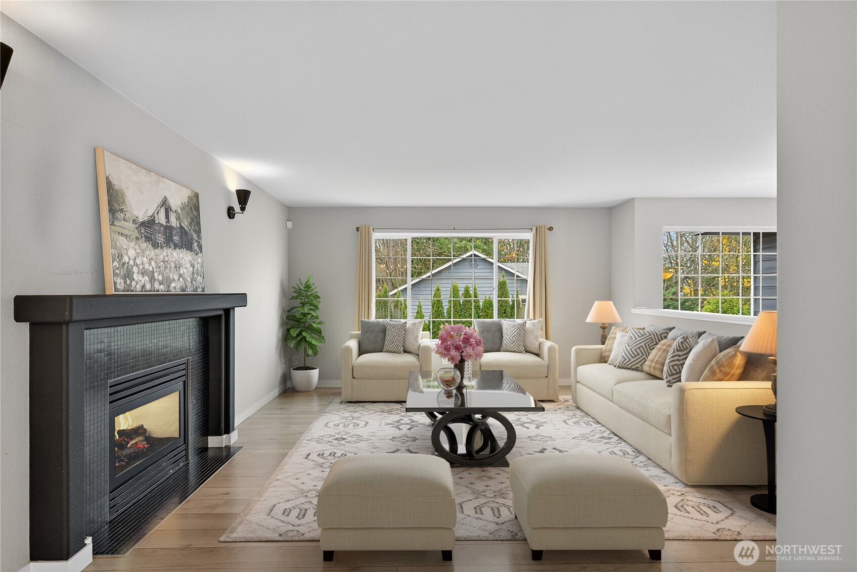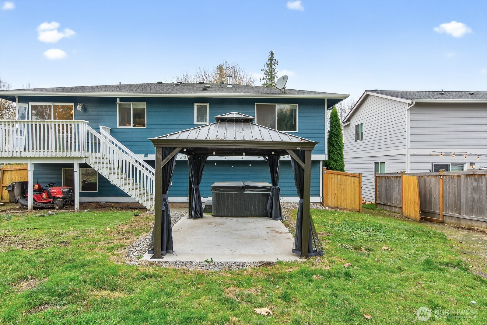 Located in a desirable Lake Stevens community, this fantastic home shines w/ tasteful updates & well-designed layout. Features include modern white kitchen, updated LVP flooring, stylish bathrooms & fresh neutral tones throughout. The upper level includes a bright living area w/cozy gas fireplace. The kitchen offers ample quartz counters & newer SS appliances. Entertaining made easy w/ dining space just off kitchen, two bedrooms plus spacious primary suite. Lower level provides a generous bonus room, additional bath & garage access. The backyard boasts newer hot tub, metal gazebo & backs to open space, offering extra privacy & feel of a large yard. Close to top-rated schools, restaurants, shopping & easy access to I-5, Hwy 2, and Hwy 9.