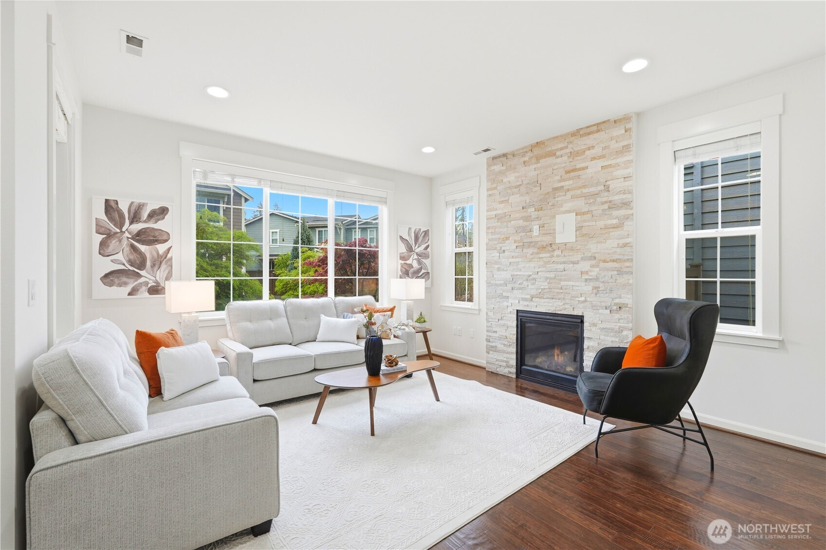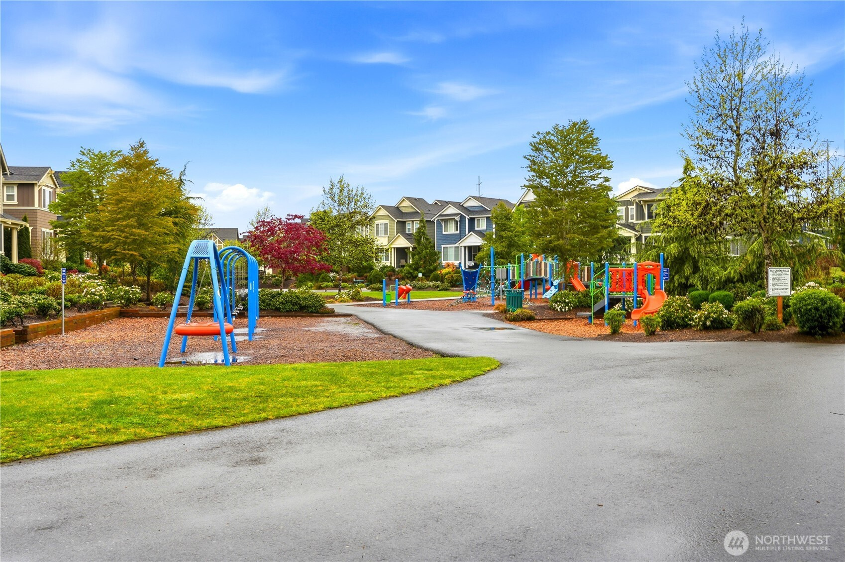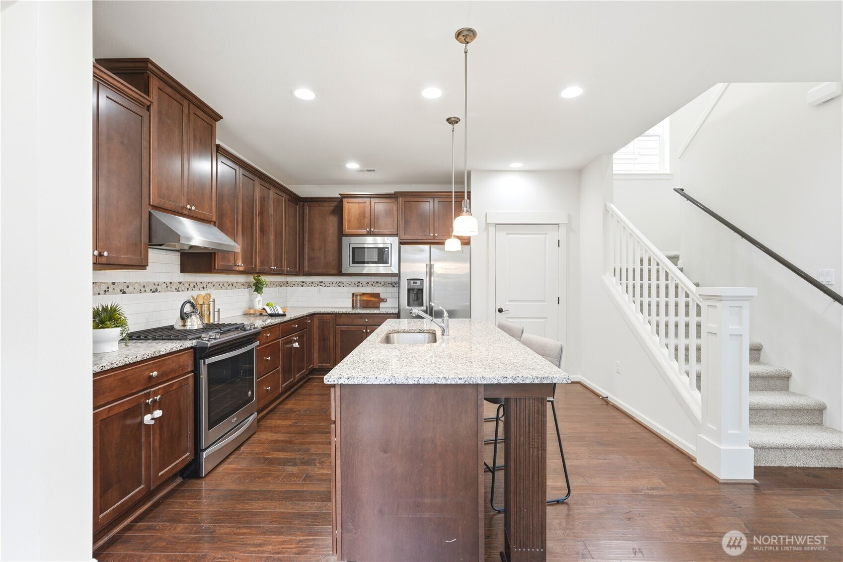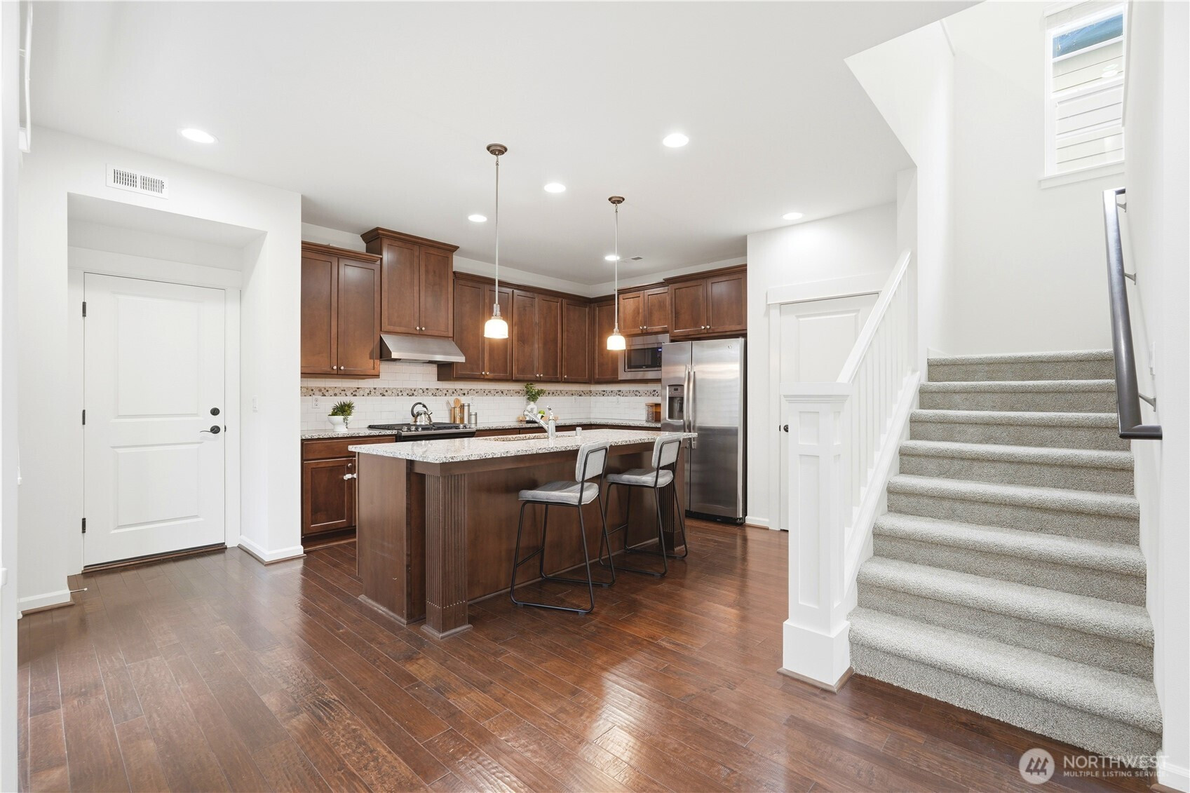 Welcome to the highly desirable Timber Creek community! This beautifully updated north-facing 3 bed, 2.5 bath home with a spacious loft (easily convertible to a 4th bedroom) offers 2,210 sqft of bright, functional living. Enjoy fresh new paint, brand-new carpet, hardwood floors on the main level, and abundant natural light throughout. The chef’s kitchen features granite countertops, tile backsplash, and ample cabinetry, flowing into the inviting living space with a floor-to-ceiling tiled fireplace feature wall. Upstairs, the spa-inspired primary suite boasts marble countertops, tile floors, soaking tub, and a fully tiled walk-in shower. Additional highlights include central A/C, EV charging outlet, extensive garage storage, and tile flooring in all bathrooms. The versatile loft is perfect for a home office, media room, or future bedroom with projector setup potential. Ideally located just a 5-minute walk to North Creek High School in the award-winning Northshore School District, and directly across from the community park. Enjoy resort-style amenities including an Olympic-size pool, cabana, basketball court, and walking trails. Low HOA and beautifully maintained community make this a must-see!