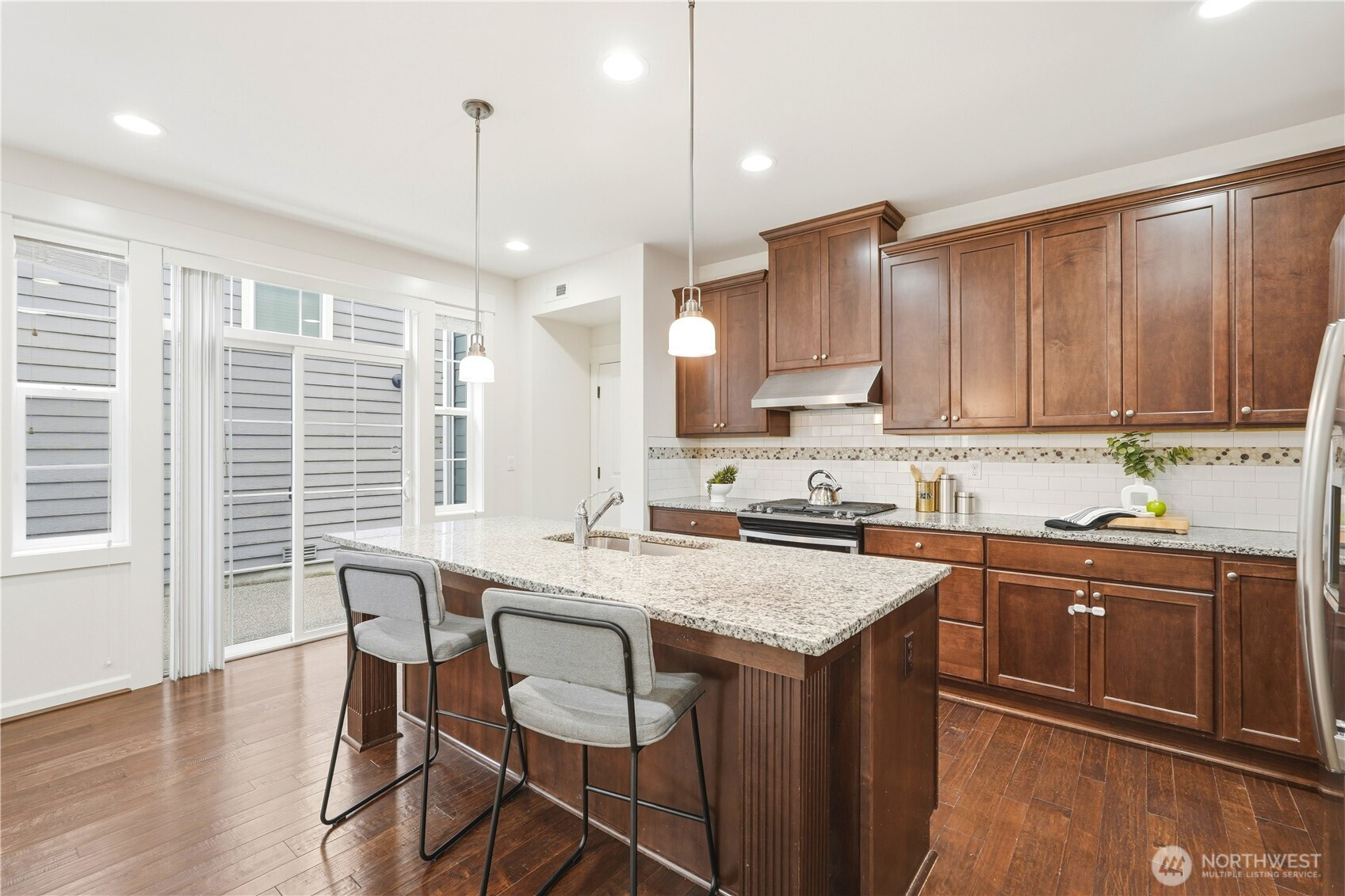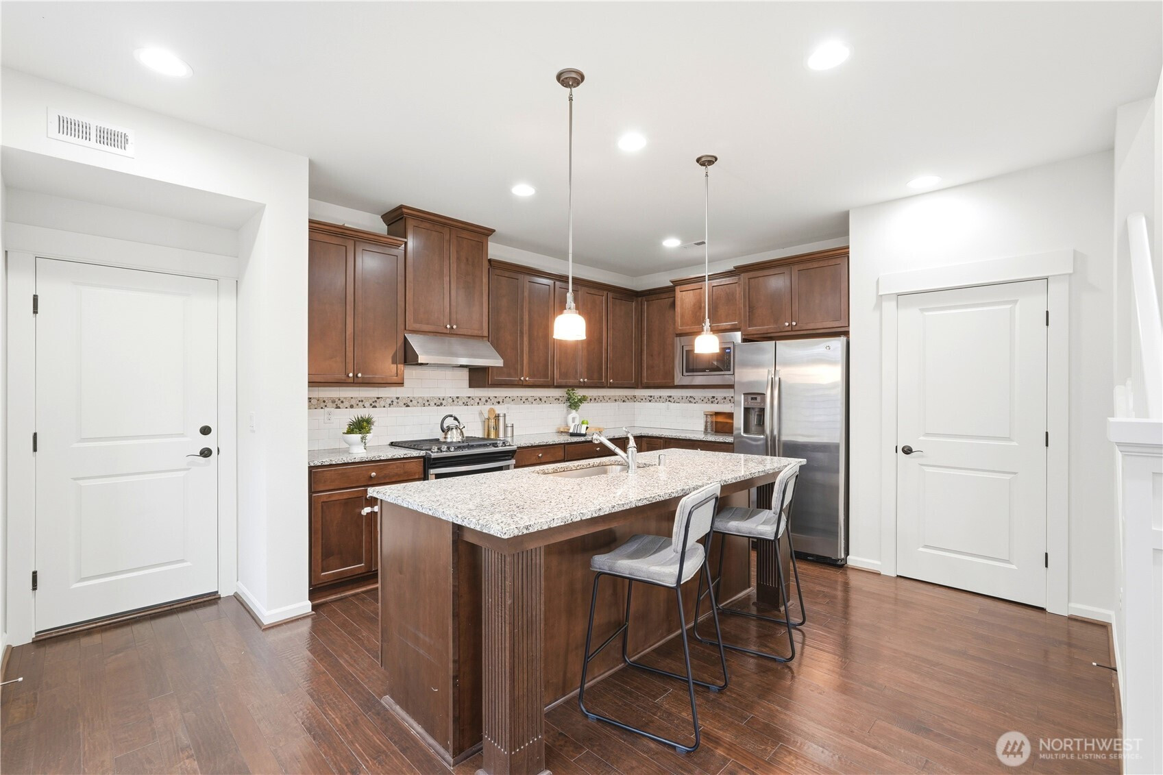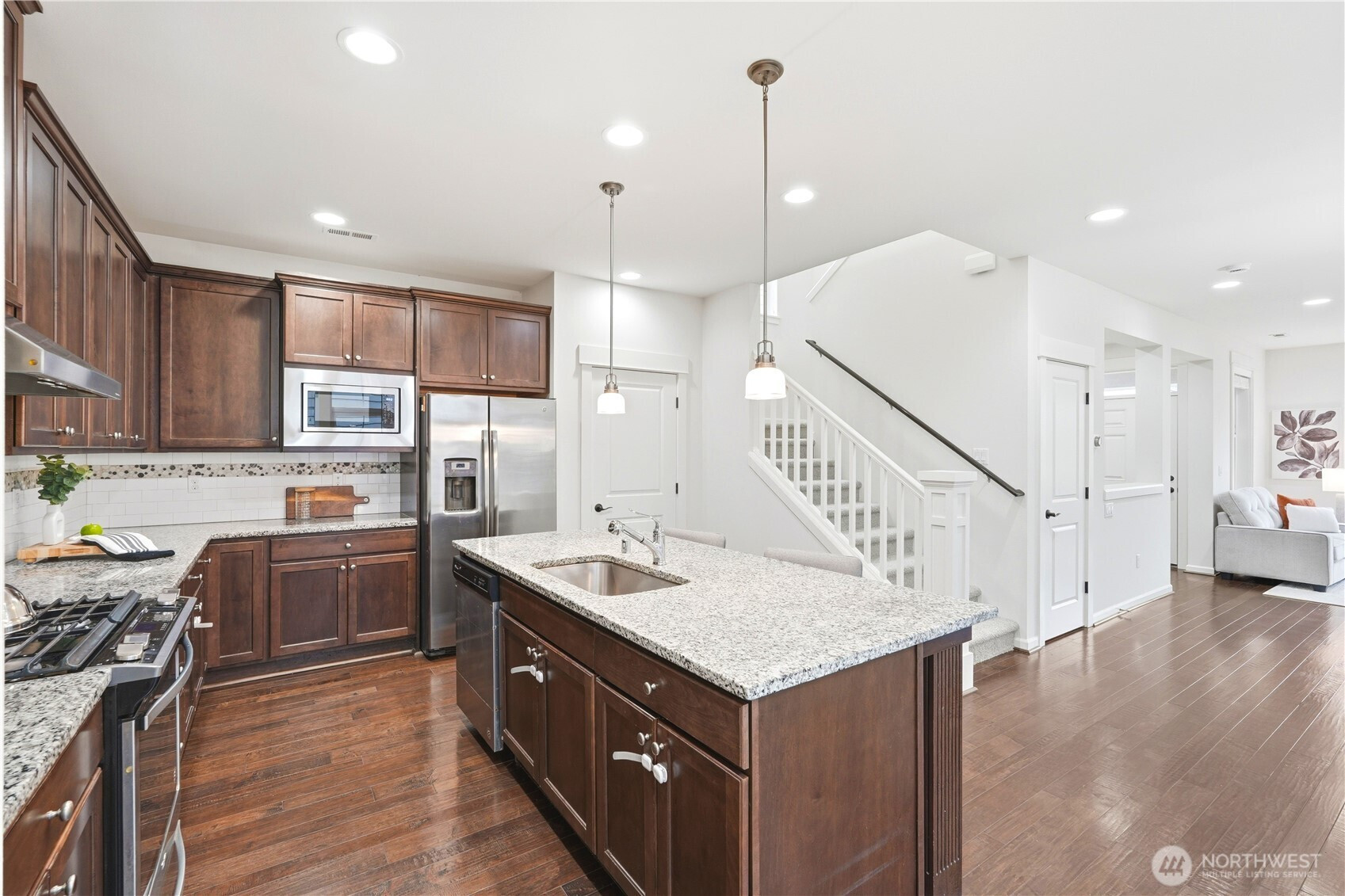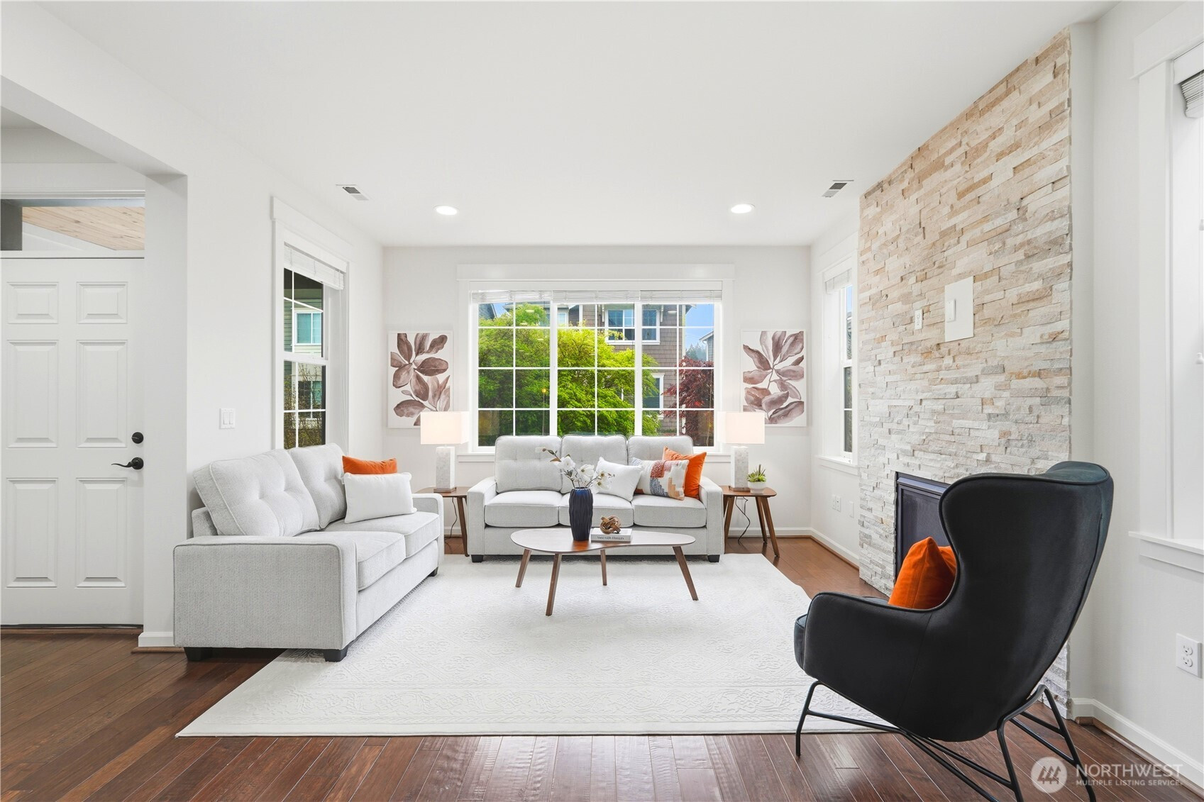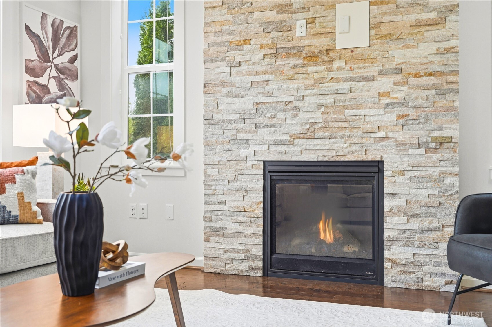 Welcome to the highly desirable Timber Creek community! This beautifully updated north-facing 3 bed, 2.5 bath home with a spacious loft (easily convertible to a 4th bedroom) offers 2,210 sqft of bright, functional living. Enjoy fresh new paint, brand-new carpet, hardwood floors on the main level, and abundant natural light throughout. The chef’s kitchen features granite countertops, tile backsplash, and ample cabinetry, flowing into the inviting living space with a floor-to-ceiling tiled fireplace feature wall. Upstairs, the spa-inspired primary suite boasts marble countertops, tile floors, soaking tub, and a fully tiled walk-in shower. Additional highlights include central A/C, EV charging outlet, extensive garage storage, and tile flooring in all bathrooms. The versatile loft is perfect for a home office, media room, or future bedroom with projector setup potential. Ideally located just a 5-minute walk to North Creek High School in the award-winning Northshore School District, and directly across from the community park. Enjoy resort-style amenities including an Olympic-size pool, cabana, basketball court, and walking trails. Low HOA and beautifully maintained community make this a must-see!