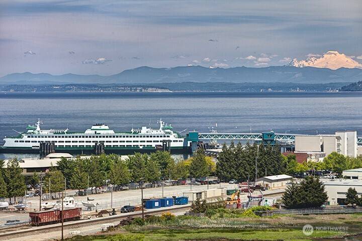 GLAD YOU'RE HERE!! Lovely 2 bedroom, 1 and 3/4 bath condo residence with VIEWS of the Sound and glorious Olympics! Freshly painted, generous in size, this residence features a coveted covered deck which takes in sumptuous views of surrounding viewscapes. Open floorplan with circular traffic pattern making entertaining a breeze. Slab granite counters with cherry-stained alder cabinets, and glass tile accents accentuate the kitchen aesthetic. Over-sized primary bedroom is ensuite, with dual sink vanities, separate water closet and walk-in clothes closet; Guest bedroom is located privately away from the primary and enjoys a full bath just adjacent. Designated den has great work-space - Keeping paperwork in its place! Central heat and A/C. Large extra-storage located on the first floor and two designated parking spaces complete this offering in Building 45...the fabulous community amenities on top of this package include clubhouses, pools, work-out venues, and guest suites...all sited on 23 acres of unobstructed panoramas of all the Puget Sound has to offer!