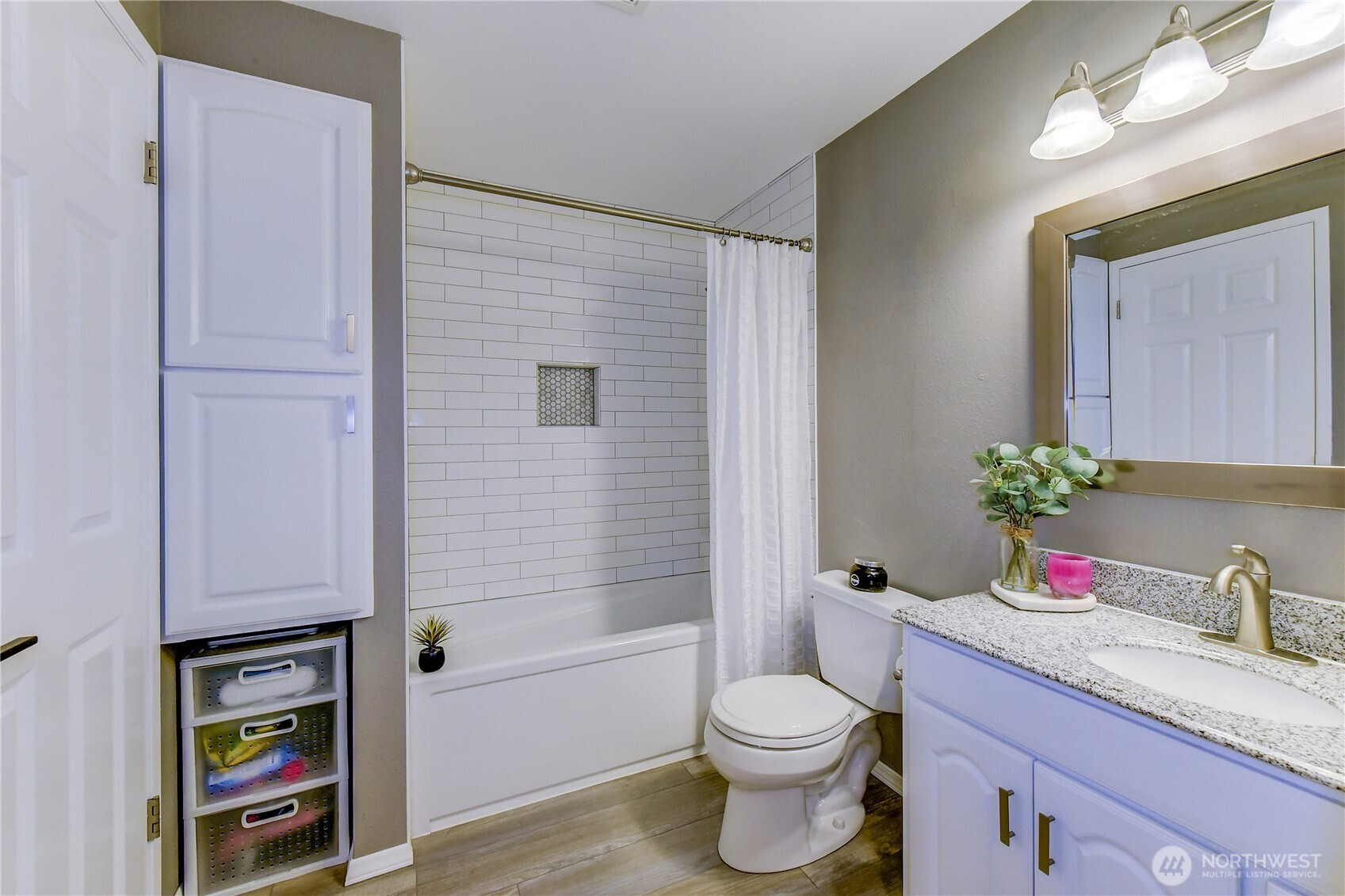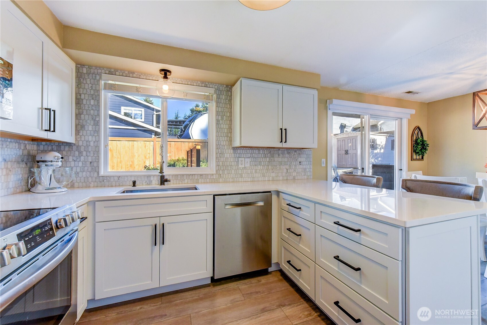 From the minute you arrive, you'll see how perfect this home is inside and out! You'll enjoy living all on one level! The home sits on a beautiful corner lot that is all level. Extensive updates to the home throughout include the beautiful 2021 UPDATED KITCHEN AND BATHROOM. The kitchen boasts new cabinets, Quartz countertops, tile backsplash, sink, and faucet. While the bathroom has a new tub and tile. New roof, and gutters with leaf gutter guard and fascia board 6/2022. New deck 2023! New concrete driveway in 2024 fits your cars & RV! New fence 2024! Electric car? No problem, 240 outlet in the garage for electric car charging. So many updates to list! All of this and now add, Northshore School District! It makes this home a must see!