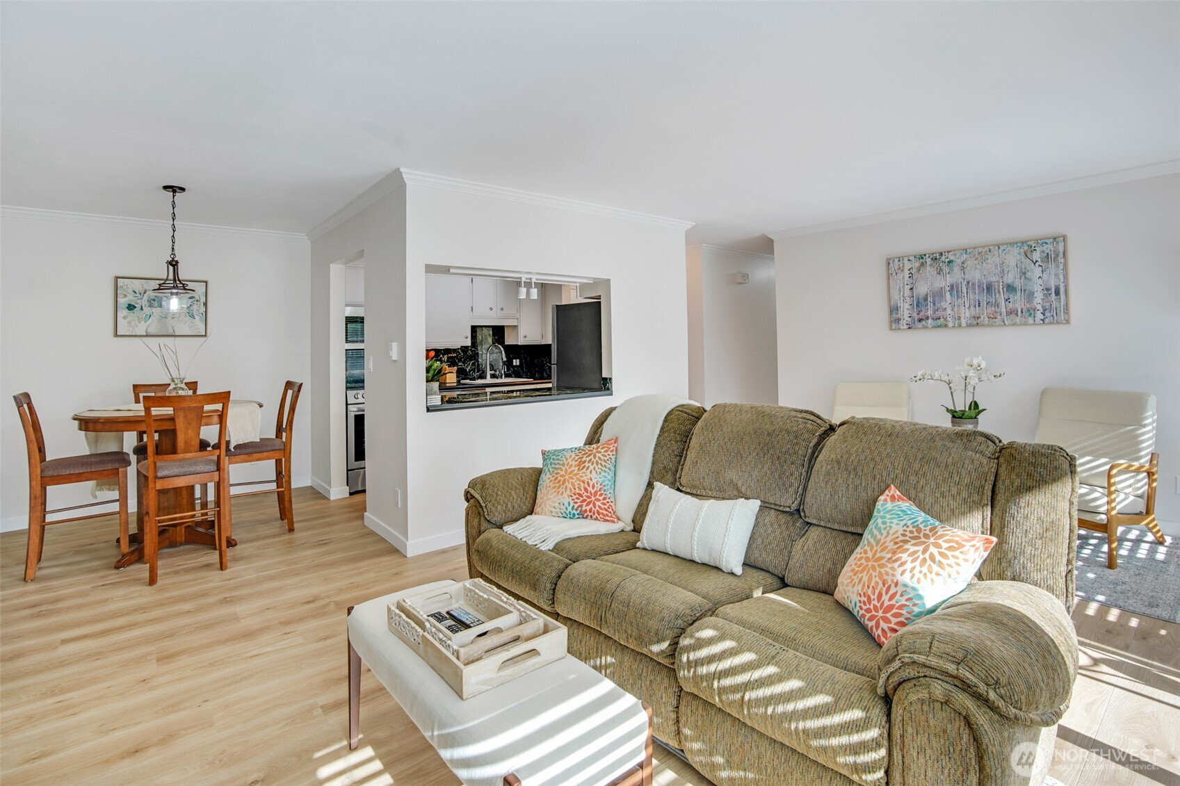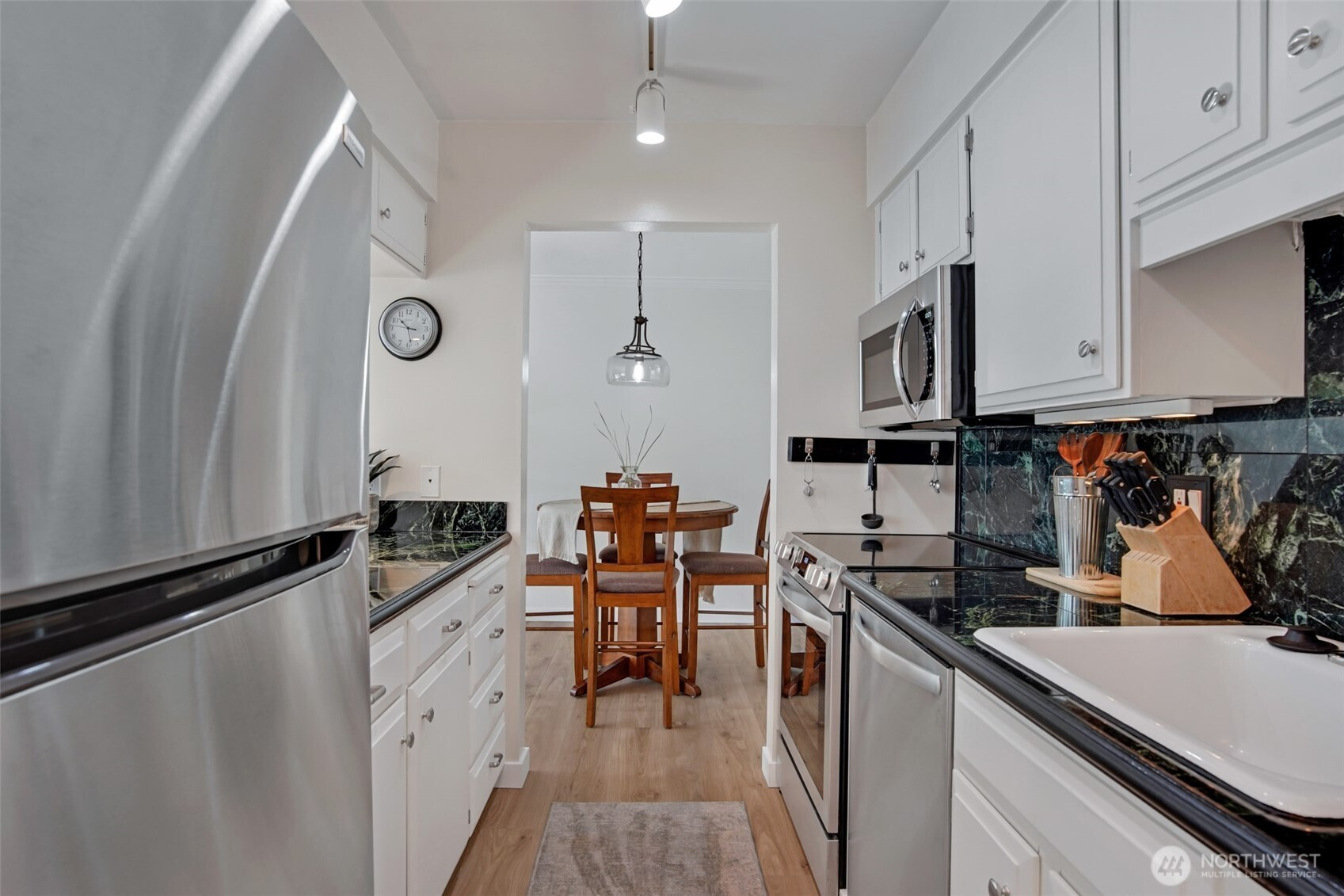 Super cute, impeccable 2 bedroom, 2 bathroom condo close to downtown Edmonds in Highland Park. This condo is in the south building and on the top floor so it’s quiet and peaceful, looking out onto a gorgeous greenbelt. The complex has beautiful landscaping, a heated pool and has been well maintained. Condominium has spacious living room with separate reading nook, dining area, kitchen has stainless steel appliances and granite tile counters. Big primary bedroom has lots of closet space. New flooring installed throughout. Unit has a Washer/Dryer, two storage units, and a large deck. 1 car carport, lobby entrance, and elevator. Pet friendly for up to 2 pets, under 20 lbs each. Close to everything Edmonds has to offer!