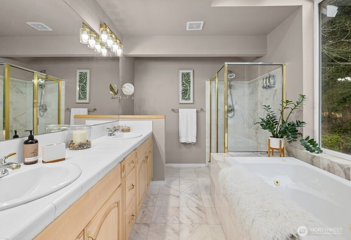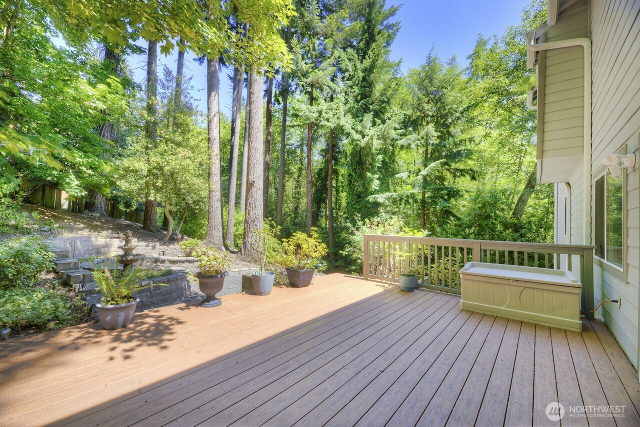 Welcome to this spacious 4 bedroom 3 bath home with 2700 sq ft of living space on a spacious 1/4 acre lot in a peaceful, park-like setting. Surrounded by scenic Northwest nature, trees, and beauty this home offers exceptional privacy and tranquility. Eastside of house backs up to greenbelt with two decks. Main level living has vaulted ceilings and gas fireplace for creating warmth and ambiance throughout the home. Spacious windows on the main living brings in abundant natural light. Kitchen opens up to a great room and eating area with bar seating. SS appliances, tiled countertops and gas stove complete the kitchen. Primary suite is a serene retreat. Enjoy sitting on deck with morning coffee and a 5-piece Spa-inspired marble bathroom with skylight. The lower level is ideal for multigenerational living or guests. Features a secondary kitchen with a new SS Fridge and new laminate hardwood flooring. Could be a potential ADU or rental. Downstairs includes 3 bd, 1 full bath. Expansive family room with gas fireplace. Outdoor living includes terraced areas, water fountain, and entertaining spaces. Located in highly regarded Edmonds School District, mins to Parks, Mountlake Terrace Rail Station, and Alderwood Mall. A rare opportunity to enjoy comfort, privacy, and lifestyle in a beautiful setting.