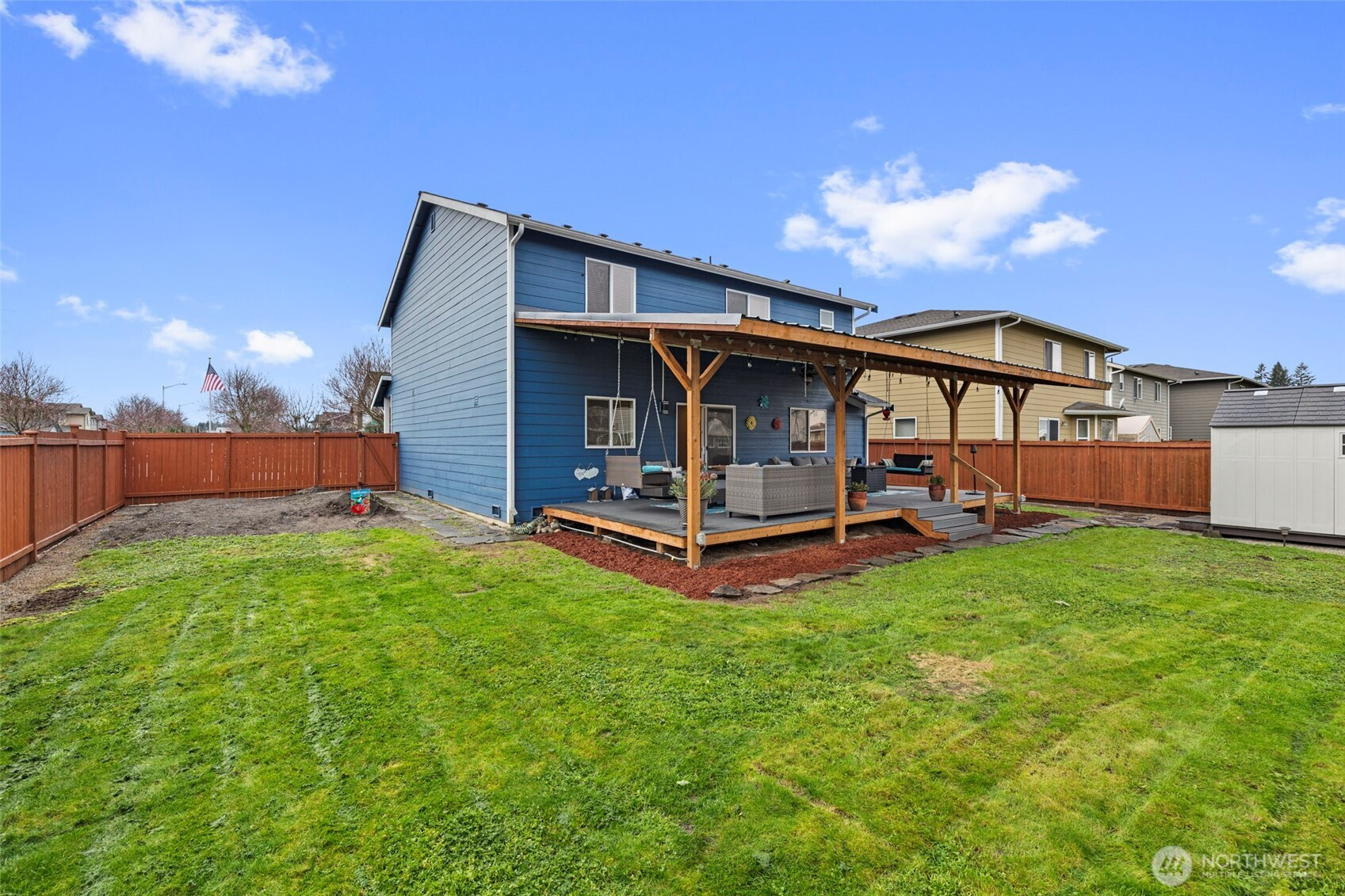 Spacious 5-bedroom home on a corner lot for comfort and function. Freshly painted interiors & brand-new carpet create a clean, move-in-ready feel, while ceiling fans in every bdrm & air conditioning keep the home comfortable year-round. The open layout provides flexible living spaces ideal for gatherings, everyday living, or work from home. The large primary suite features a huge walk-in closet, creating a relaxing retreat w/ plenty of storage. Step outside to enjoy the huge covered deck that runs the full length of the house, perfect for entertaining in any season. The fully fenced yard includes a side garden area, flag pole, & room to play, relax, or host summer get-togethers. The fire table and patio furniture stay, making it easy to settle in & start enjoying the outdoor space right away. Practical upgrades add comfort & efficiency, including a tankless water heater, remote-start generator for peace of mind, & suspended storage in the 3-car garage to help keep everything organized. Charming backyard shed with electricity — ready for crafts, projects, or quiet retreat. Parking & storage make this home as functional as it is inviting. Located in a community w/ a neighborhood playground & friendly atmosphere, home offers convenient access to local parks, schools, shopping, dining, & everyday amenities. Commuters will appreciate the easy drive to Boeing, quick I-5 access, & convenient routes heading north toward Arlington, & beyond, this a great location for both work & play.