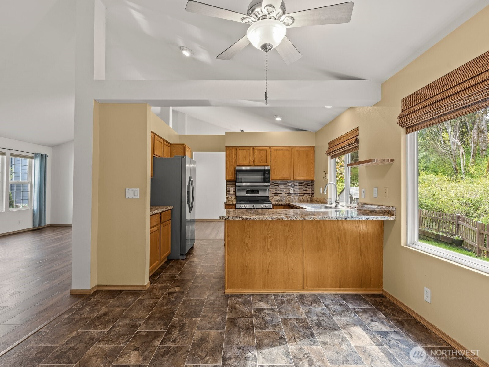 Welcome to Foothills Park and this beautiful move-in ready tri-level home! Backing to protected lands and located on a cul-de-sac, you'll enjoy peaceful privacy with space for everyone. Walking in you're greeted by a flood of natural light that illuminates the soaring vaulted ceilings of your bright and airy living room. The dining room is next on your journey and it offers space for a table of any shape. Stepping into the eat-in kitchen you'll be impressed by the rich, spacious granite counters, leaving you plenty of storage and prep room for hosting. This layout is an entertainer's dream with a large family room centered around a gas fireplace just off the eating area of the kitchen, complete with a convenient half bath and laundry room. Just around the corner is the upper level where you'll find 2 guest bedrooms, a full guest bath, and your primary suite with a massive walk-in closet and double vanity ensuite. Outside is your back patio, perfect for summer BBQs, a fantastic shed, 3 car garage, and like new hardiplank siding installed just a year ago. Foothills Park is in your backyard and along with it are beautiful trails and the serenity of nature. Close to I5 and Hwy 9, this home has it all! Come check it out today.