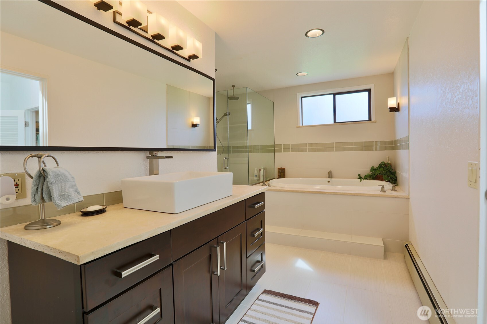 Beautifully updated with high-end finishes this 2-Story, 4 bed, 3 bath home is located in the desirable Edmonds Meadowdale neighborhood. Soaring vaulted ceilings and numerous picture windows flood home with natural light. The open floorplan features bamboo floors, all new carpet on lower level, modern kitchen with all new cabinets, SS appliances and Quartz counters. Family room with gas fireplace and rec room with bonus wine cellar. Tranquil Master retreat with walk-in closet and 5pc bath with custom tile and rain shower. Large heated shop area provides ample work and storage space plus separate bonus 'craft' room. Gorgeous fully-landscaped yard with artificial turf, stream and pond. All on a quiet cul-de-sac lot!