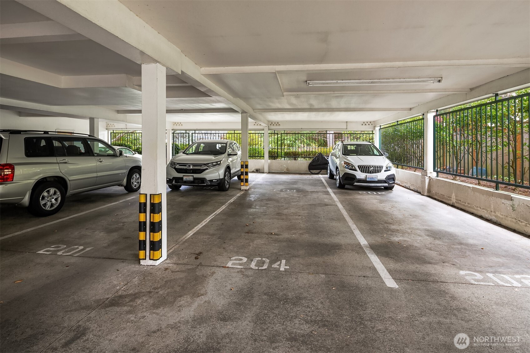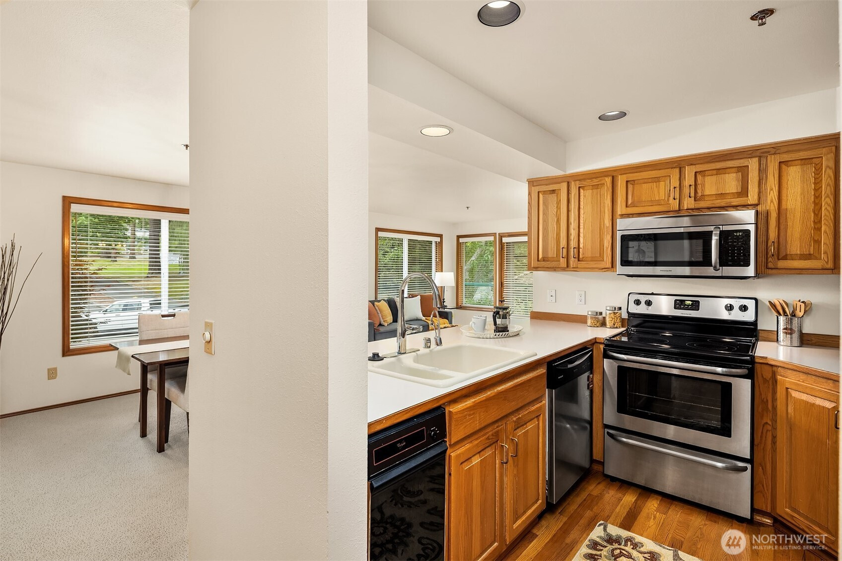 Welcome to the natural beauty of Edmonds Creekside, located in the heart of the Edmonds Bowl! Light & bright one-level corner unit, has a welcoming entry featuring hardwood floors, newer carpets, 2 bedrooms & 1.75 baths. Spacious living room has a gas fireplace and a slider to a private deck. Well-designed kitchen features plenty of storage, sit-up eating bar and stainless appliances. Primary bedroom has great closet space and 5 piece spa bath. Enjoy the year-long running creek, lovely garden & grounds and a centrally located community gazebo. All this and pets are welcomed too. Elevator, 2 tandem parking spots in secure garage +storage unit. Short distance to the beachfront, Edmonds Center for the Arts, fabulous restaurants & unique shops!