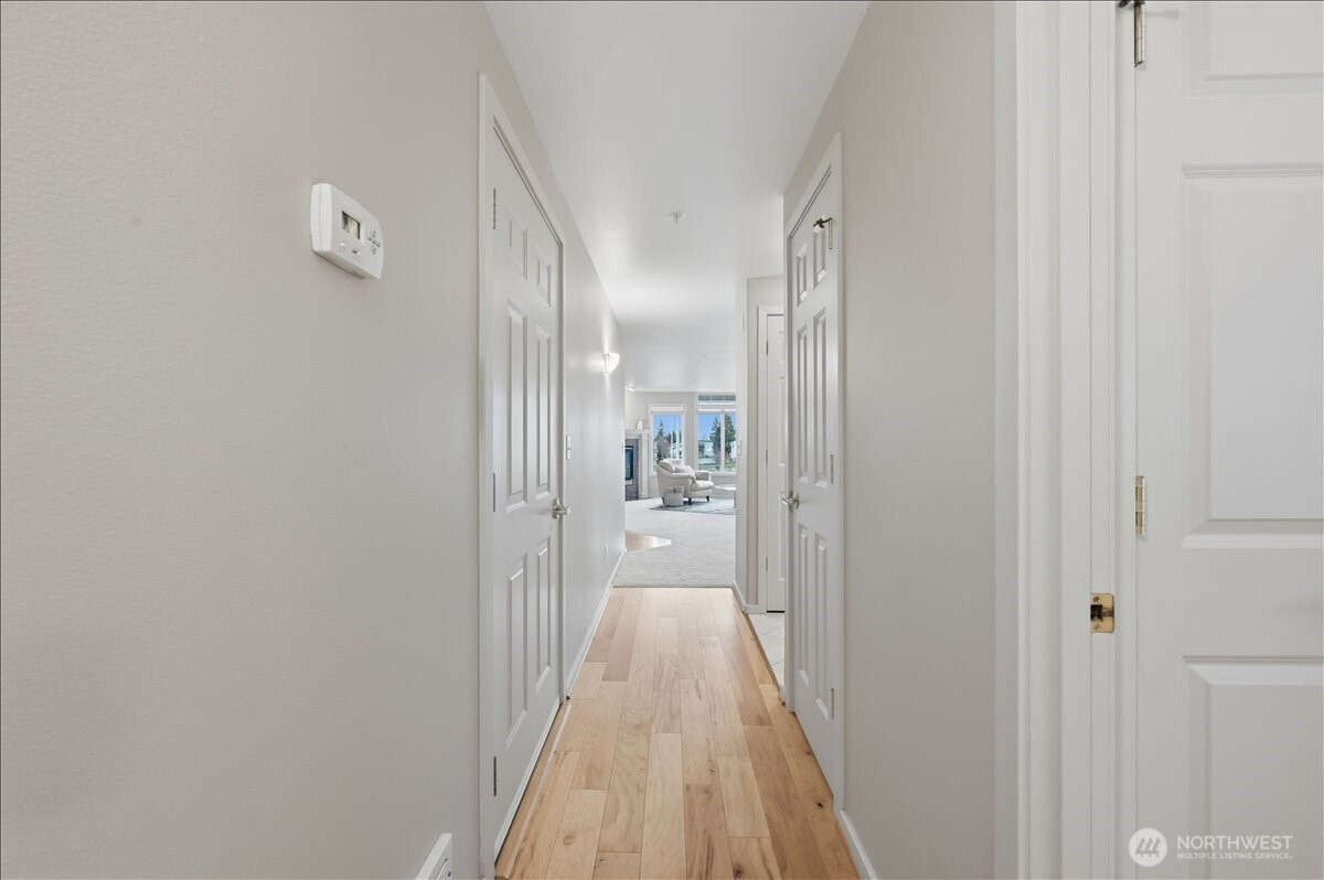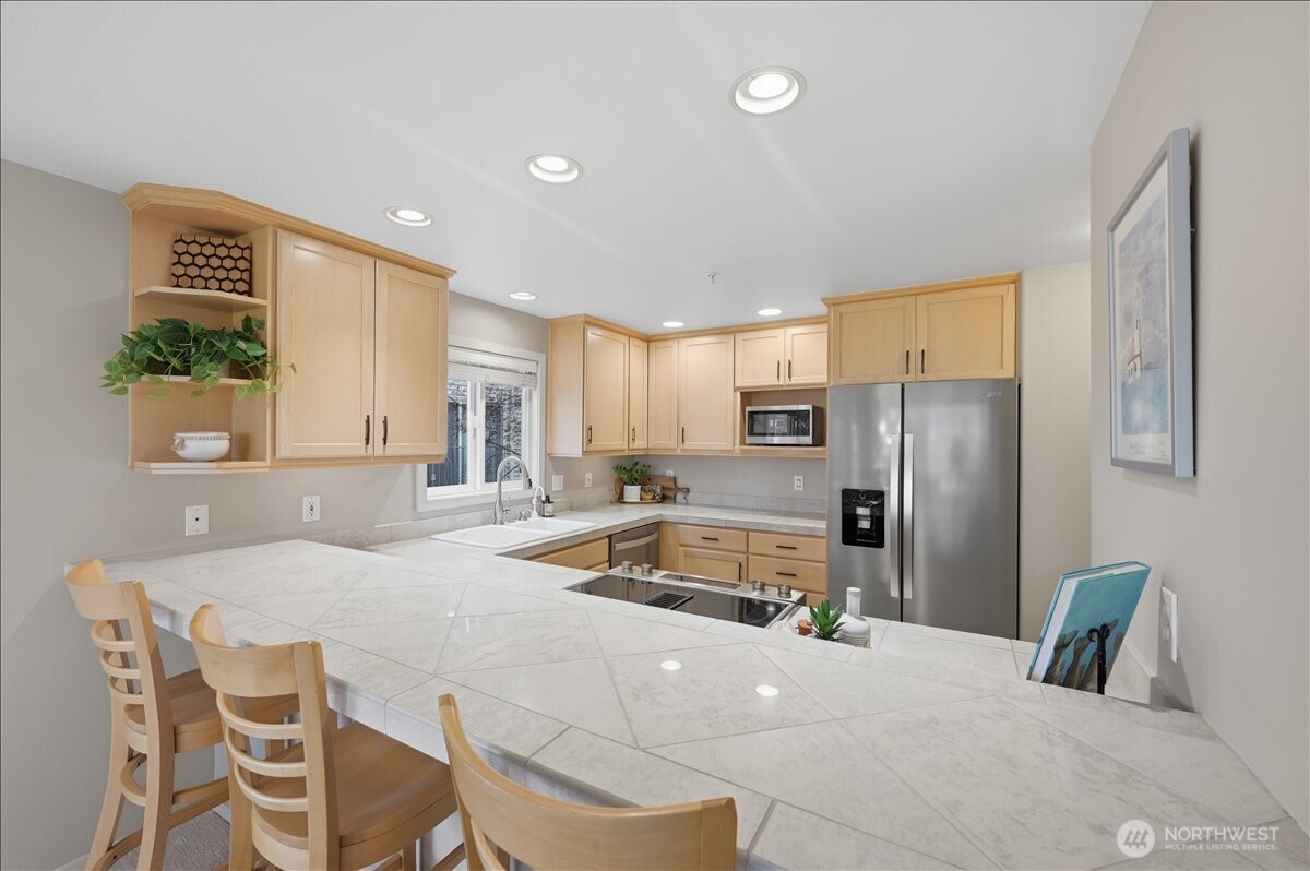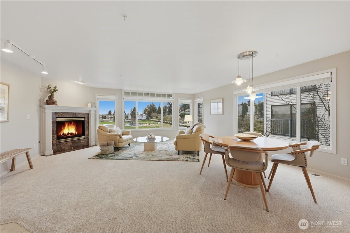 Light-filled condo with stunning views in the heart of the Edmonds Bowl! Expansive living room windows flood the space with natural light and showcase peaceful views of Civic Playfield, Puget Sound, and the Olympic Mountains - creating a bright, inviting feel you’ll love coming home to. The open living and dining area features a cozy gas fireplace and easy flow for everyday living or entertaining. This well-maintained 2-bedroom + bonus room home offers a functional layout, including a spacious primary suite with oversized closet and private ¾ bath, plus a second bedroom and full bath for guests. The kitchen includes a new refrigerator and dishwasher, ample storage, pantry, and a breakfast bar that connects to the main living space. A dedicated bonus room on main level provides flexible space for a home office, hobbies, or extra storage - rare and valuable for condo living! Located in a boutique building just moments from downtown Edmonds shops, dining, theater, and ferry access. Elevator access, secure garage parking + additional outdoor parking space, and low-maintenance living make this an easy choice. Enjoy nearby Civic Center Playfield, walking paths, pickleball, and community events - everything Edmonds living has to offer right outside your door.
