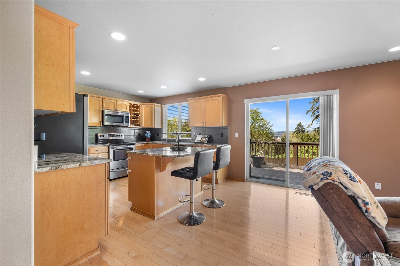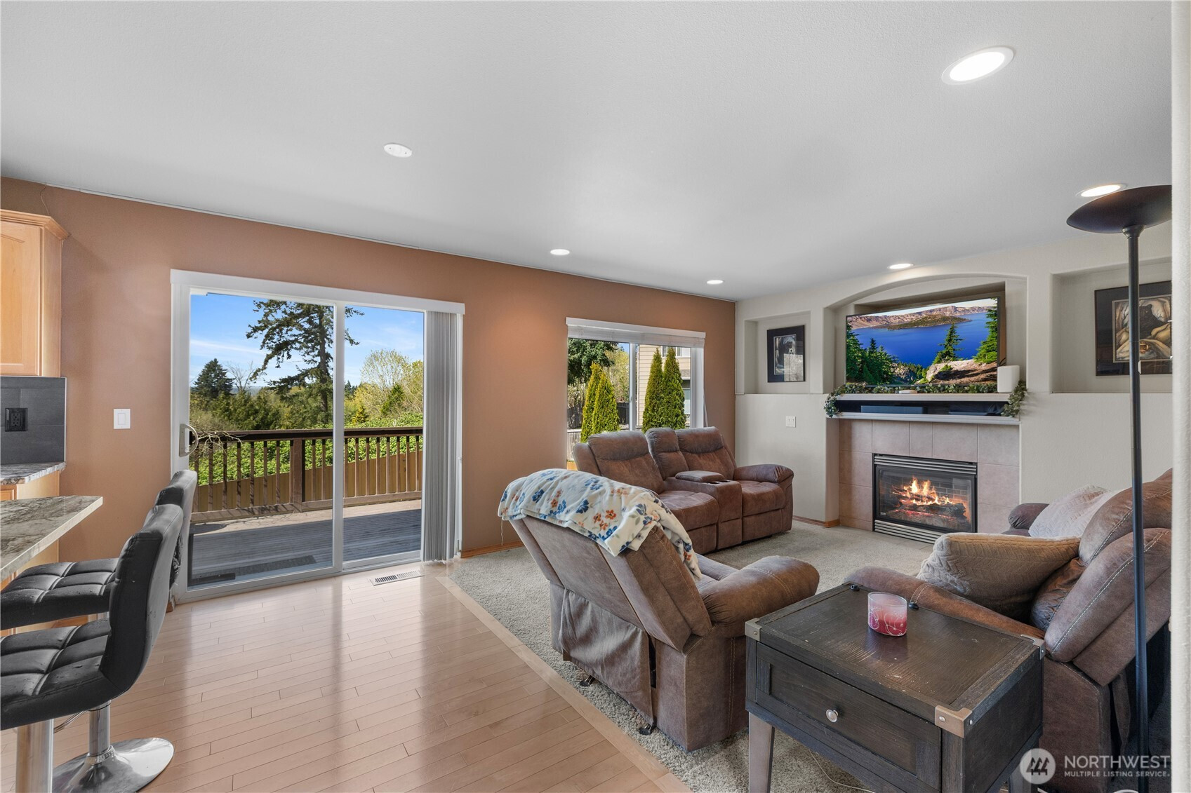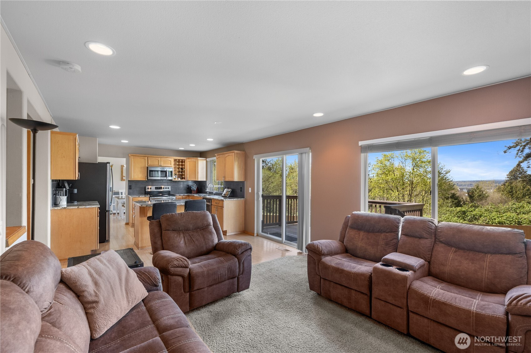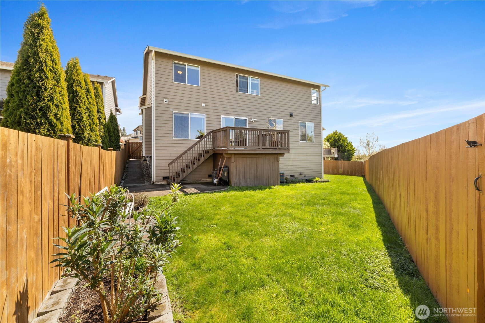 Well-maintained home capturing beautiful sunset views. Inside, hardwood floors, architectural details, and A/C enhance the comfort and style throughout. The kitchen features granite countertops, stainless steel appliances, a wine rack, eating bar, and pantry. The living room offers vaulted ceilings and a cozy fireplace, while French doors open to a spacious primary suite with a 5-piece bath, granite counters, soaking tub, and walk-in closet. A view deck overlooks the fenced, private yard with under-deck storage, no homes behind, and 10 raised garden beds. With trails just beyond the property, a quiet cul-de-sac setting, a long driveway, and close proximity to Lake Stevens and downtown Marysville amenities, this home offers exceptional privacy and convenience.
