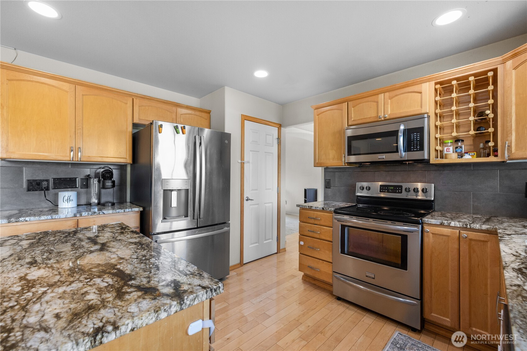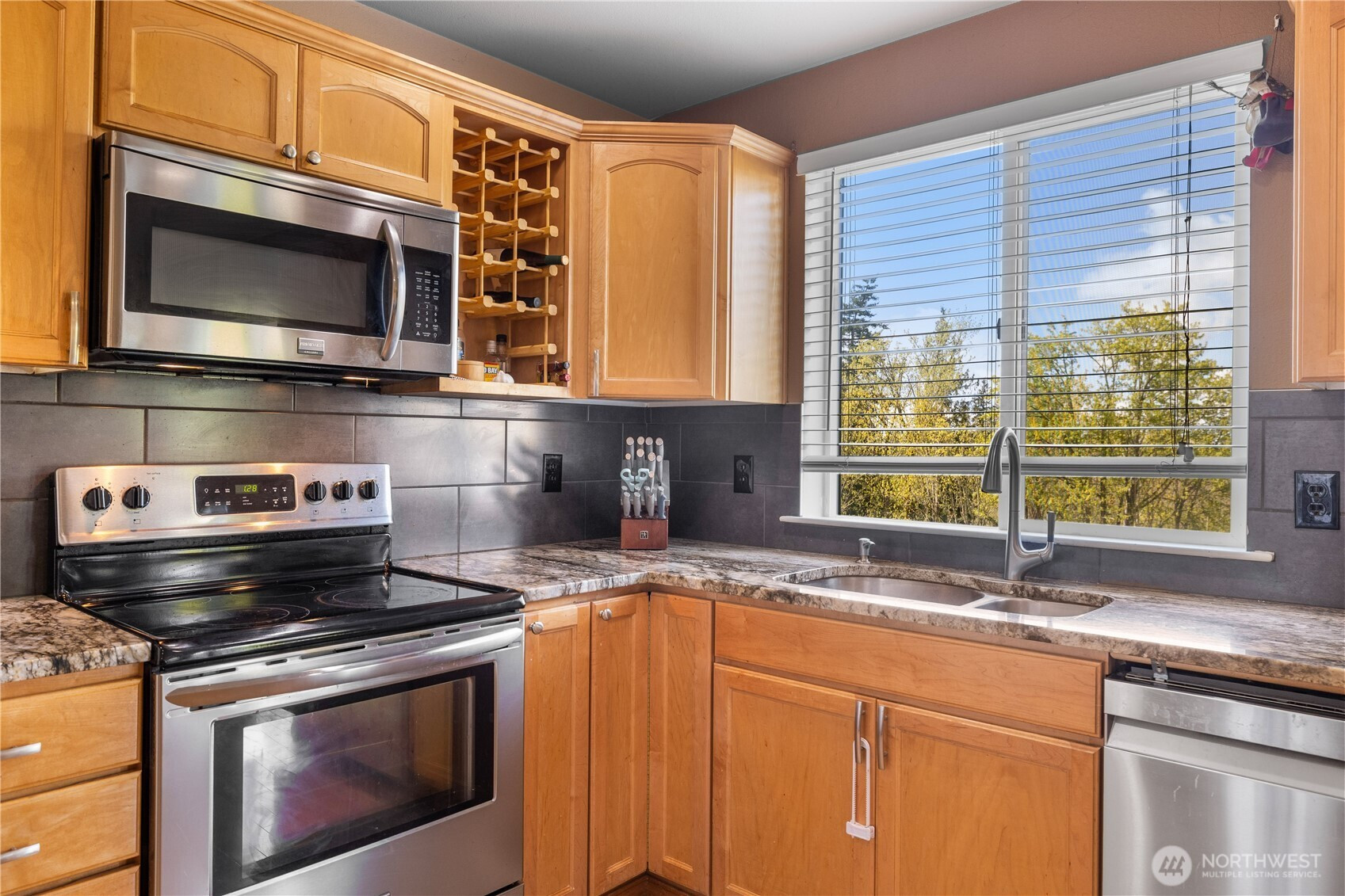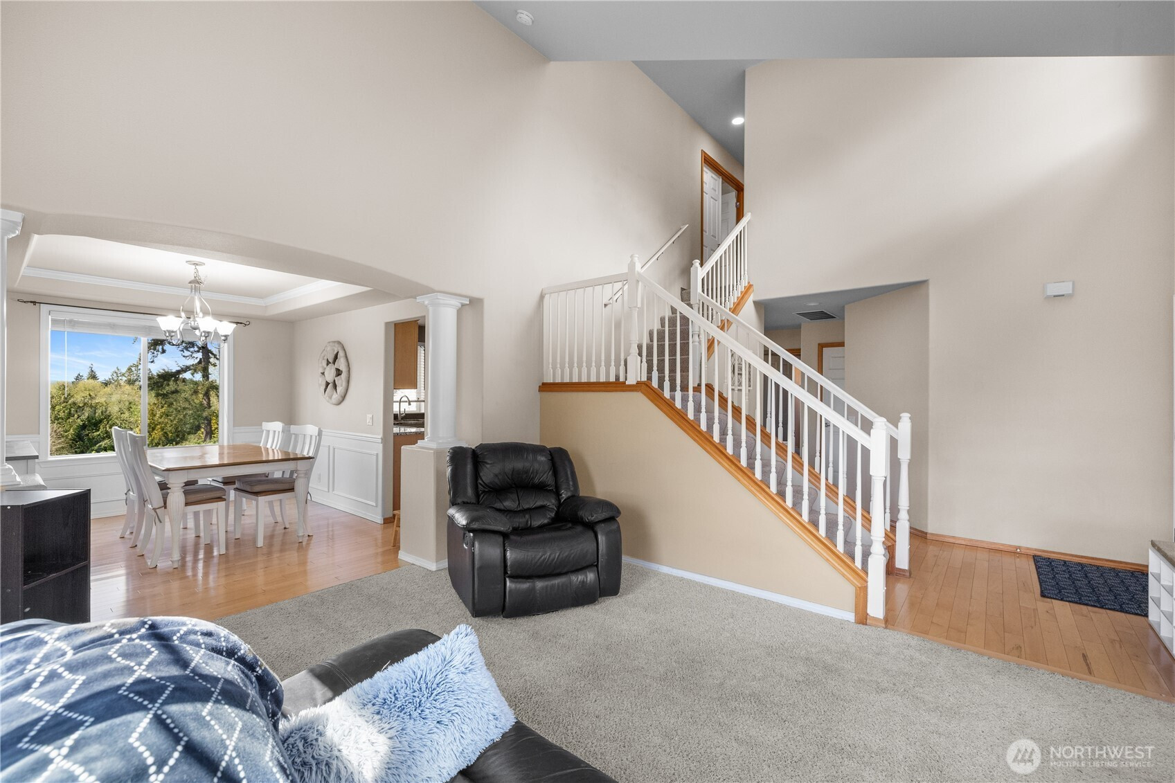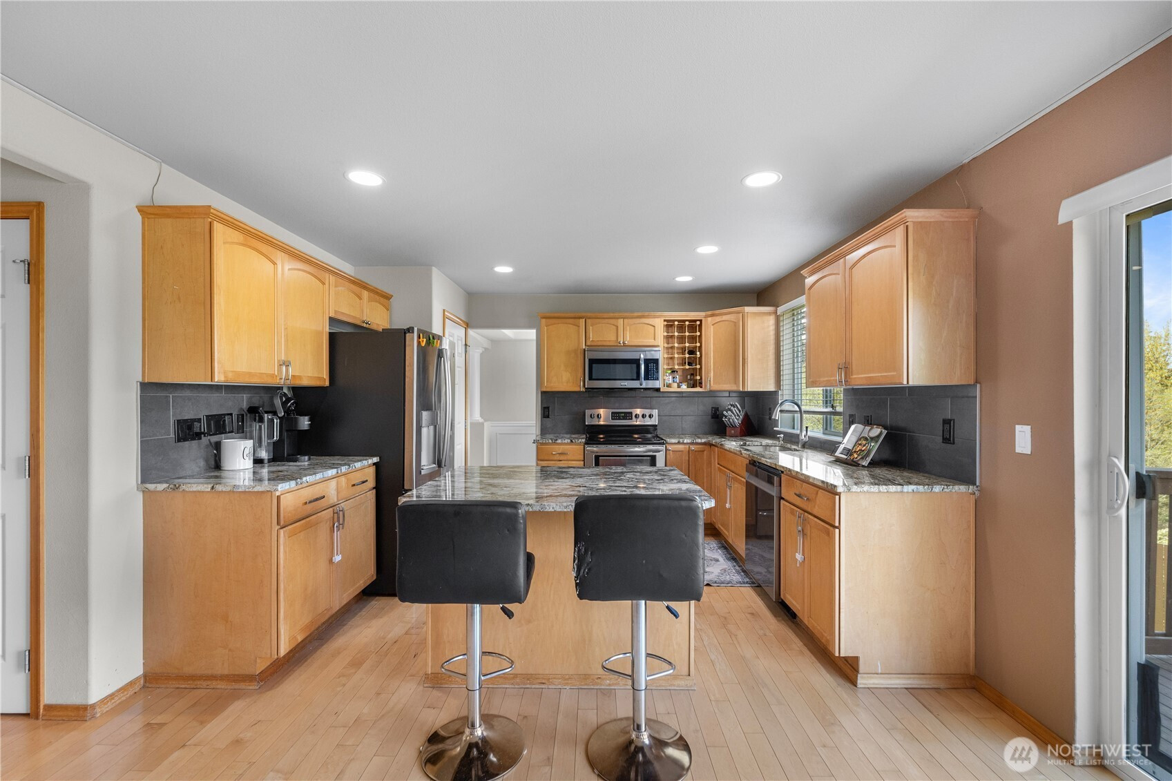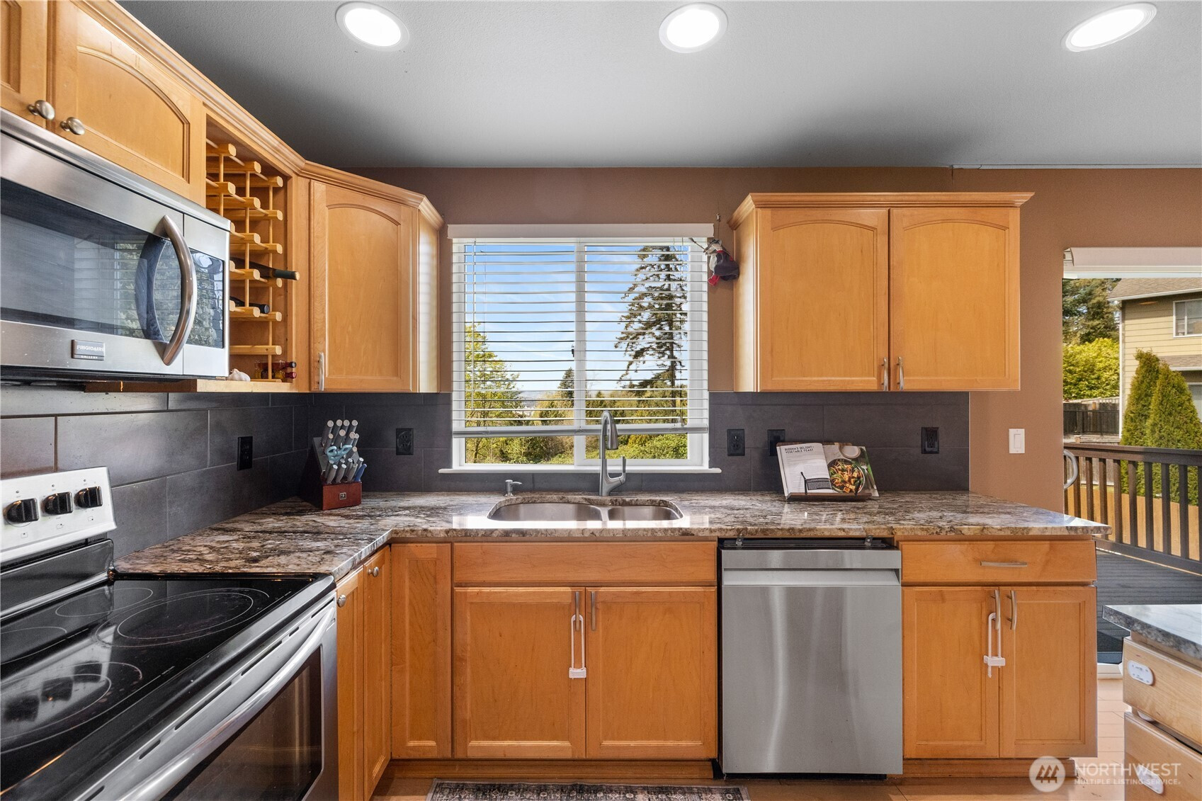 Well-maintained home capturing beautiful sunset views. Inside, hardwood floors, architectural details, and A/C enhance the comfort and style throughout. The kitchen features granite countertops, stainless steel appliances, a wine rack, eating bar, and pantry. The living room offers vaulted ceilings and a cozy fireplace, while French doors open to a spacious primary suite with a 5-piece bath, granite counters, soaking tub, and walk-in closet. A view deck overlooks the fenced, private yard with under-deck storage, no homes behind, and 10 raised garden beds. With trails just beyond the property, a quiet cul-de-sac setting, a long driveway, and close proximity to Lake Stevens and downtown Marysville amenities, this home offers exceptional privacy and convenience.