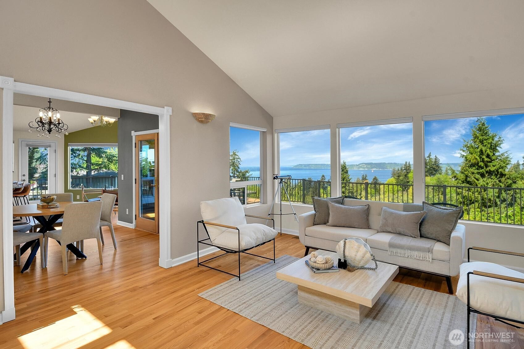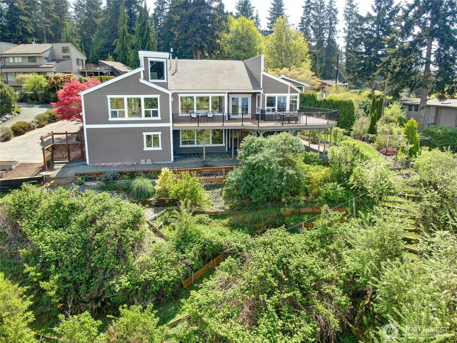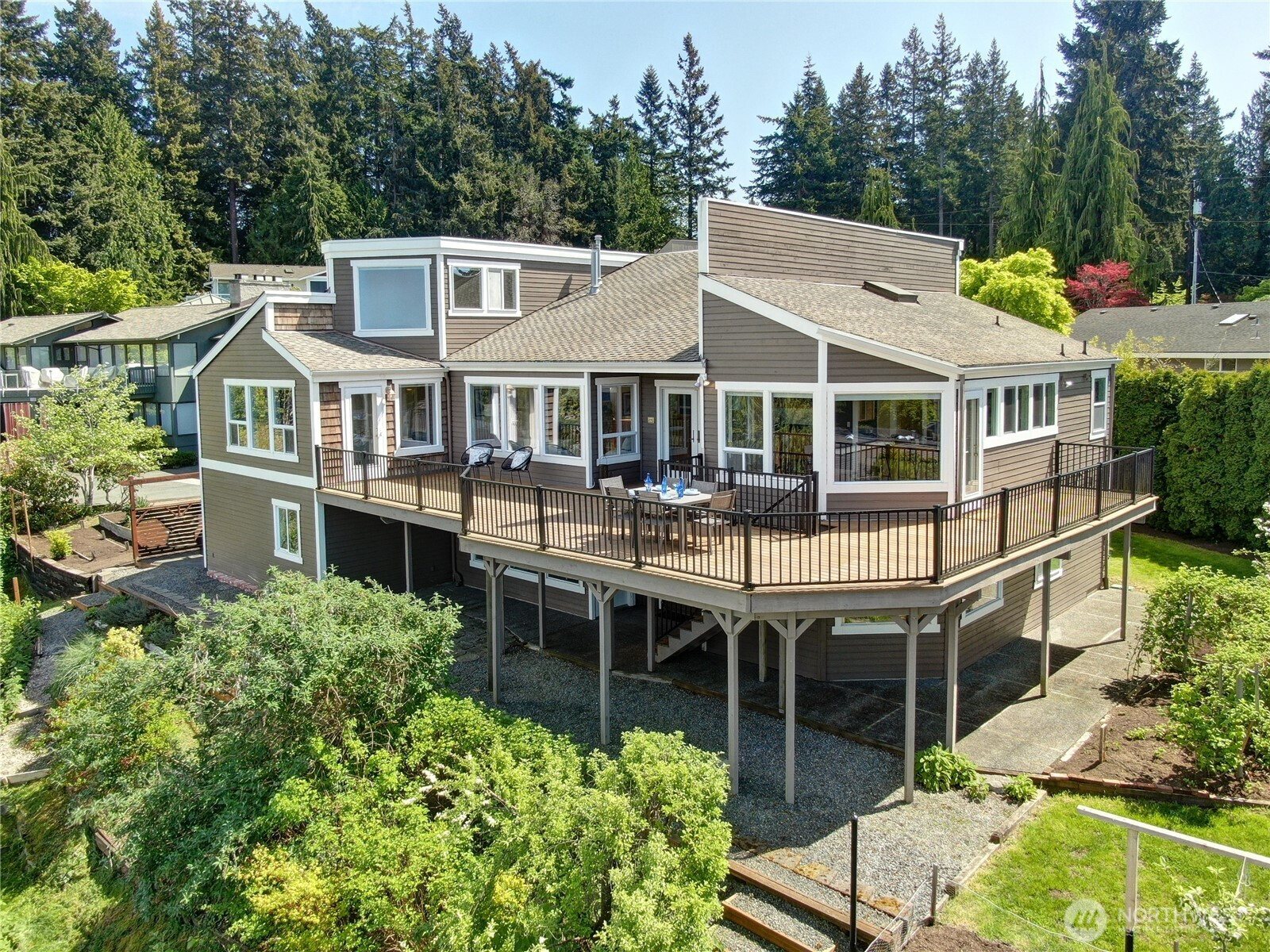 Enjoy panoramic views of Puget Sound and the Olympic Mountains in a private, natural setting that overlooks Meadowdale Beach Park towards Whidbey Island. Gleaming hardwood floors, vaulted ceilings and walls of view-oriented windows greet you as you enter this contemporary residence. The remodeled kitchen opens to formal and informal dining areas that flow out to a massive wrap-around composite deck, perfect for indoor/outdoor living and view enjoyment. Awake each day to amazing views from the primary suite that features elevated ceilings, a door out to the deck, a walk-in closet and 5-piece bathroom with heated tile floors. Bonus loft space can be accessed from two of the three main level bedrooms. A convenient pantry and utility room is located just off the kitchen providing extra storage and work space. The finished lower level of the home includes a family room, bonus area, 4th bedroom and 3/4 bathroom. Views are also enjoyed from the lower level which opens out to the back yard and into the 3-car garage with two separate workshop areas. Landscaped grounds wrap around the home and feature raised garden beds, lawn spaces, and terracing down to a greenbelt that provides great privacy. Great location near local schools, parks, and an easy drive into downtown Edmonds. Watch eagles soar and monitor the summer cruise ship activity while enjoying amazing sunsets from this spectacular setting. Welcome home!