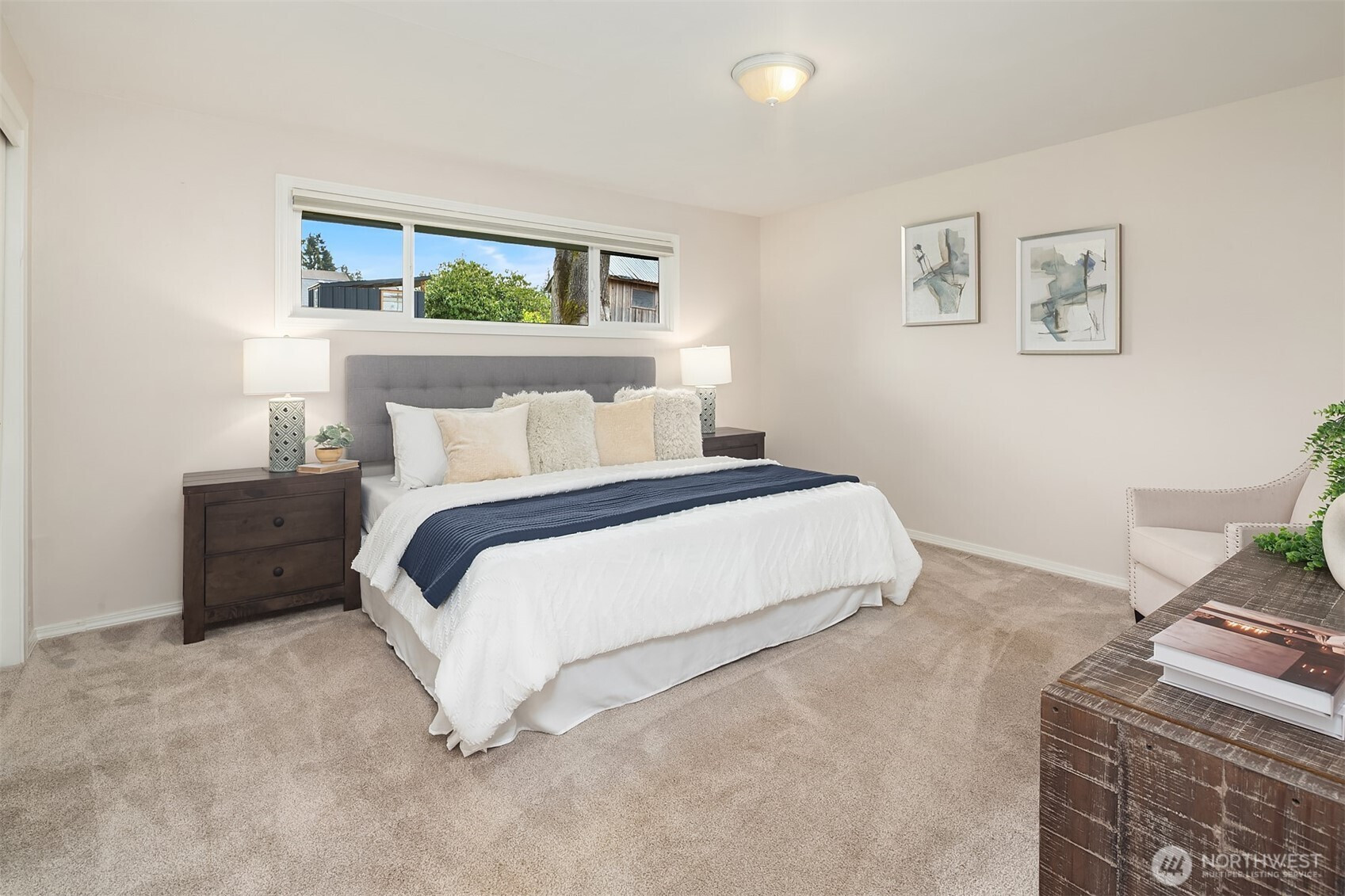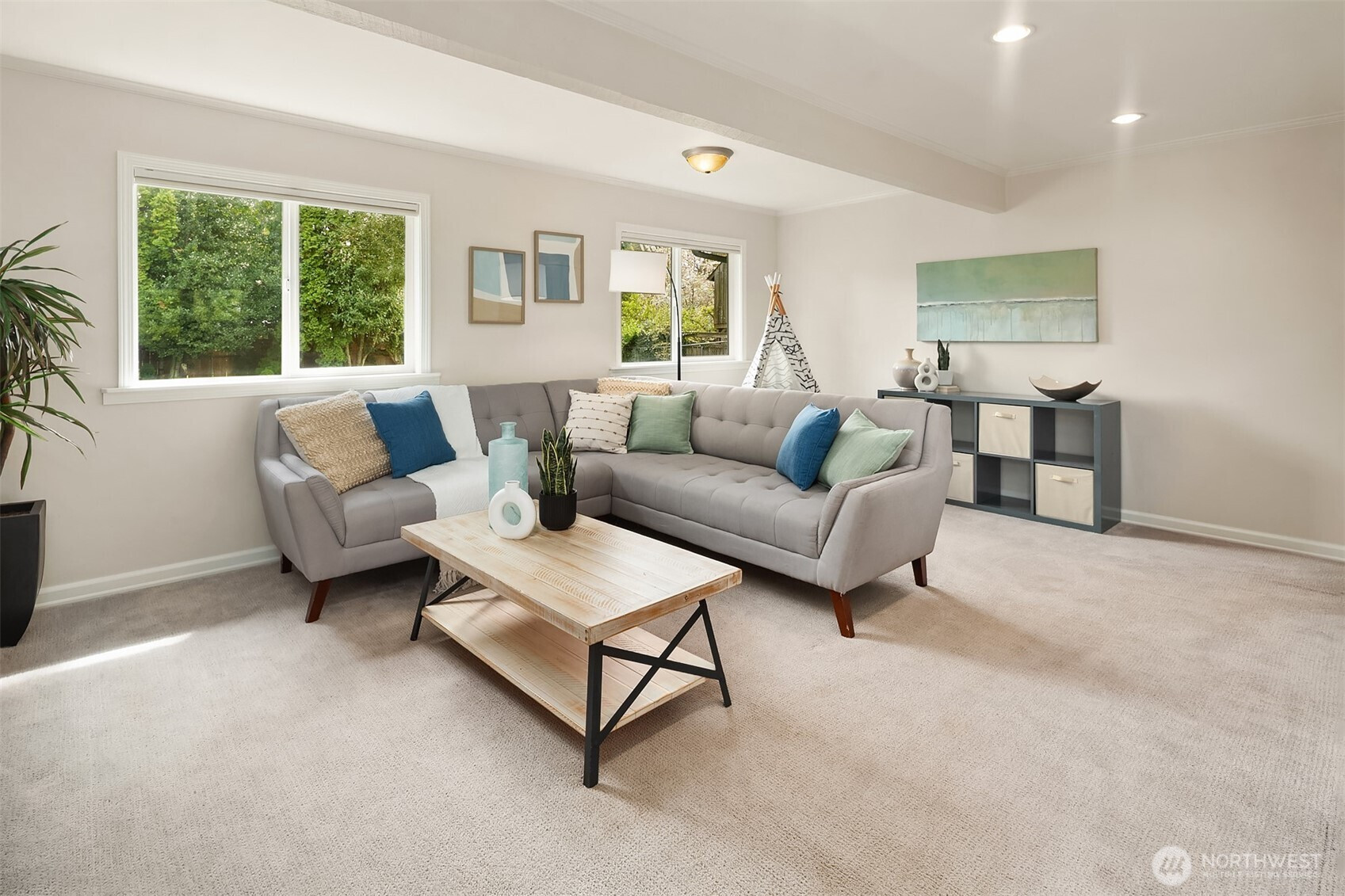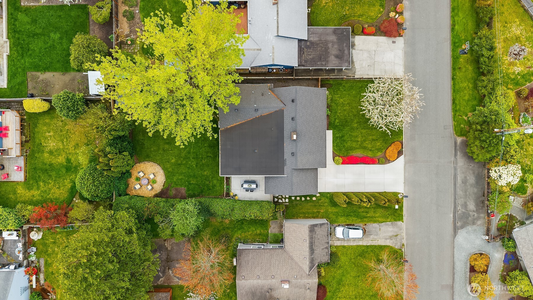 Located in the highly sought-after View Ridge neighborhood, this inviting one-level home offers comfort, character, and functionality. The level, fully fenced yard is beautifully maintained and offers ample space to enjoy, garden, play, or entertain. The front entry welcomes you to a spacious living and dining room with hardwood floors, custom built-ins, and a statement fireplace. The open kitchen features an island with seating, abundant cabinetry and pantry space, an eating area, and a built-in buffet with desk space for added flexibility. The spacious primary suite includes dual closets and room for a sitting area. The remodeled bath showcases classic wainscoting and an updated vanity, while new windows fill the home with beautiful natural light. Electrical panel has been upgraded to support EV-to-home capability, allowing compatible electric vehicles to supply backup power in the event of a power outage. Enjoy easy access to Howarth Park and Forest Park, along with a backyard patio perfect for entertaining in this walkable neighborhood with sweeping sound views.
