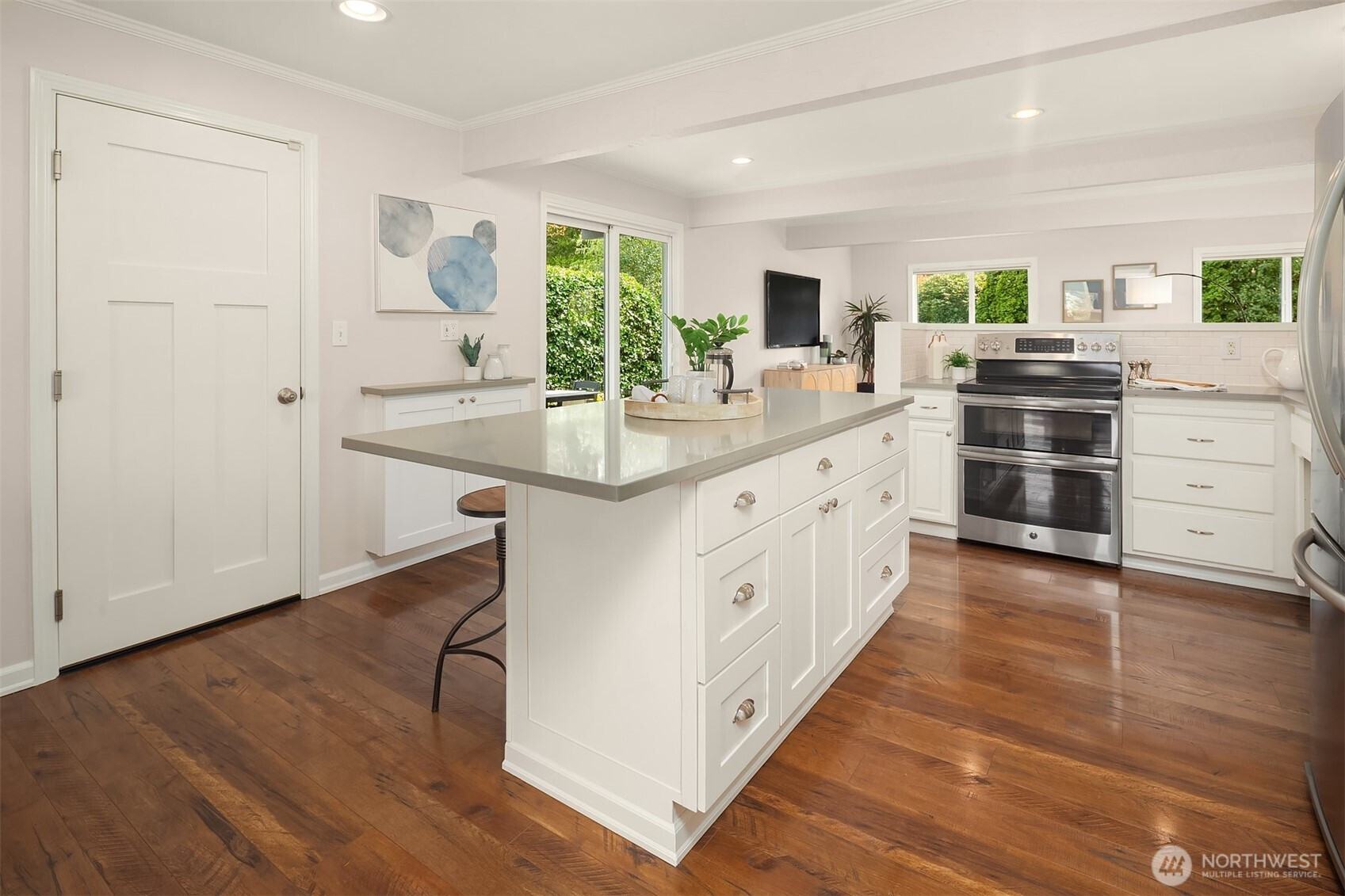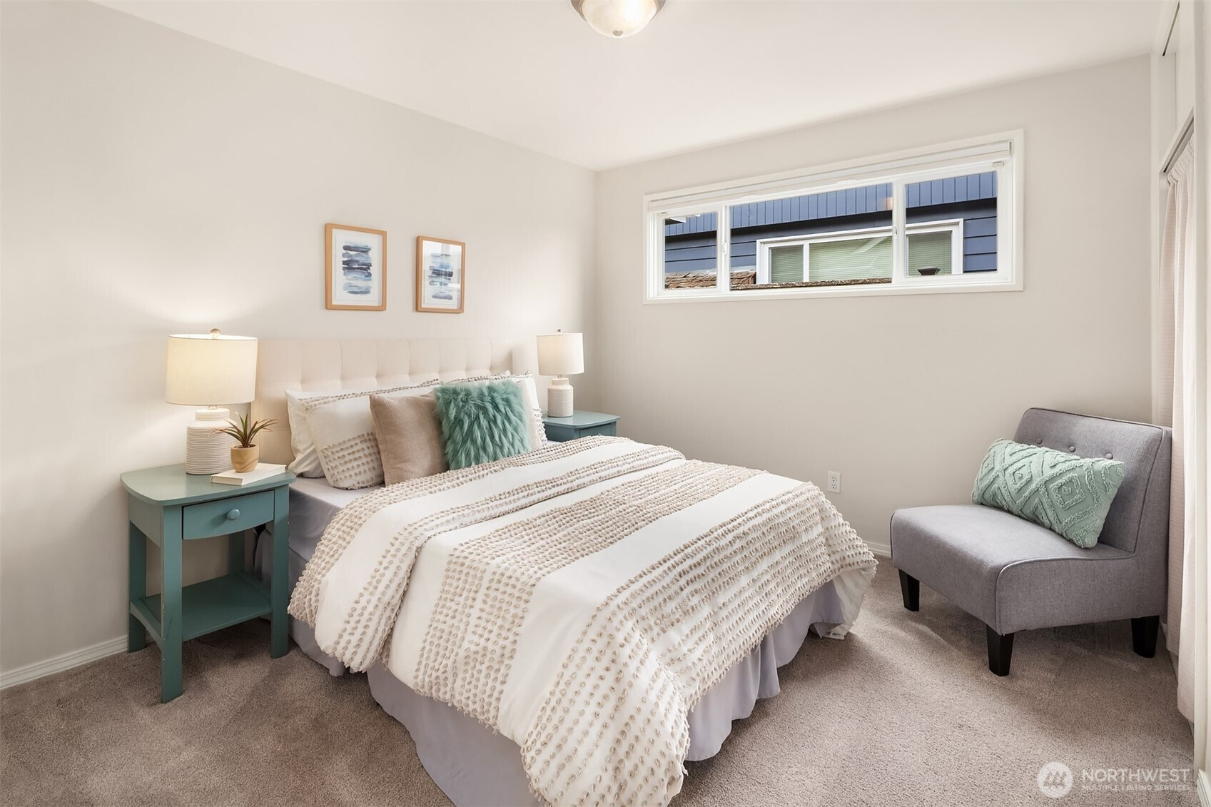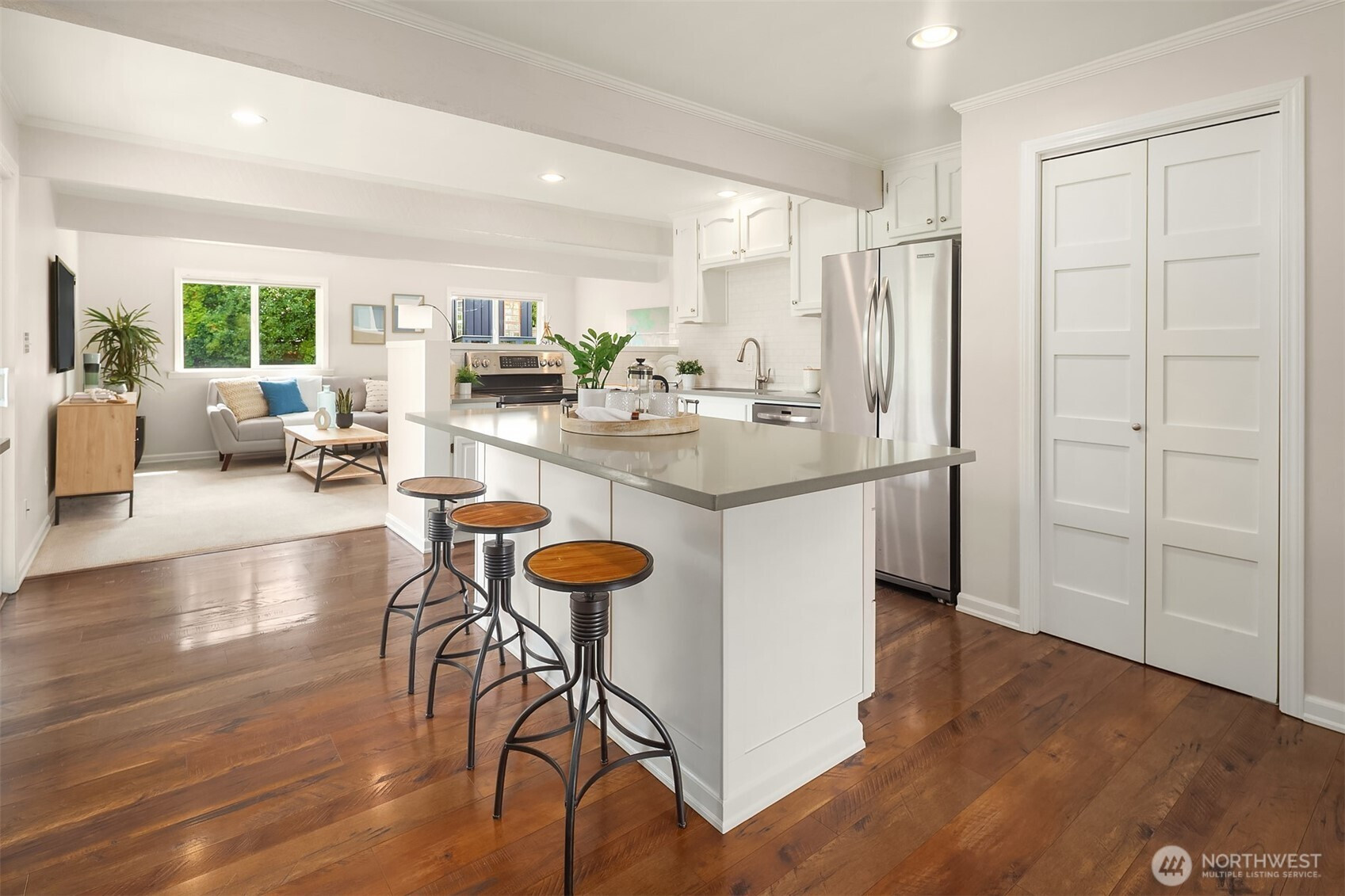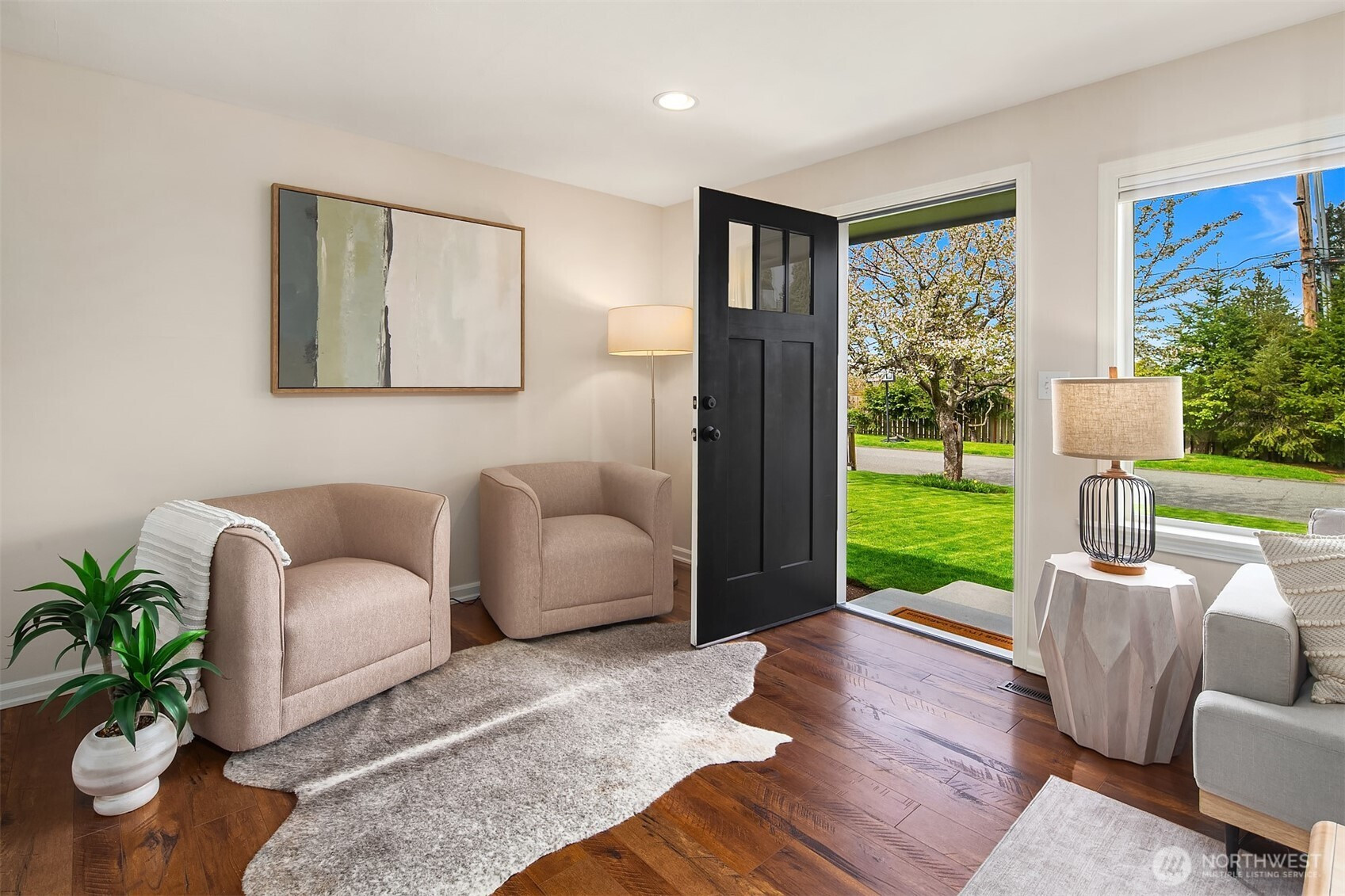 Located in the highly sought-after View Ridge neighborhood, this inviting one-level home offers comfort, character, and functionality. The level, fully fenced yard is beautifully maintained and offers ample space to enjoy, garden, play, or entertain. The front entry welcomes you to a spacious living and dining room with hardwood floors, custom built-ins, and a statement fireplace. The open kitchen features an island with seating, abundant cabinetry and pantry space, an eating area, and a built-in buffet with desk space for added flexibility. The spacious primary suite includes dual closets and room for a sitting area. The remodeled bath showcases classic wainscoting and an updated vanity, while new windows fill the home with beautiful natural light. Electrical panel has been upgraded to support EV-to-home capability, allowing compatible electric vehicles to supply backup power in the event of a power outage. Enjoy easy access to Howarth Park and Forest Park, along with a backyard patio perfect for entertaining in this walkable neighborhood with sweeping sound views.