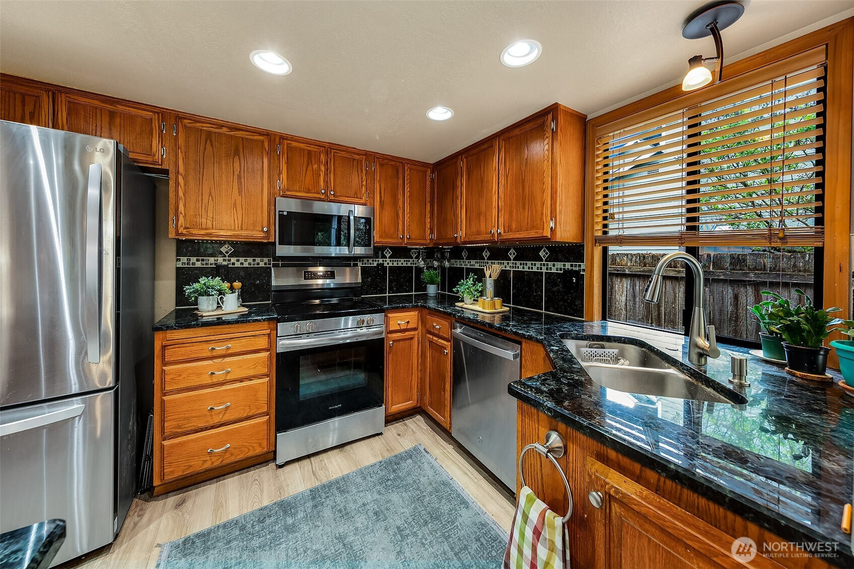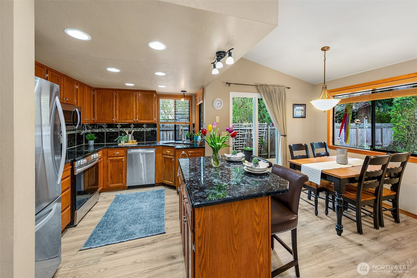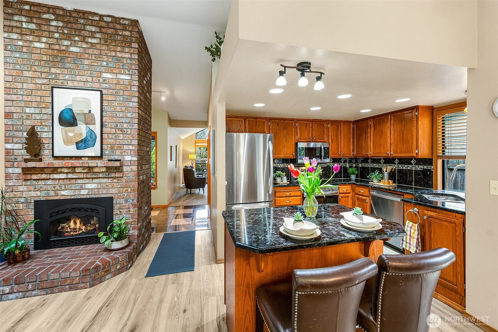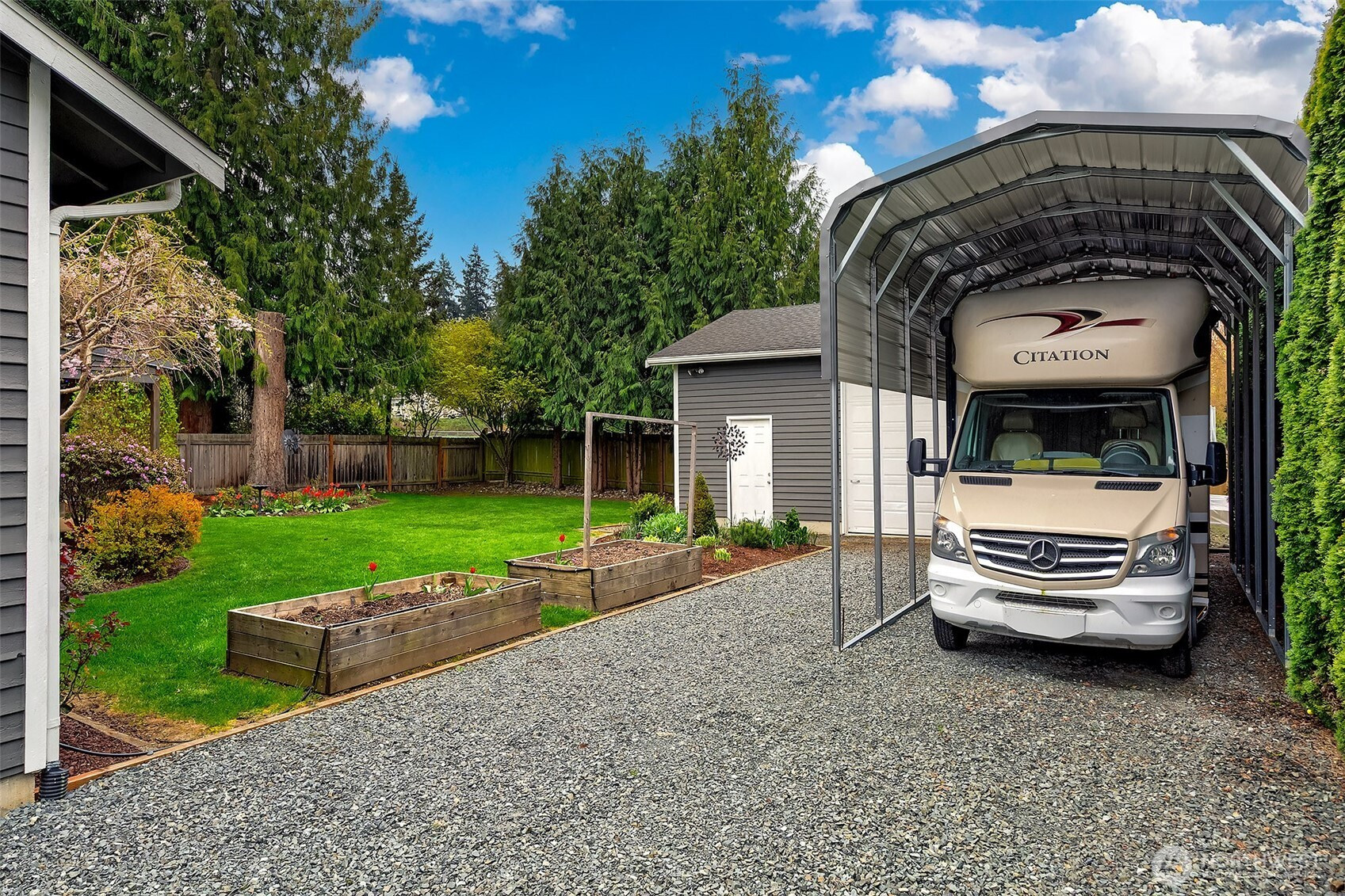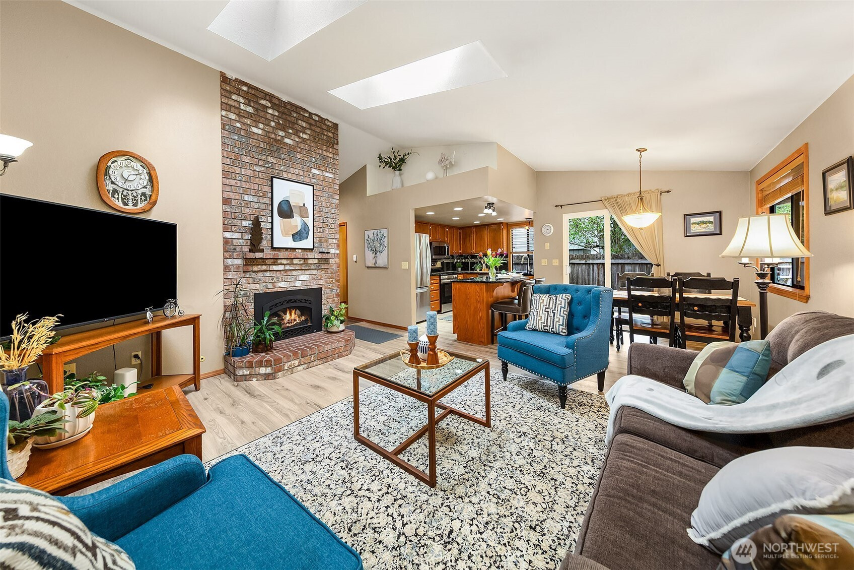 Discover your perfect retreat in this exquisite and rare Marysville Rambler! Immaculate 3-bed, 2-bath home spanning 1,800 sq ft offers a harmonious blend of style and comfort. Bright living room and family room with gas fireplace, formal dining, and newer LVP flooring complement vaulted ceilings and skylights. Generous kitchen with granite counters, eating bar and ample storage. Enjoy central A/C and gas heat. Unwind in the private, fully fenced backyard featuring mature landscaping and a large, covered composite deck, ideal for year-round BBQs! And all this backs up to Northpointe Park! Enter through the side rolling drive gate to find a dream shop built in 1997, complete with 10' ceilings and gas heater. Secure covered RV/boat parking awaits. Just minutes to I-5, shopping and more. No HOA!