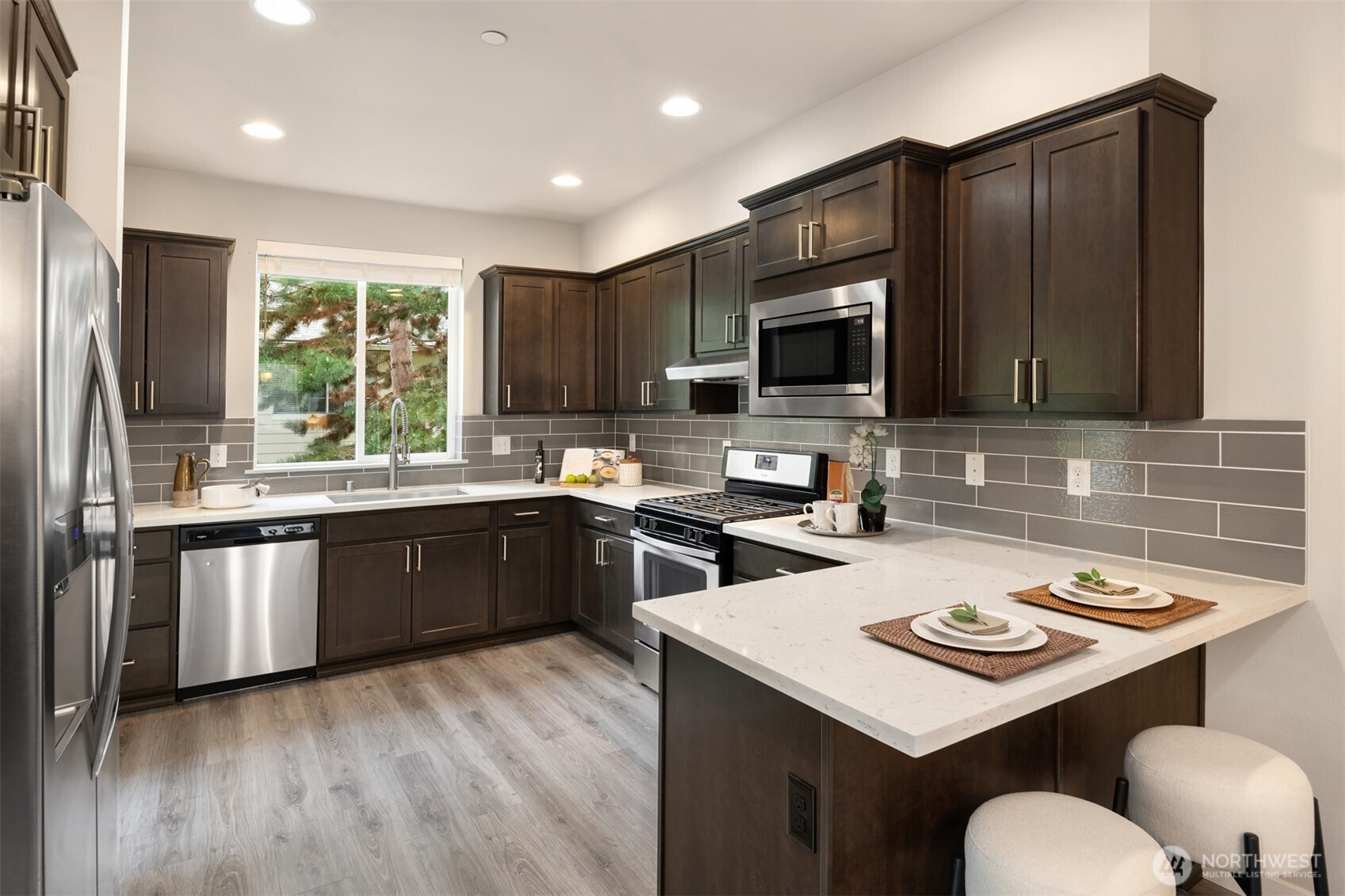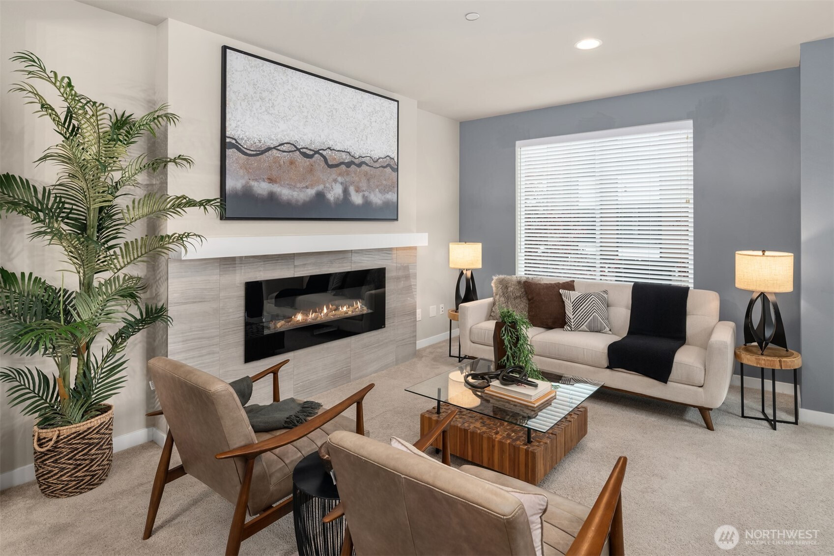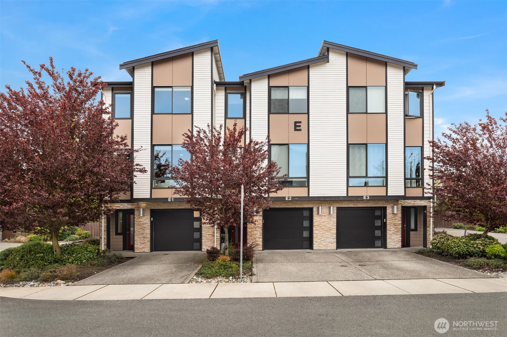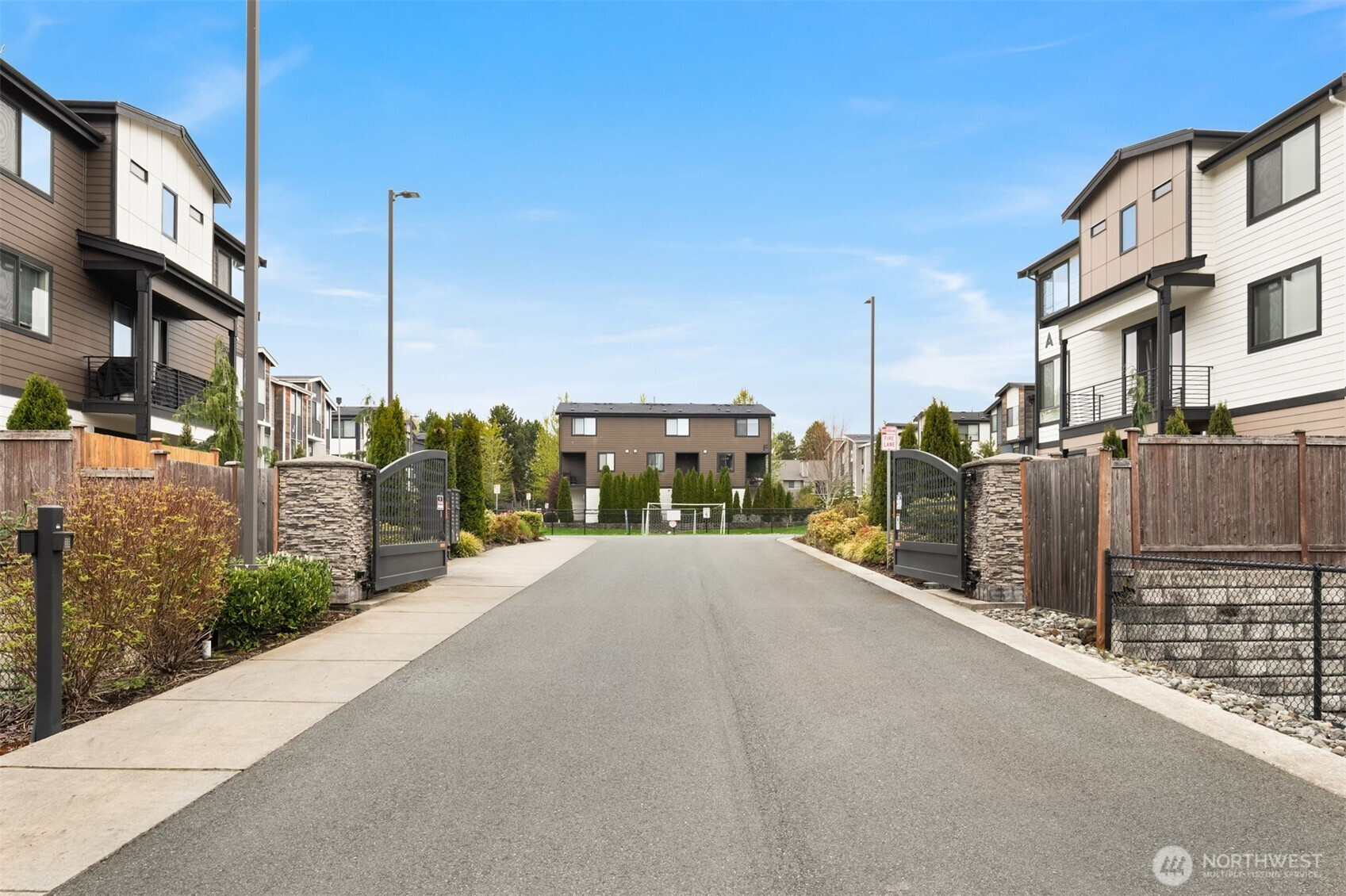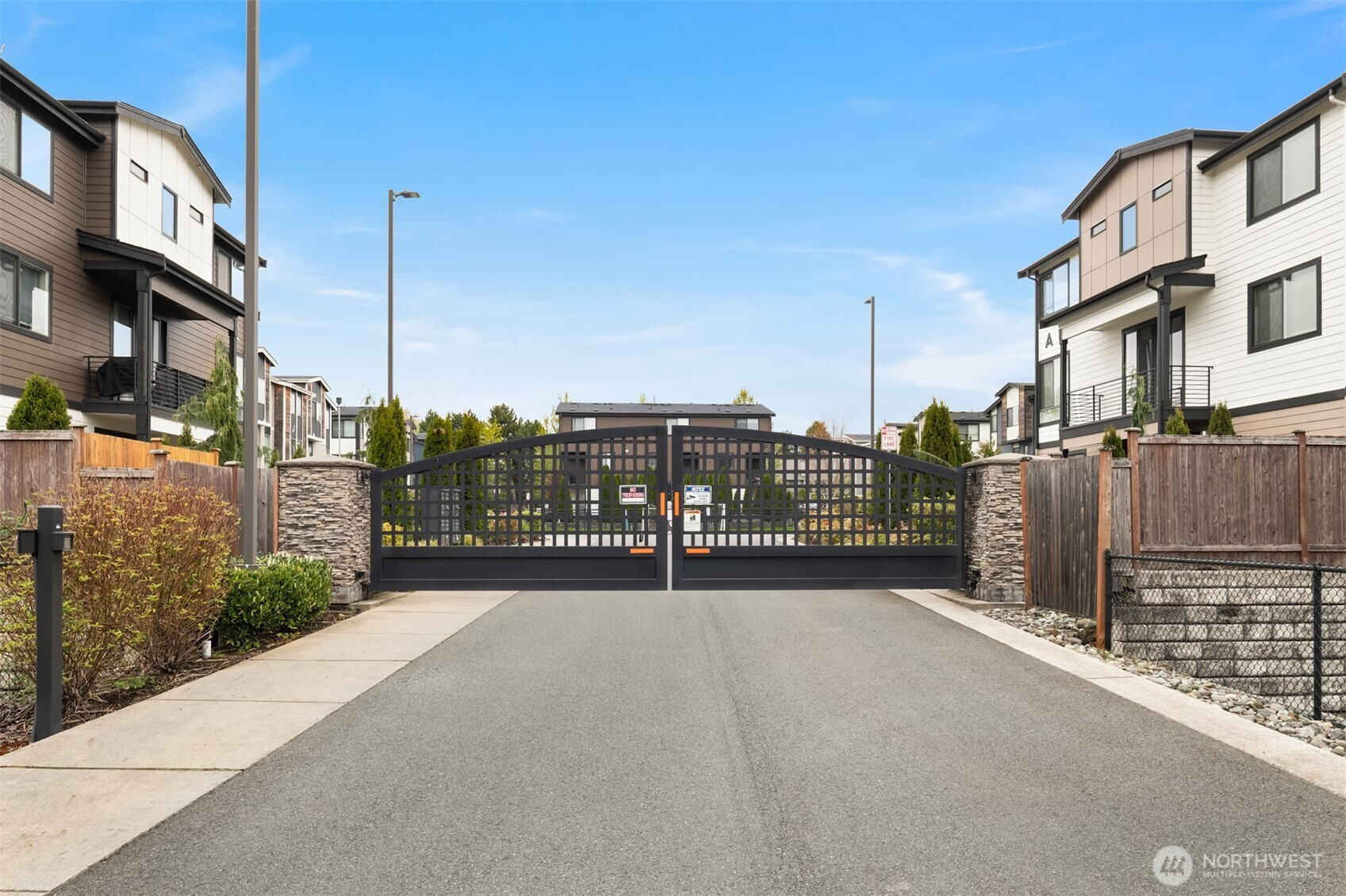 Securely tucked away in a sought-after gated community, this luxurious 2019 end-unit townhome is a move-in ready masterpiece boasting impressive curb appeal & stunning modern finishes with a sprawling 2-car garage, driveway & super low HOA dues! Lavishly appointed 1,548sf, 3 bed, 2.5 bath design features a desirable open concept layout with tall ceilings, oversized windows & horizontal open rail staircases throughout. Light-filled living room with captivating linear fireplace opens spacious formal dining & high-end dream kitchen with rich solid wood cabinetry, gorgeous quartz counters, full-height tiled backsplash, gas range, stainless steel appliances, peninsula bar & private covered balcony. The primary suite dazzles with generous walk-in closet & dramatic tiled bath with dual-sink quartz vanity & glass enclosed shower. Full-size utility room, abundant storage space, on-demand hot water & efficient A/C. Covered patio + backyard space with upside potential. Attractive neighborhood with fenced-in playground, ample guest parking & no rental cap!